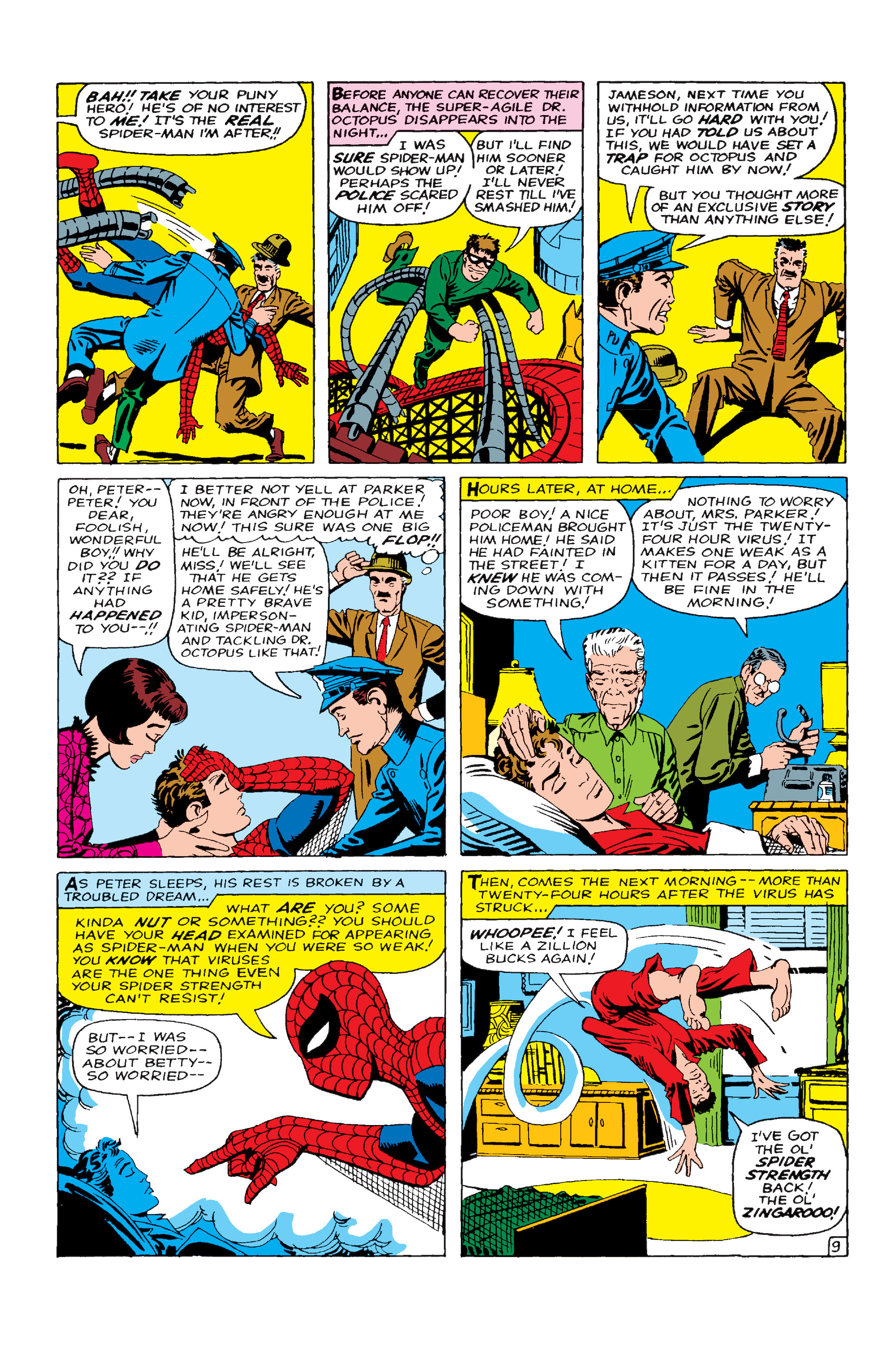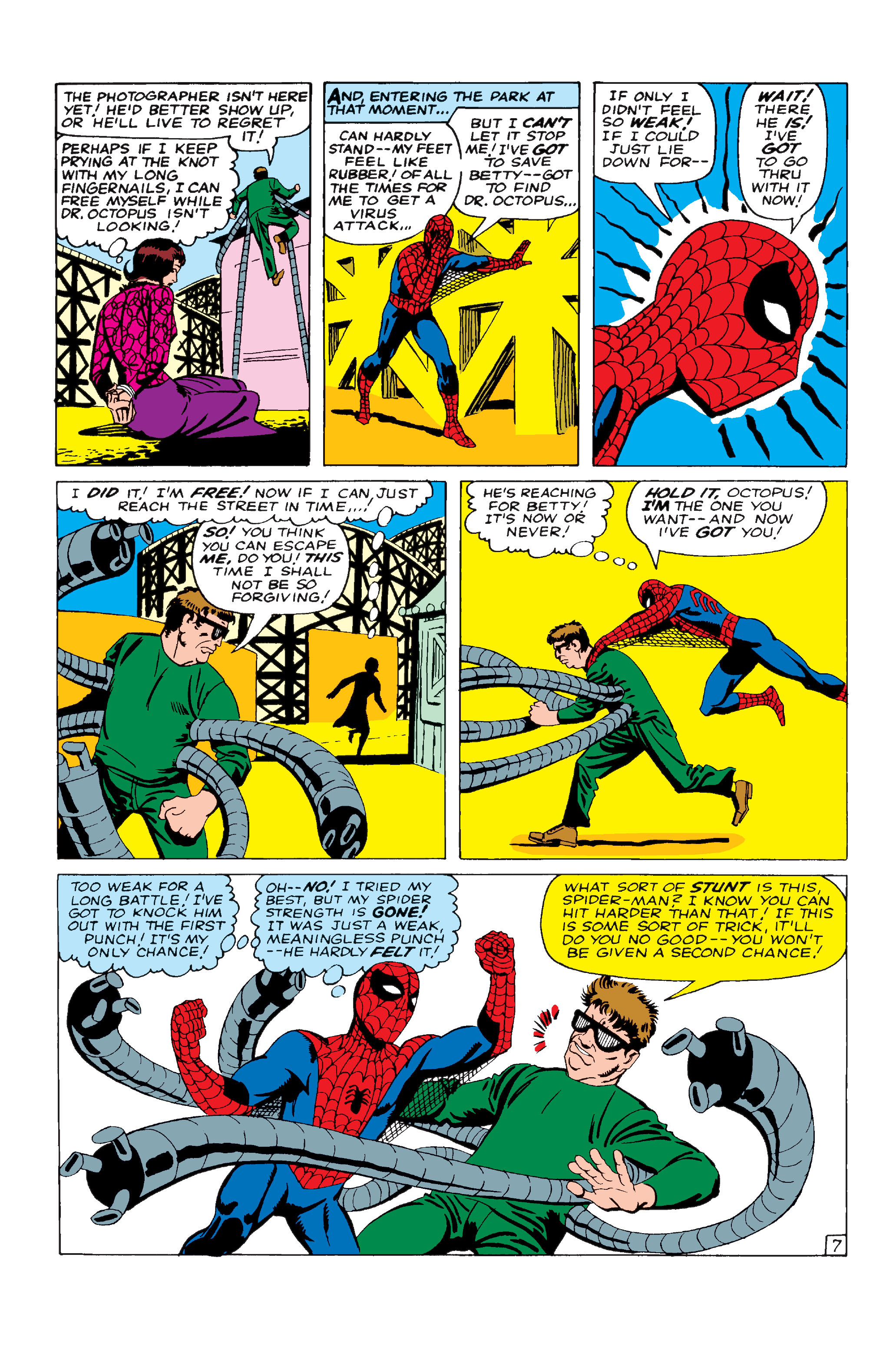 Most people who have vs debated Spidey are probably aware of the famous scene in "If this be my Destiny", one of the top 3 most famous plots in Spidey's history (along with his first appearence and Gwen Stacy's Death) where to save Aunt May, despite being trapped under the weight of a locomotive, Spidey gives everything he's got and manages to lift the weight. What's often missed about this scene is that Spidey was incredibly weak from being active non-stop for days. Before this, Doctor Octopus, who was a bit stronger then Spidey normally and characterized by extreme arrogance, thought there was no way to beat Spider-Man and fled for his life. A later comic implies that in the scene Spidey was not just lifting the weight of a locomotive, but in fact lifting the entire underwater facility they were in. A normal Spider-Man has numerous times harmed early Titania who is said to be able to lift locomotives in the same fight. Speaking of Doctor Octopus however, on another occasion Spider-Man was weakened from sickness and put on a power harness to compensate to fight Otto but when the harness ran out of power, he managed to win via sheer determination.