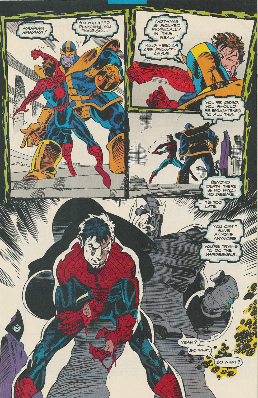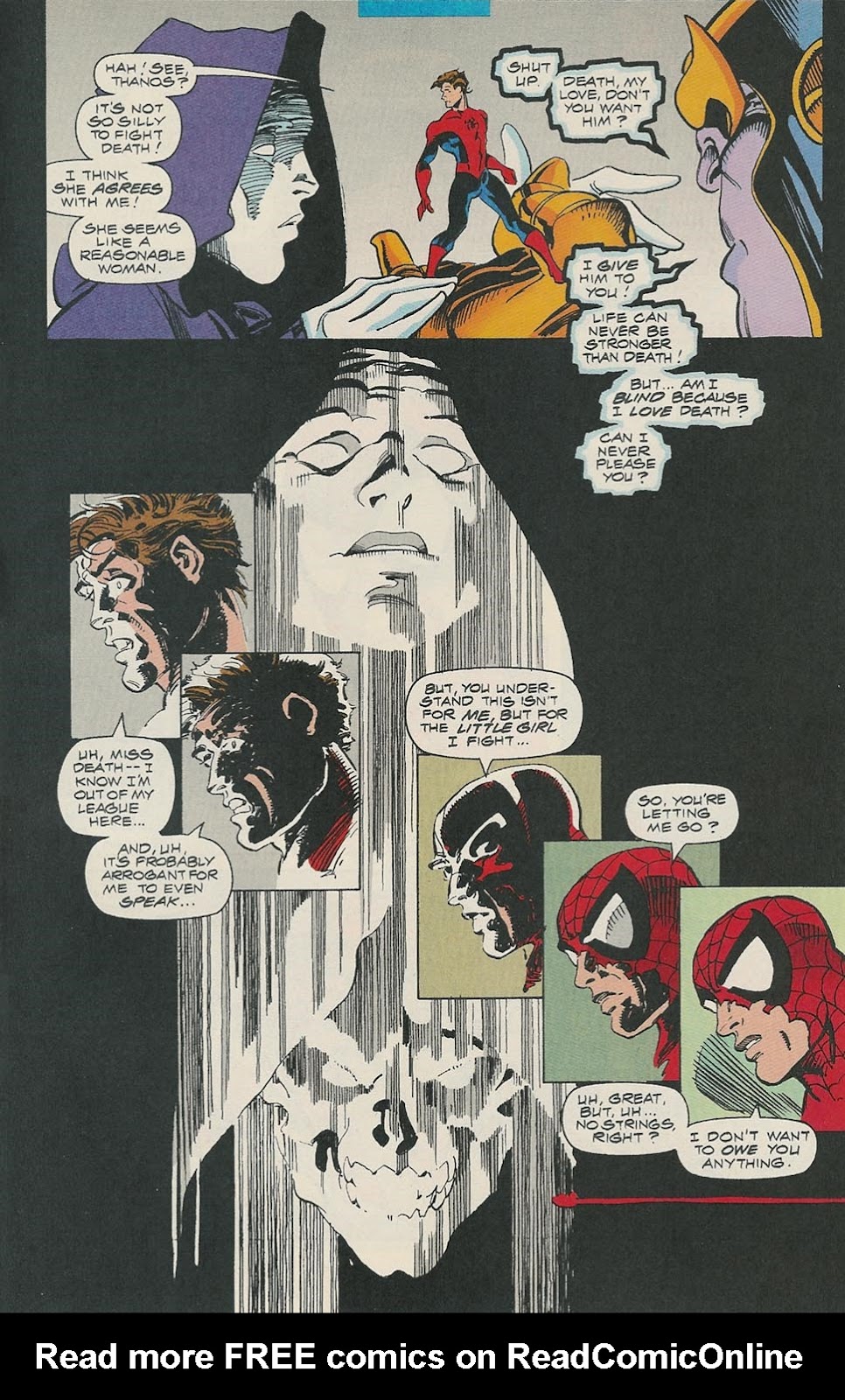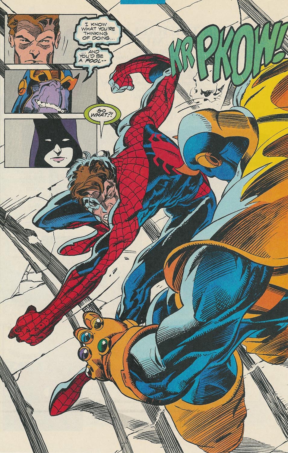 However Spider-Man's will feats don't stop there. What would you say if I told you that Spider-Man's will is actually one of the strongest forces in the Marvel Universe? During One More Day Spider-Man has his conciousness stretched to "everywhere and nowhere" and maybe that's hyperbole, but Spider-Man actually has 3 really insane cosmic willpower feats. In Spider-Man (1990) Issue 17: "No One Gets Outta Here Alive" Spider-Man is killed as is a little girl he was trying to protect. Spider-Man is taken to a place beyond death where there is neither will nor desire. Regardless his soul fights Thanos, not Thanos' soul but the actual Thanos, to try and reclaim the little girl's soul, actually seeming to cause an effect to Thanos' body, withstanding a blow from him and dodging an attack from him. While Spider-Man doesn't beat Thanos, Death herself is so impressed by Spider-Man's efforts that she restores both him and the girl.