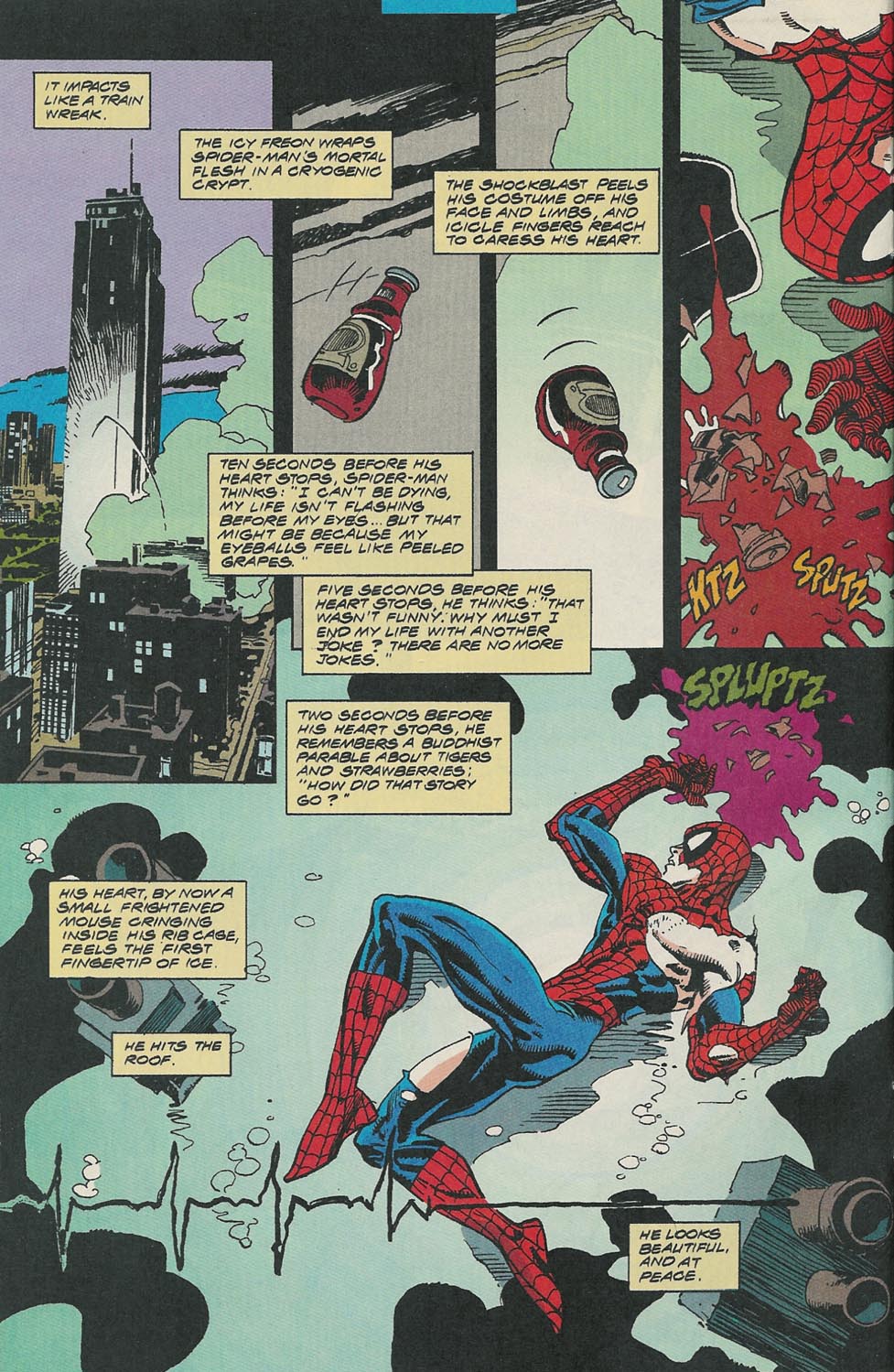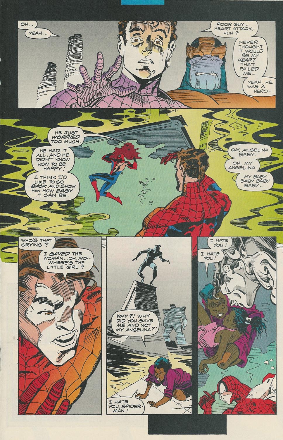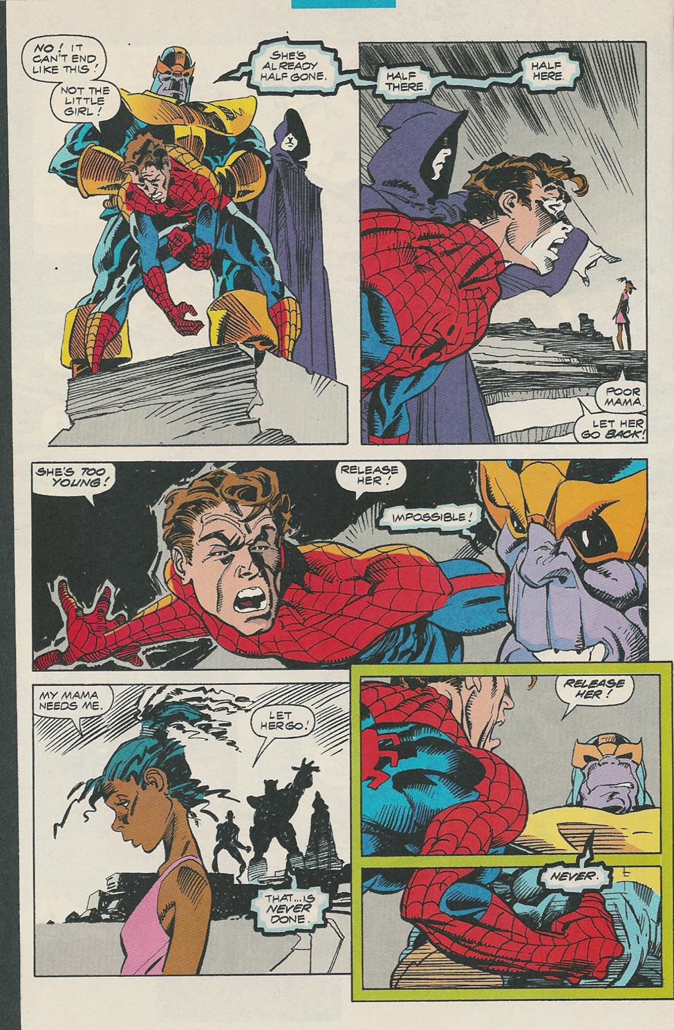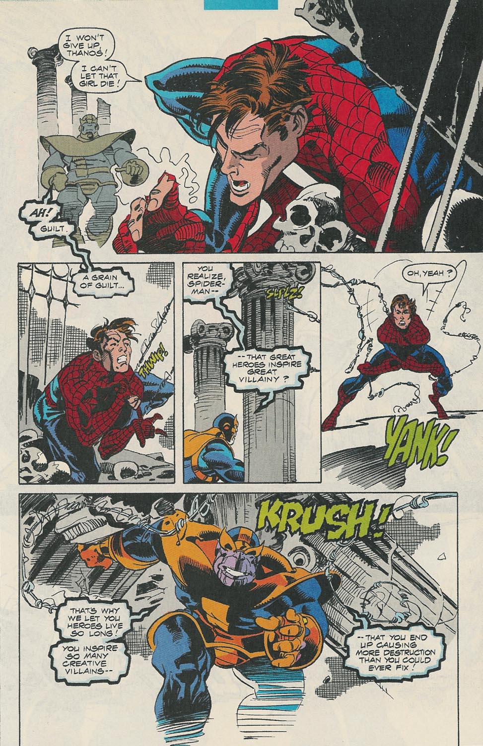 However Spider-Man's will feats don't stop there. What would you say if I told you that Spider-Man's will is actually one of the strongest forces in the Marvel Universe? During One More Day Spider-Man has his conciousness stretched to "everywhere and nowhere" and maybe that's hyperbole, but Spider-Man actually has 3 really insane cosmic willpower feats. In Spider-Man (1990) Issue 17: "No One Gets Outta Here Alive" Spider-Man is killed as is a little girl he was trying to protect. Spider-Man is taken to a place beyond death where there is neither will nor desire. Regardless his soul fights Thanos, not Thanos' soul but the actual Thanos, to try and reclaim the little girl's soul, actually seeming to cause an effect to Thanos' body, withstanding a blow from him and dodging an attack from him. While Spider-Man doesn't beat Thanos, Death herself is so impressed by Spider-Man's efforts that she restores both him and the girl.