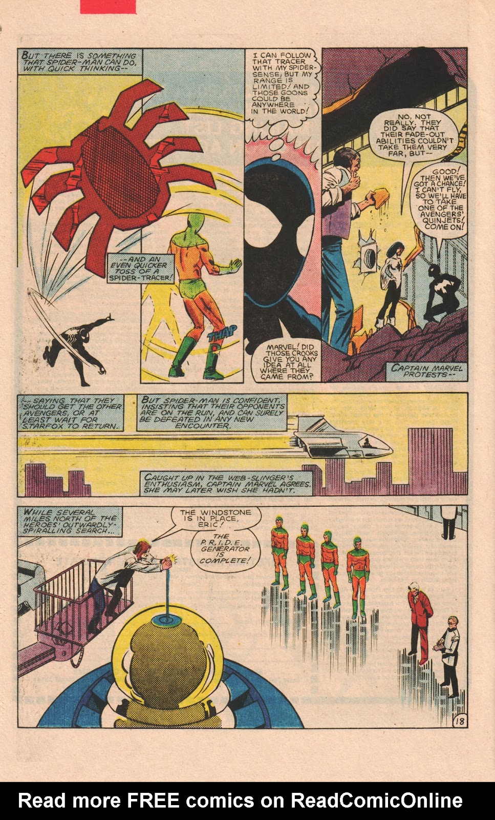 Spider-Man also kept up with the greatest speed of the original Captain Marvel though I can't find any notable speed feats for the original Captain Marvel outside of bullet-timing. That said, Peter also has scaling to Carol. He's dodged a barrage of attacks from her, disappeared from her sight, and blocked a melee attack from her during intense sparring. Carol scales to Rogue whom she took the powers of (which is consistent as Rogue shouldn't be massively faster the the other X-Men, who Spider-Man outsped numerous of earlier on) and Rogue traveled the Earth-Moon distance in a short time, likely seconds, which would get a speed above 1% the speed of light.