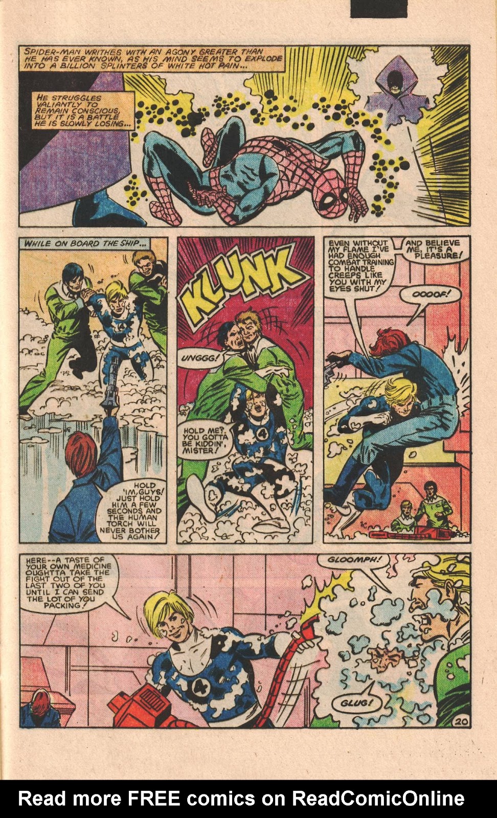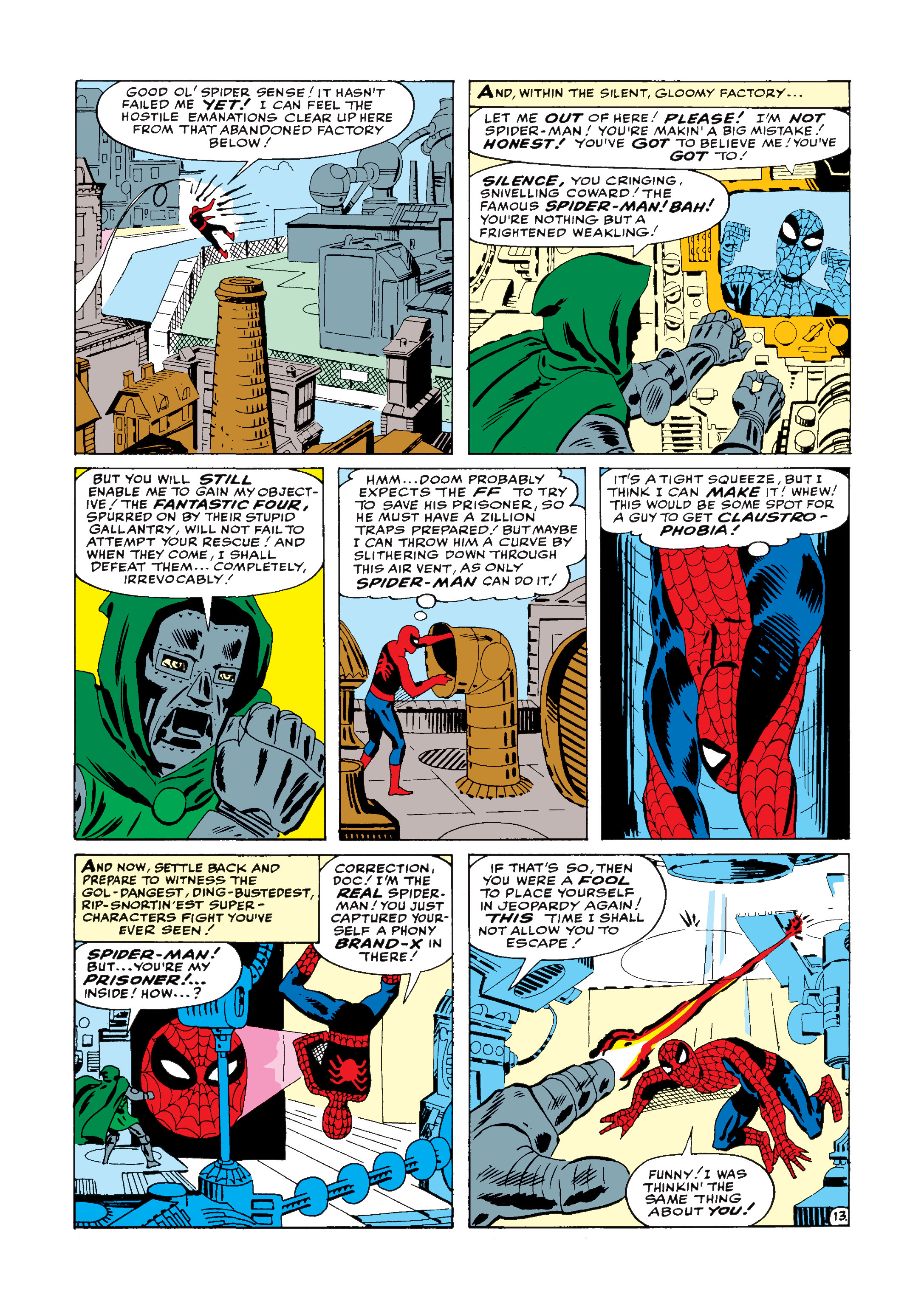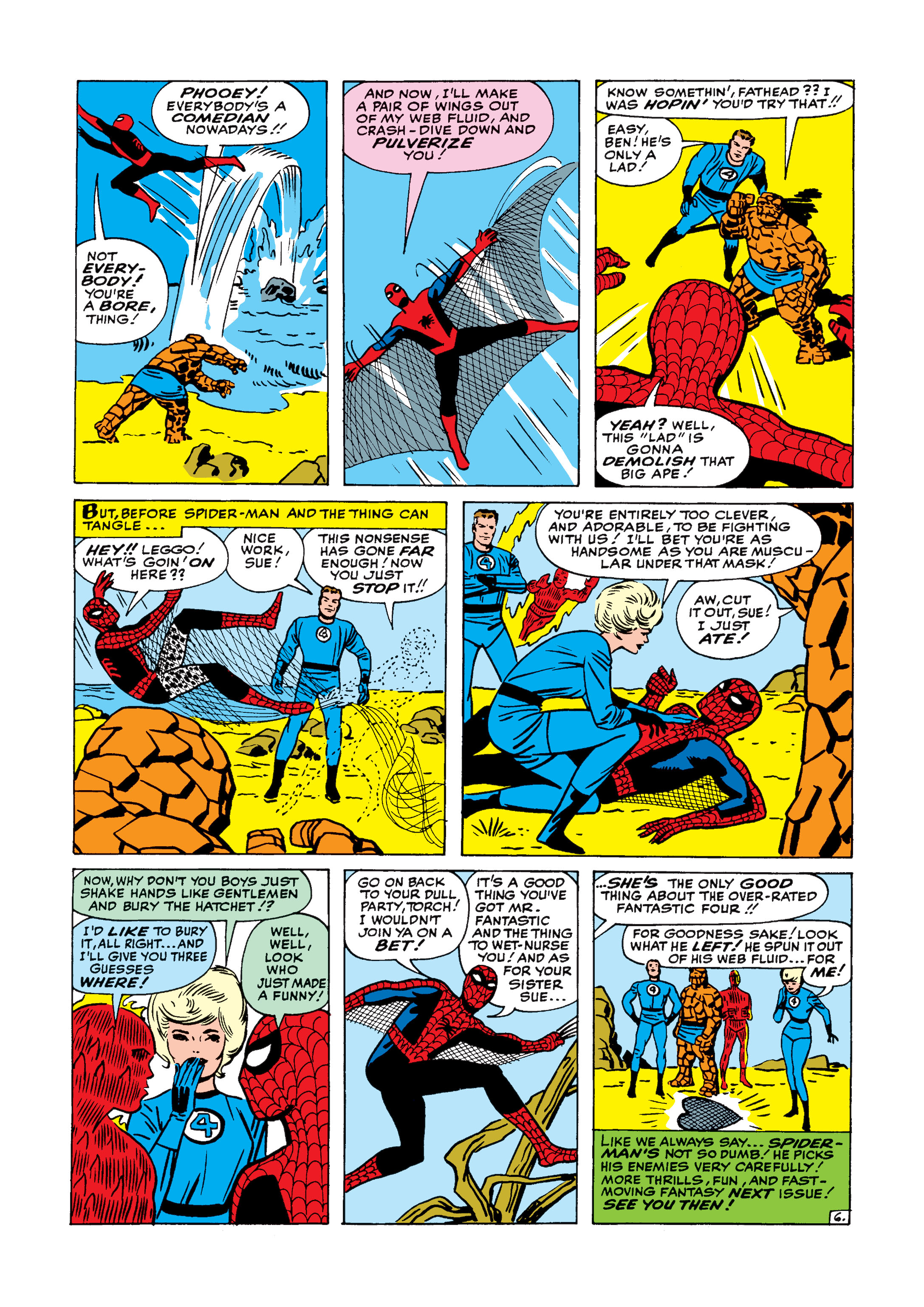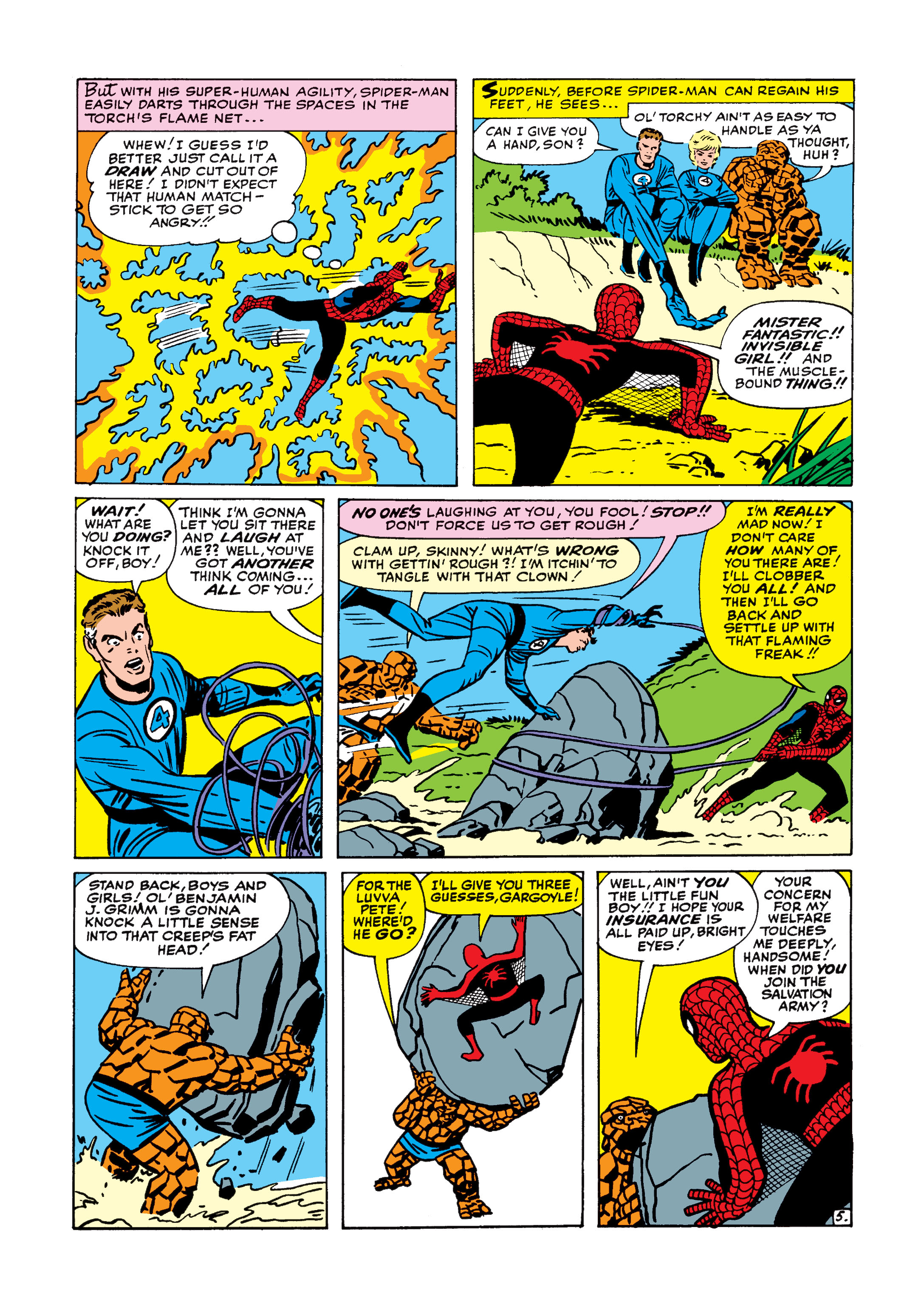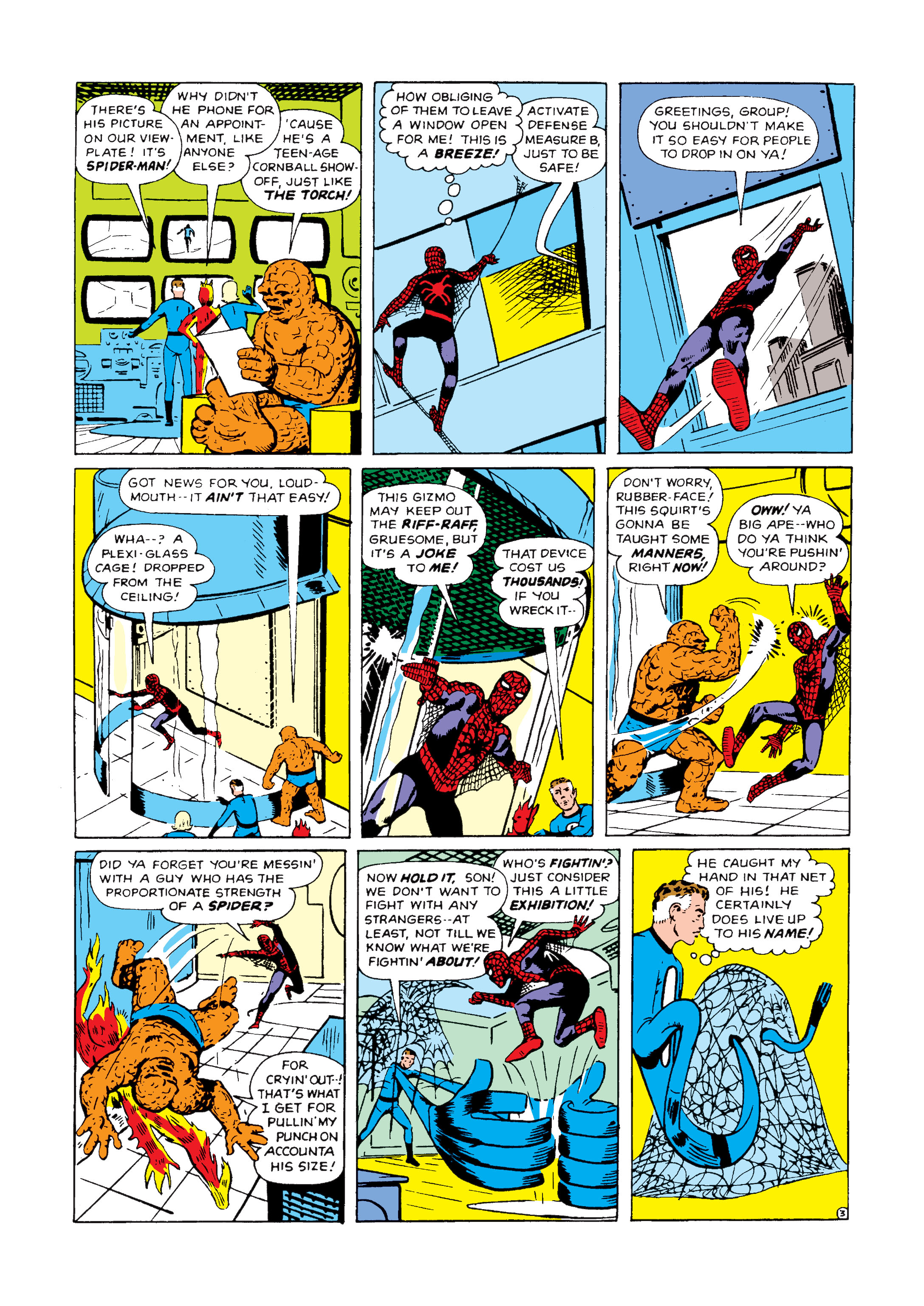 Spider-Man also favorably scales in speed to the Fantastic Four. Spider-Man has stated that his speed and reaction time are better then the Fantastic Four and avoided attacks from Super Skrull who has the powers of the Fantastic Four. He's dodged blows from The Thing and Mr. Fantastic but the real comparison is with his long time friendly rival The Human Torch. Early on Spider-Man was clearly faster. He's avoided his fire blast normally, dodges numerous fire blasts, dodged his fire spear, kept from being outpaced in a chase, avoids the attacks of the brainwashed Human Torch and dodged fire blasts from numerous Human Torch clones at once, with the Human Torch commenting he's never seen someone move so fast. By this point The Human Torch already had hypersonic+ feats and in the same issue he says he's never seen someone move so fast, he writes this giant fire message in the sky quickly. While it's unclear exactly how they compare in modern times, Spider-Man is clearly not massively slower then the Human Torch, able to wall-crawl at the speed Human Torch flies and able to dodges close range fire blasts from an enraged Human Torch. For comparison the Human Torch has his own microsecond feat reaching speeds of over Mach 9000, over 1% the speed of light. The feat of Spider-Man moving faster then anyone The Human Torch had ever seen happened in December 1963 while the Human Torch's Sub-Relativistic Feat happened in January 1964. I am NOT kidding.