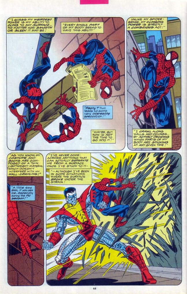 Spider-Man has the ability to adhere to any surface, the legendary "stick-em power". This is most commonly used for his wall-crawling, climbing up the vertical side of a building which he can do as easily as he can walk. This works because he "apparently has the ability to mentally control the flux of inter-attraction between molecular boundary layers". You know....APPARENTLY. Basically what this means is he has a limited ability to control the positive-negative attraction of atoms on his body to make them cling to whatever he's touching, like putting oppositely charged magnets together.