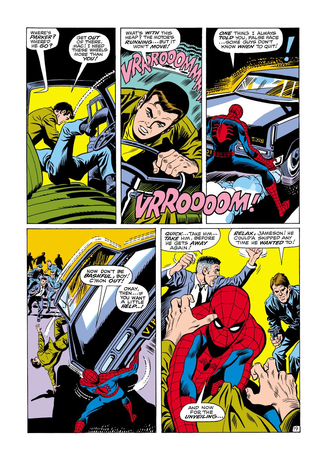 Spider-Man obviously carries his web shooters on his wrists and also carries on his utility belt his spare web cartridges. It's possibly this is how he carries multiple types of webs. Spider-Man also had on his belt a light with his face insignia he would shine in to intimidate criminals. He doesn't use it very often these days, though he does occasionally take it out, particularly when he needs an area to be illumintated. More recently Spider-Man had a chip implanted in his brain that is supposed to block neural interference however it doesn't work too well.