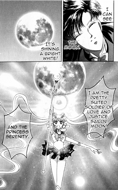 7: Act 9: Act 9 is absolutely fantastic and I love it in every way. It's also an incredibly iconic act. This is the act where Usagi finally awakens her memories as Princess Serenity and gets the Silver Crystal, the central plot element of the entire series. Princess Serenity's description of Earth and its Prince break my heart everytime so instantly compelling are they, yet so deep that I have difficulty expressing all that I must about it. The Earth from space is a blue world so deep in color that is seems to swallow the gazer, a beautiful planet where wind blows and trees sway, a world of infinite hope and possibility. Prince Endymion and Princess Serenity's love is forbidden yet despite this, or perhaps because of it, the pure inevitability of it is so papable as their opposite forces draw closer of the illusory, otherworldly, ethereal and outside time comes into contact with the world of life and movement and adventure and possibility, the stuff of reality. The act comments on the nature of the genre it's in, breaking it down and expanding it as the wish fulfillment and coming of age story elements are recast in tragic colors, as Usagi comments in horror as her hair grows longer that she becomes the tragic princess, as the painful reality of being that princess reaches Usagi. In act 4 Usagi wished to be a pretty princess thoughtlessly, but here she is becoming that princess and it's a mournful experience as her identity begins to fragment around her. I love the supportive way the other Senshi act this chapter, the way Luna takes responsibility for this seemingly inevitable acts and is comforted by Artemis, showing a level of supportiveness and emotional maturity as a group that is so uncommon to see in fiction. And I love the messianic theme of Princess Serenity's power restoring the world to life yet triggered by her tears, one of the clearest expressions of Takeuchi-Sensei taking a feminine stereotype and not just making it a marker of power, but taking one of the most derided things about women, being tearful, and making it the symbol of the ultimate power, the savior of all. This act is more consistent and iconic to me than even Act 36.