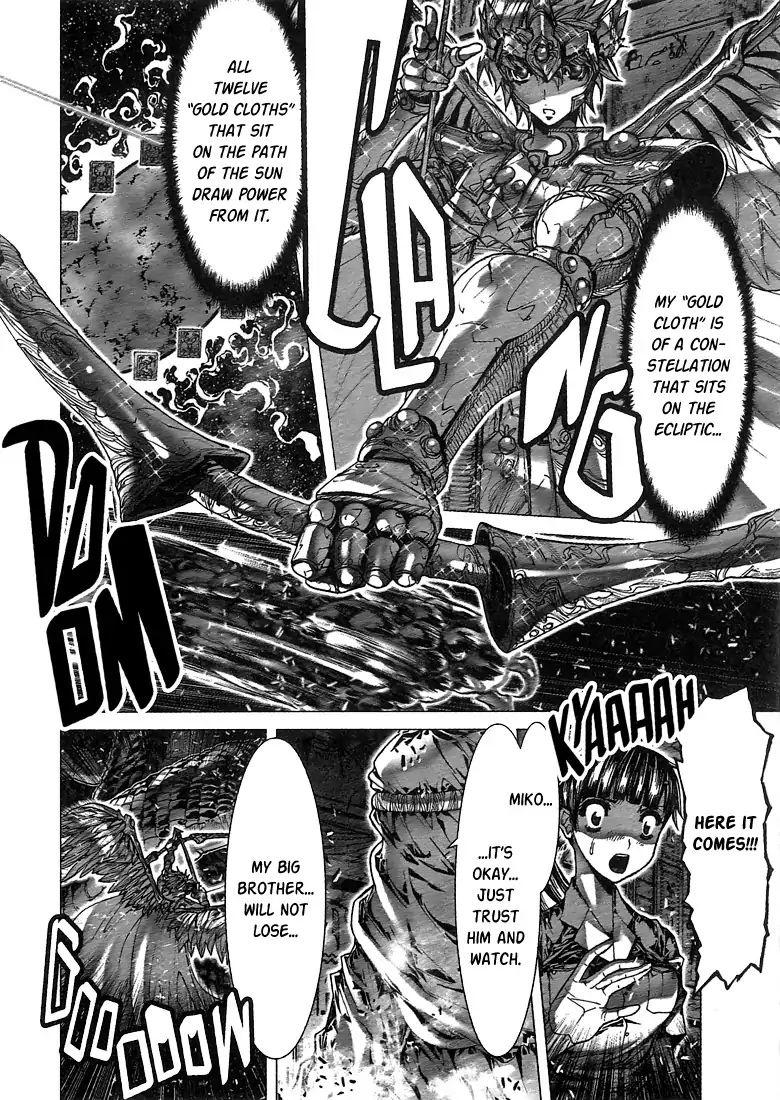 Aioria's ultimate move is the Photon Burst which has similar power to the Galaxian Explosion and a lot of same threatening properties. Bloodman probably couldn't use Absorption Curse on it as it being the Holy Light of the Sun would absolutely mess up his weakness and it just spawns on his location. On the other hand, God Serena can potentially protect himself and others from it if he acts fast enough as he can absorb the light.