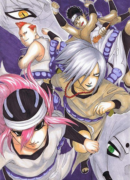 Finally the strongest member, Sakon and Ukon, a pair of conjoined twins. The two's Kekkai Genkai, their unique ability, allows them to merge and separate at will. When together they can adjust their body incredibly freely, with Ukon for instance making his first appear in Sakon's face to punch an enemy in front of them as well as heal quickly. When separated the two can quickly grow metal limbs to allow them to move freely and independently. They can also forcibly merge with other people where they can essentially start destroying that person's body from the inside on a cellular level. He also knows sealing techniques.