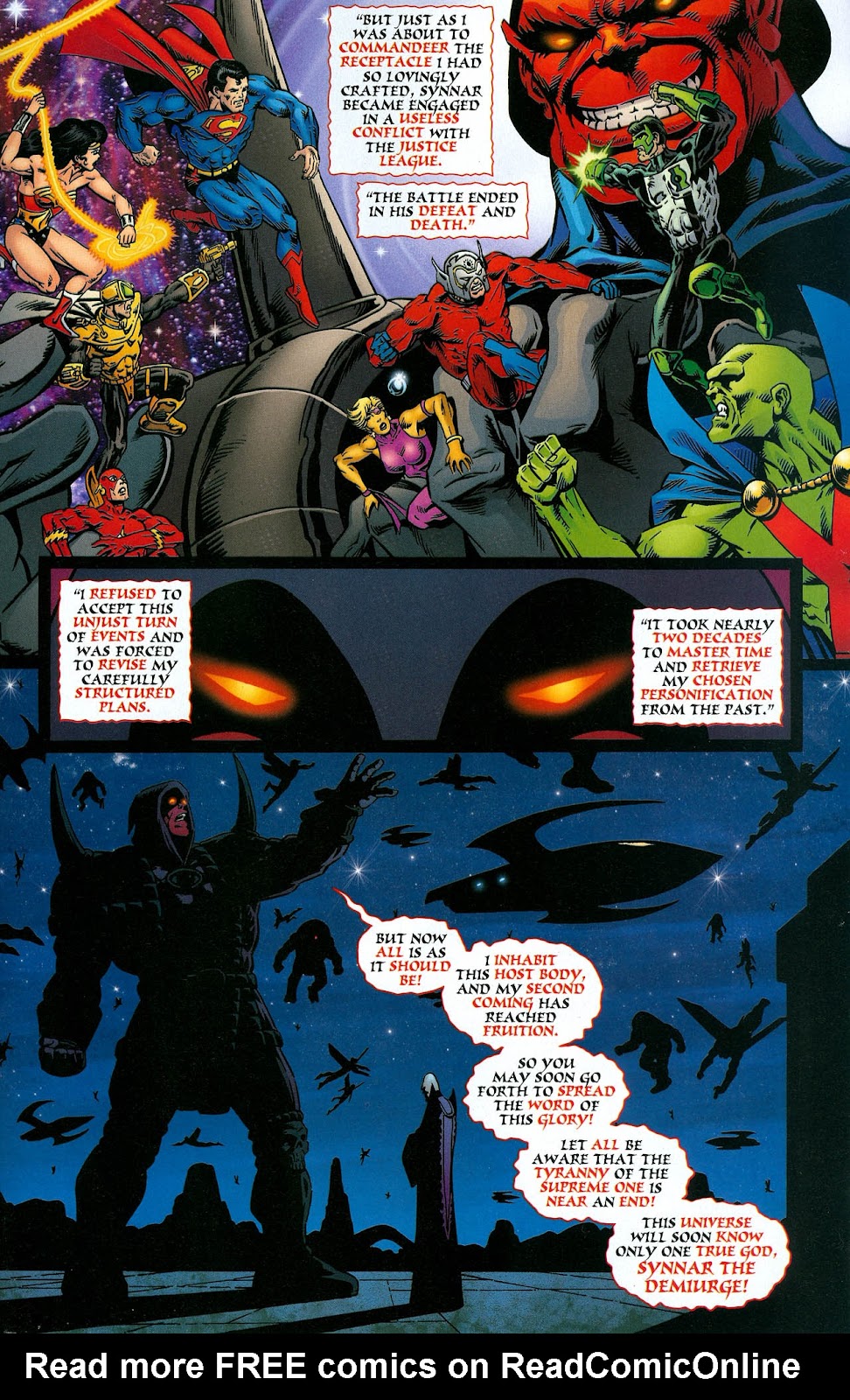 It came to be there was a monstrous alien known as Synnar, powerful enough to fight the JLA alone. Synnar had been a vile scourge on the universe in every lifetime. He discovered a strange force called the nameless one who manipulated Synnar into serving his interests.