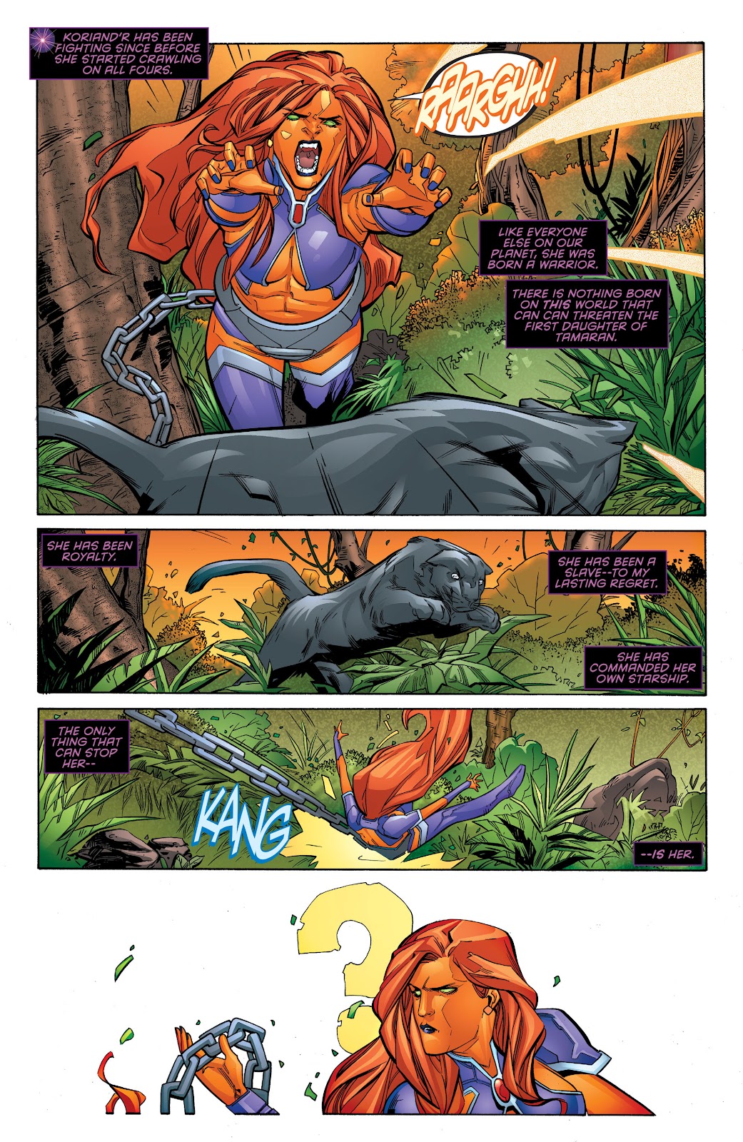 Emotion has long been known to increase our capacities. Happiness improves health, sadness has been shown to increase creativity, and anger allows for bursts of strength beyond what is normally possible. Is it any surprise then that there might be a world that reveres the transformative power of emotion. On the distant world of Tamaran, emotion and passion rule all society.  The Golden skinned natives absorb sunlight for power and release it in their emotional displays. Born to the Royal House of Tamaran were two sisters. However the older of the two, Princess Komand'r was born a genetic freak, unable to fly like the rest of the populace. Thus the crown princess became the second sister Koriand'r. Komand'r in envy sought to usurp the crown from her sister. She betrayed Tamaran, allying with their longstanding enemies the Gordanians and usurped control of Tamaran causing her sister Koriand'r to be sold into slavery.