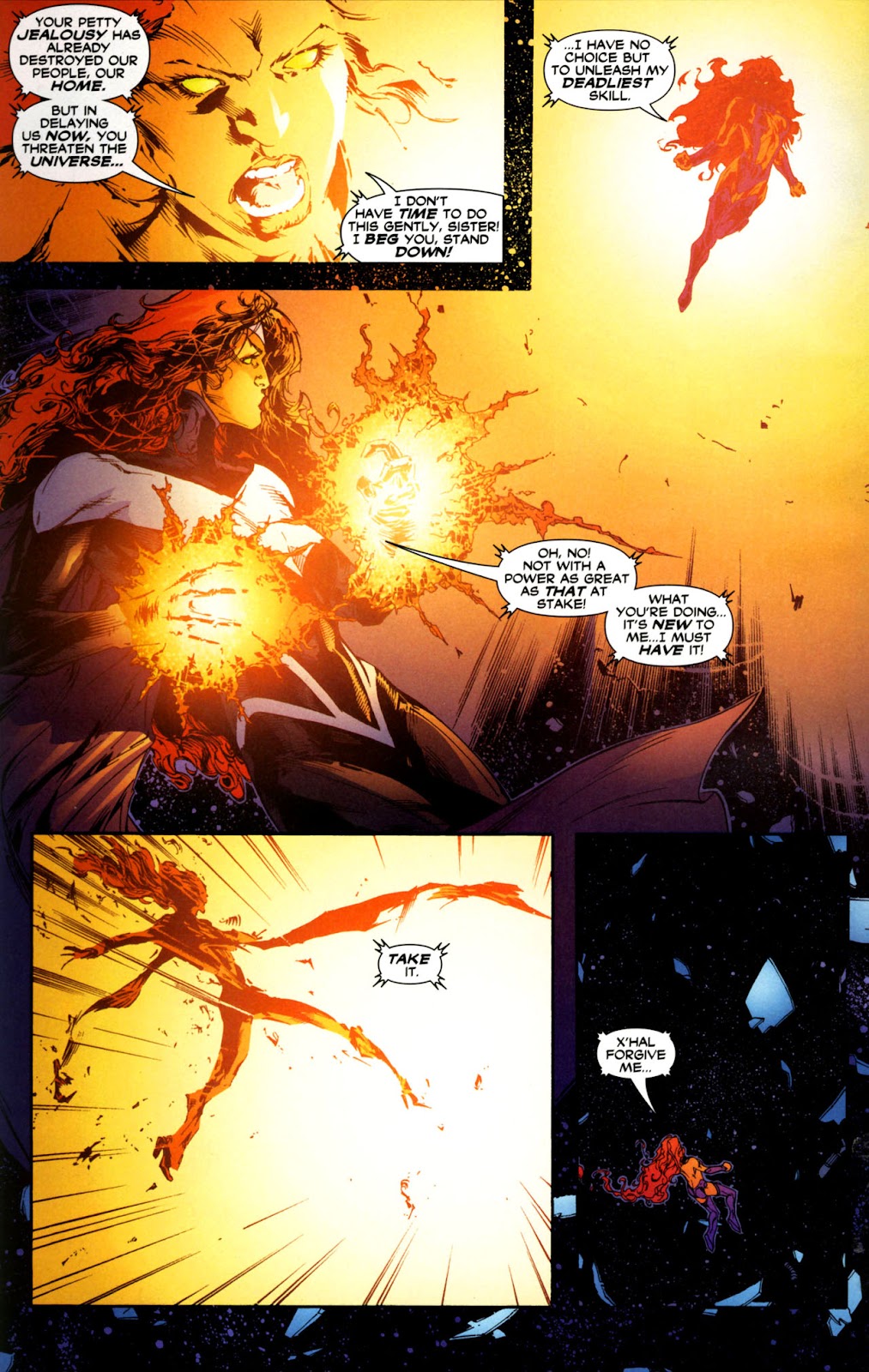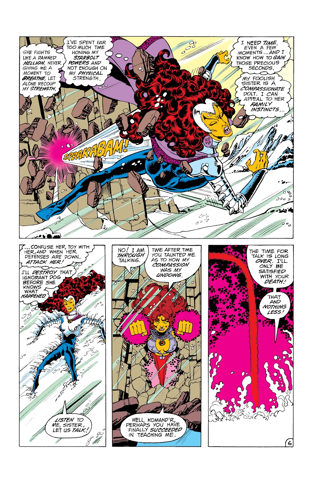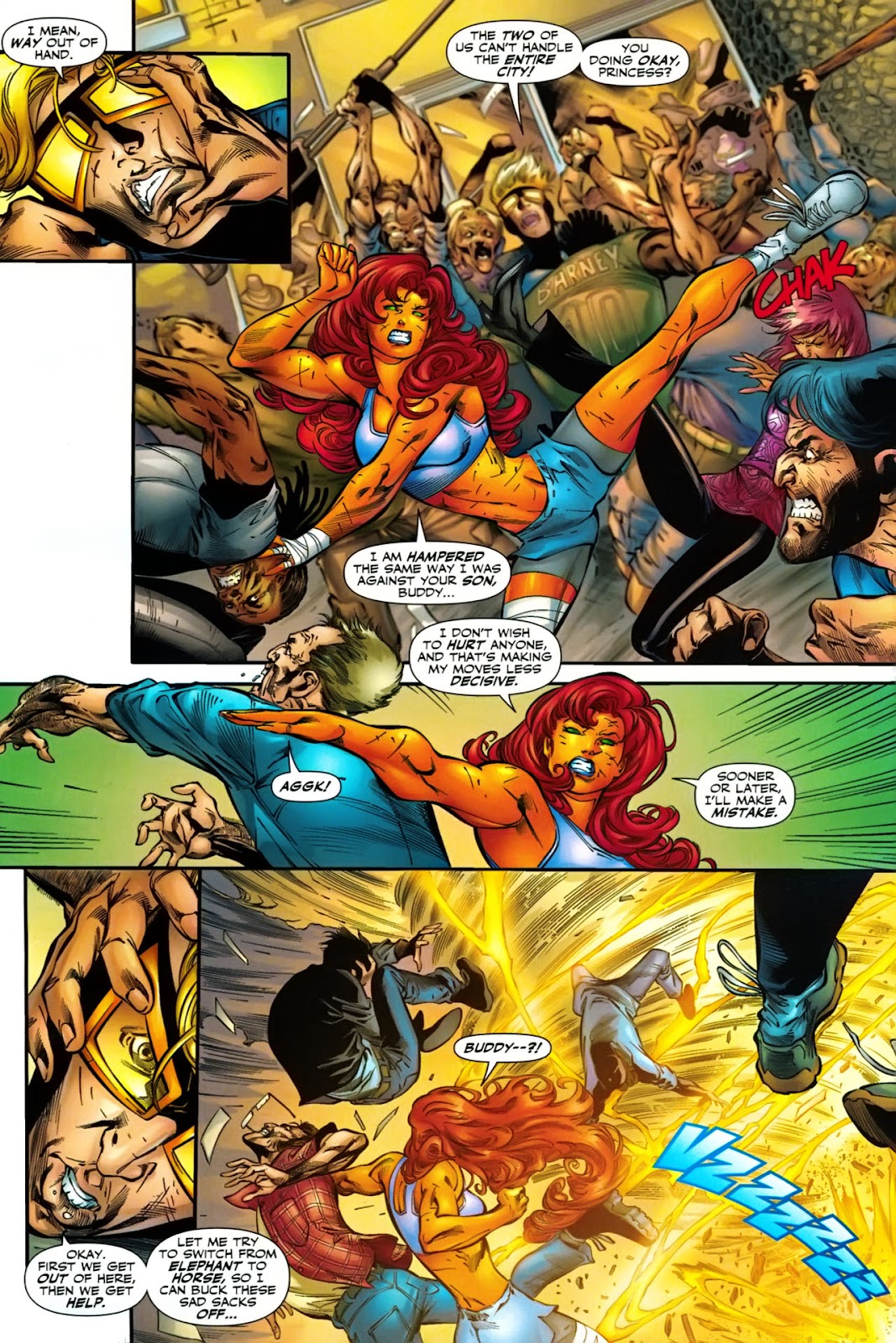 Also while Starfire's durability and starbolt power are above her raw strength, her strength should scale to it as Starfire and her older sister Blackfire are regularly able to harm each other with their strikes. Also it should be noted that there is a misconception that Blackfire is more powerful then Starfire. While it is true that Blackfire absorbed more stellar energy and has more raw starbolt power, Blackfire spent too much time focusing on her starbolt power, and not enough on her physical power and so in physical strength, Starfire proved the superior.