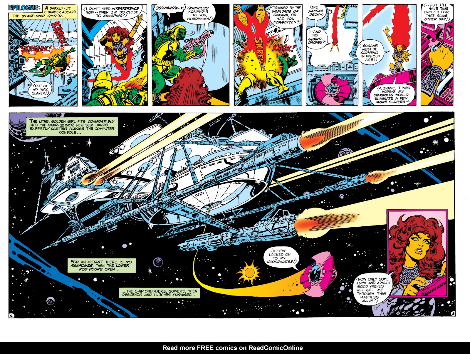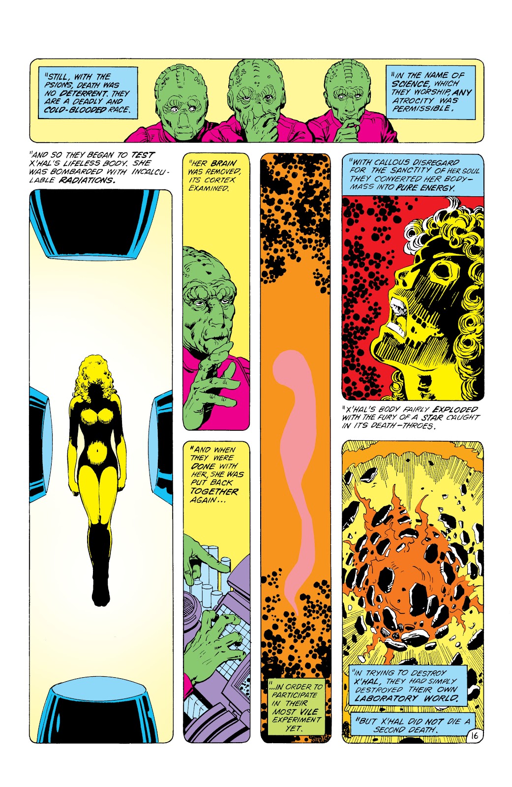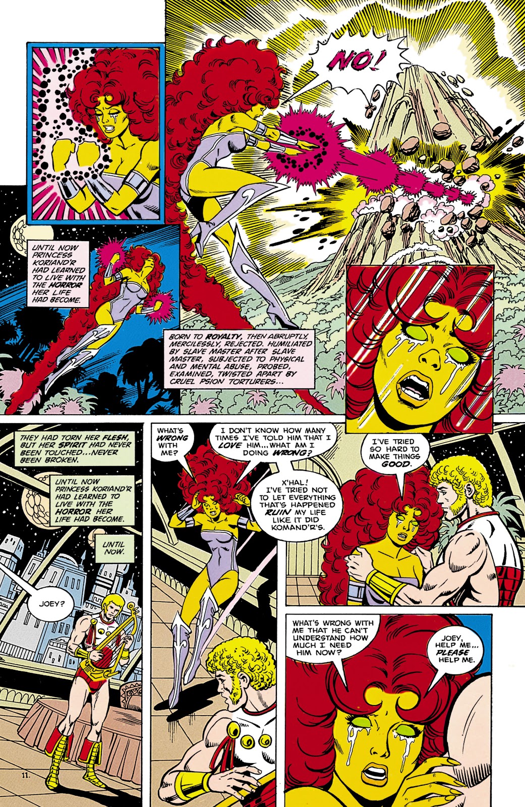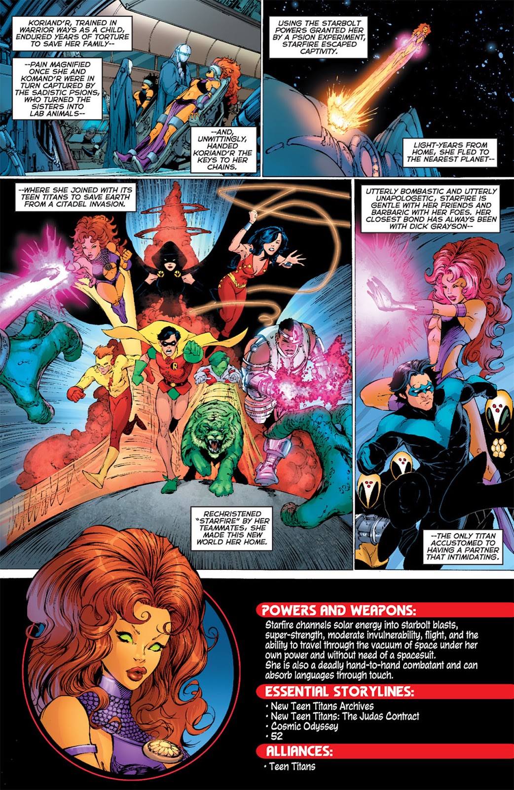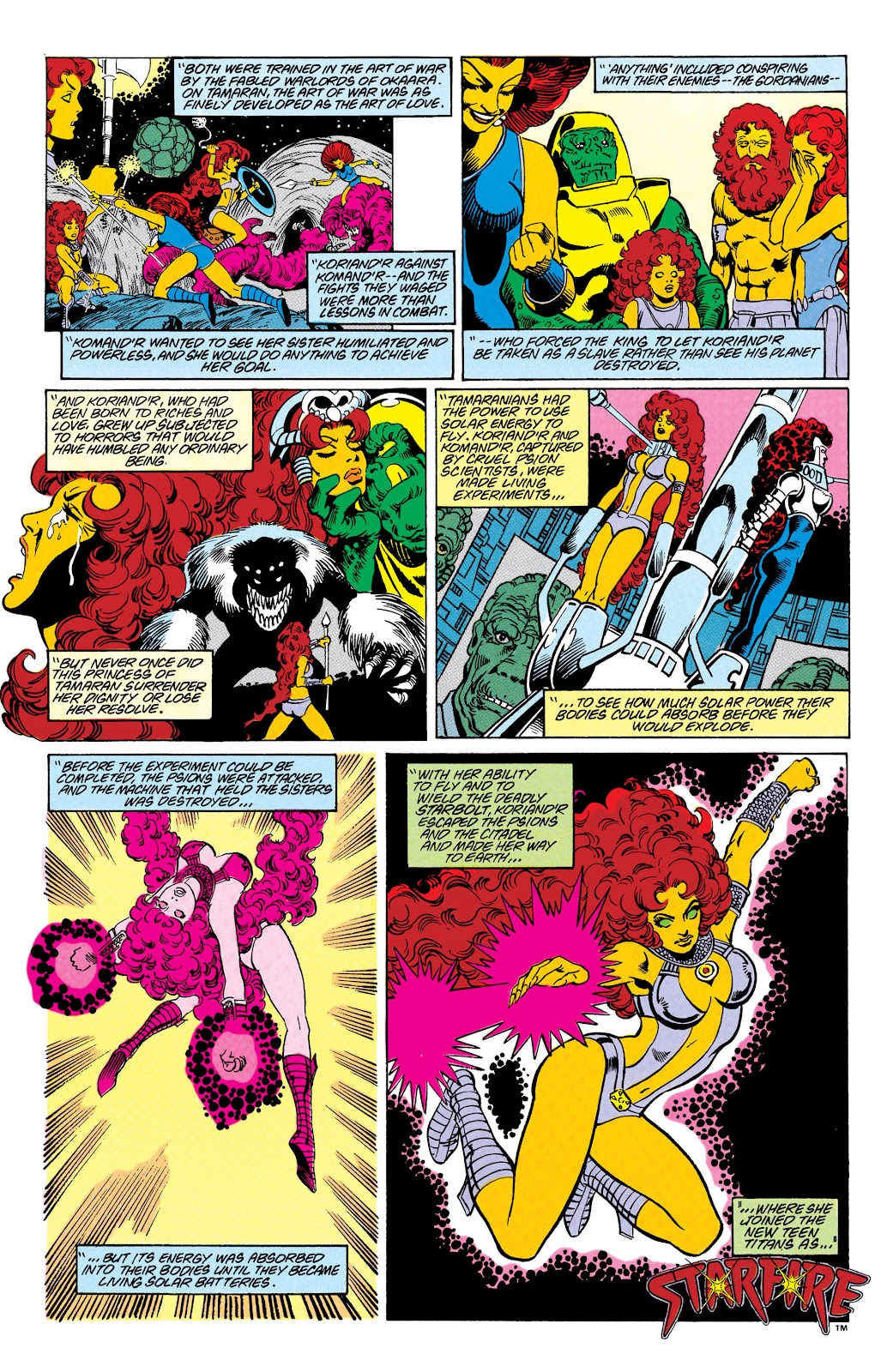 For 6 years Koriand'r suffered unbearable physical torture and the degradation of slavery. But while her body was broken many times, her spirit was strong and could not be broken. In the course of her enslavement Koriand'r found herself in the possession of the Psions, a species of vile scientists. Curious to see how much energy the stellar-energy absorber could withstand before exploding, Koriand'r was put into a device designed to charge with ever increasing stellar energy. This experiment caused the machine to explode instead and Koriand'r to gain abilities beyond even those of her race.