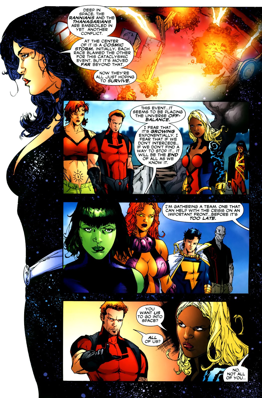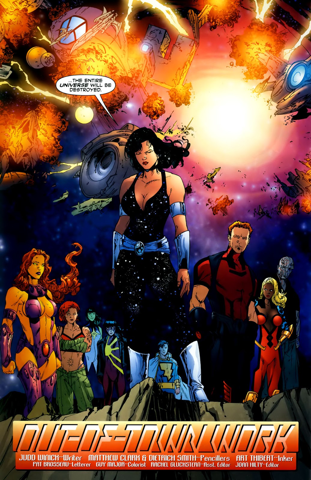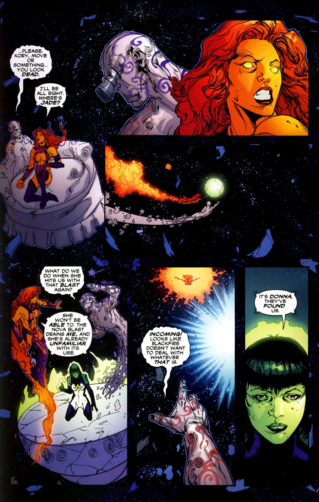 Oh and one more feat. During Infinite Crisis there appeared a Galaxy Sized Black Hole that could destroy galaxies. This Cosmic Storm was moving the universe off-balance, threatened to destroy the universe and created an unprecedented warping of the spacetime continuum. Starfire was one of the heroes capable of surviving near the event horizon of this black hole, requiring massively cosmic durability to survive, even accounting for surface area and distance from center, and speeds capable of not being immediately sucked in.