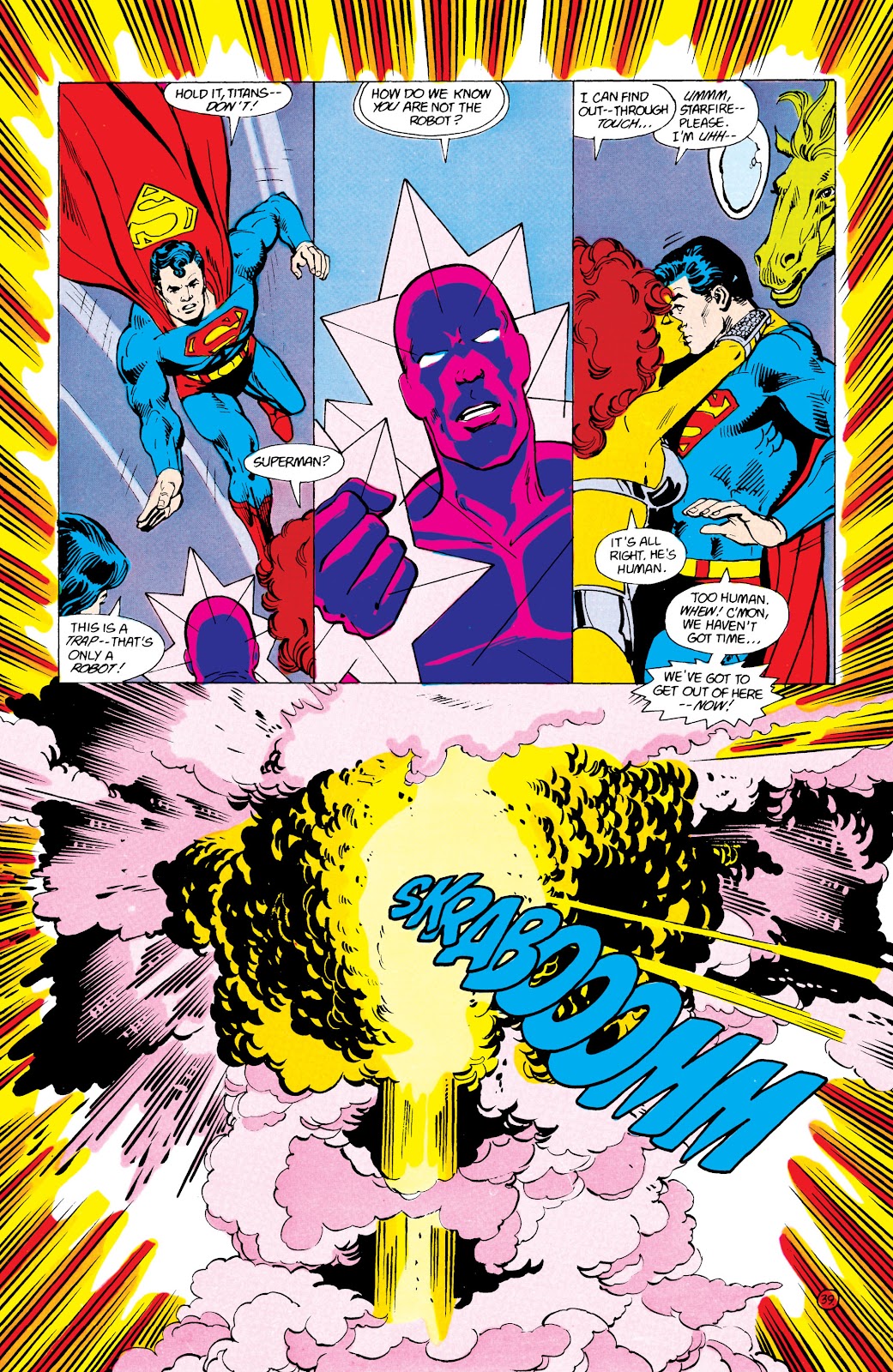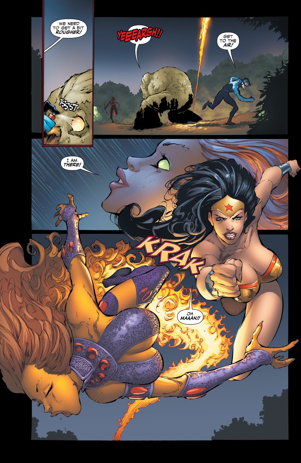 And these aren't even Starfire's best feats. Starfire has managed to fight Wonder Woman herself effectively. Technically Wonder Woman doesn't even win the fight, it's broken off by a third party arrival. Wonder Woman has handily survived the pressure of a Black Hole and taken 3 Infinite Mass Punches without much damage. Starfire is likely above this baseline. During the New 52 Era, where everyone was 10 years younger due to them being removed from the timeline, Starfire described herself as nearly Superman strong and fast. So how strong was Superman in this era? He was strong enough that supernova were no problem to him and he could survive within a Black Hole. He was also stronger then New 52 Cyborg Superman who claims to have flown through exploding supernova.