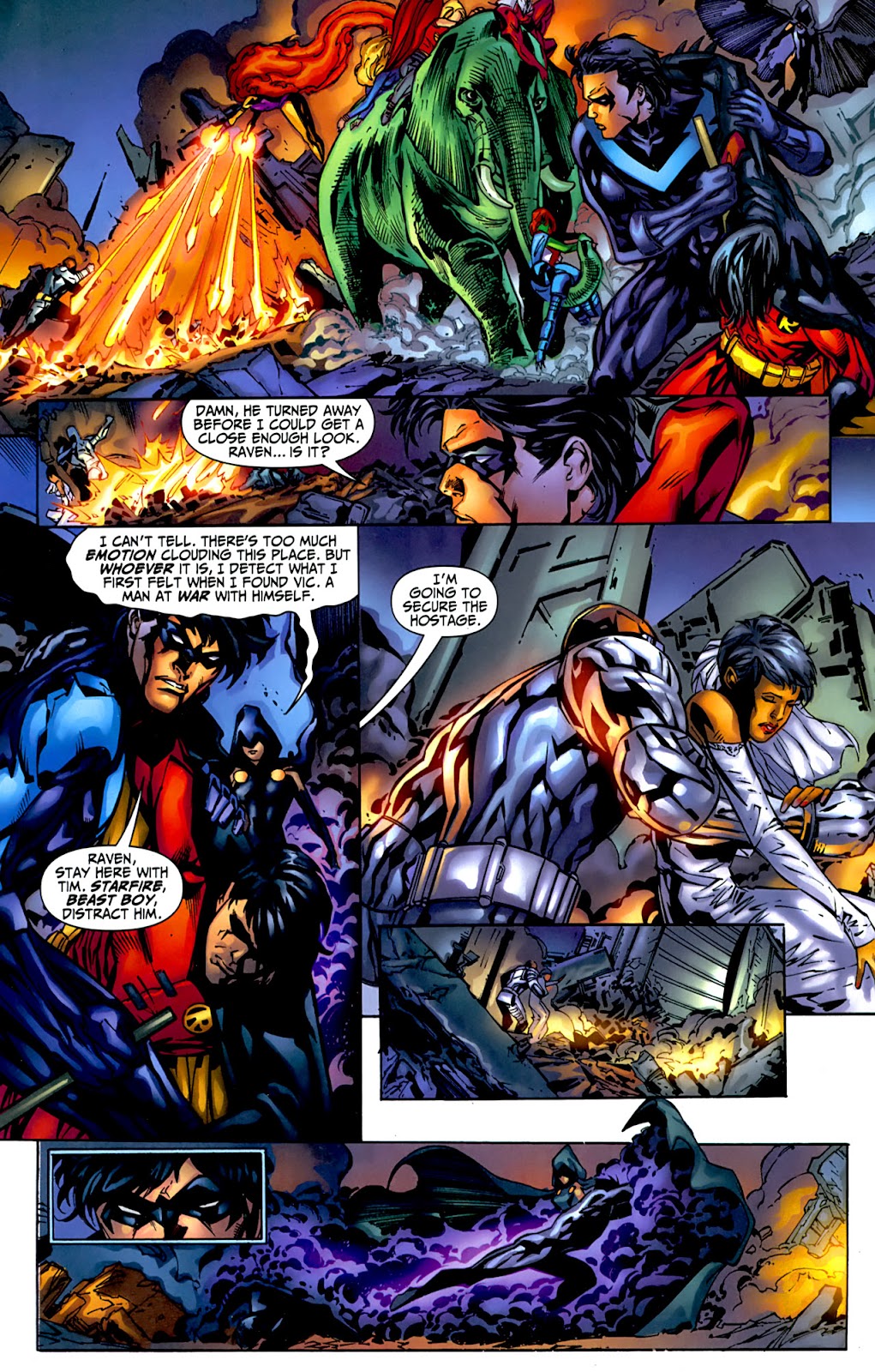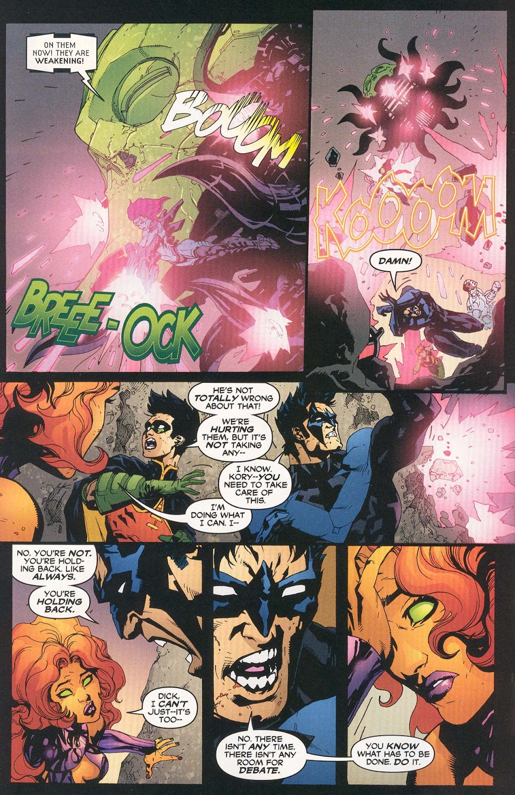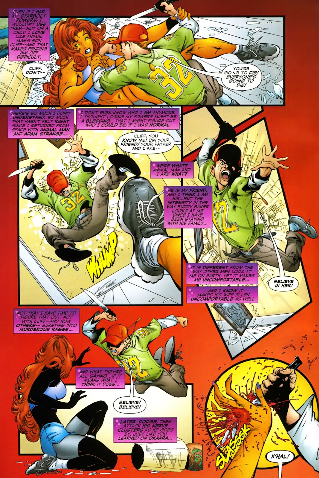 Getting more serious, Starfire's starbolt was able to break the grip of the Chida beast her strength could do nothing too despite the fact that Starfire was weakened. Her starbolt was also effective on Enhanced Blackfire who was earlier mistaken for X'Hal. It is also an effective weapon compared to her fellow Titans Members. The Starbolt was effective against Wonder Girl, could have killed Cyborg (disguised as Wildabeast) and was able to force back Demon Raven. Starfire in fact was said to be the only one of the Titans Assembled, Cyborg and Donna Troy included, that could put down Demon Raven.