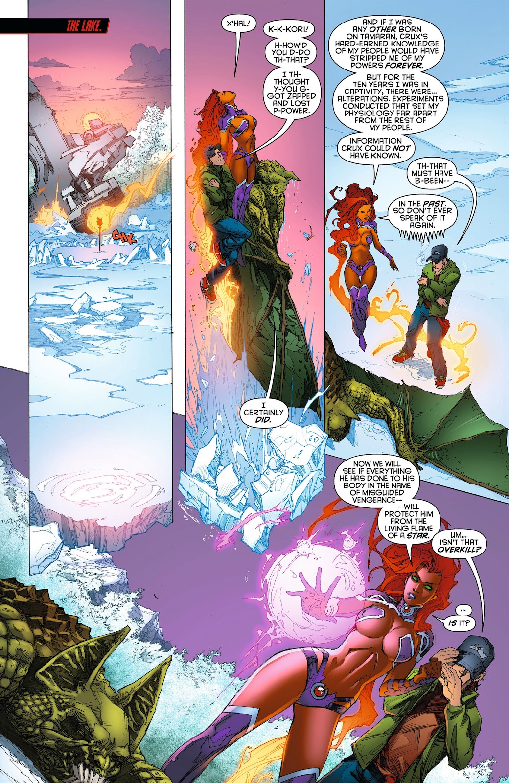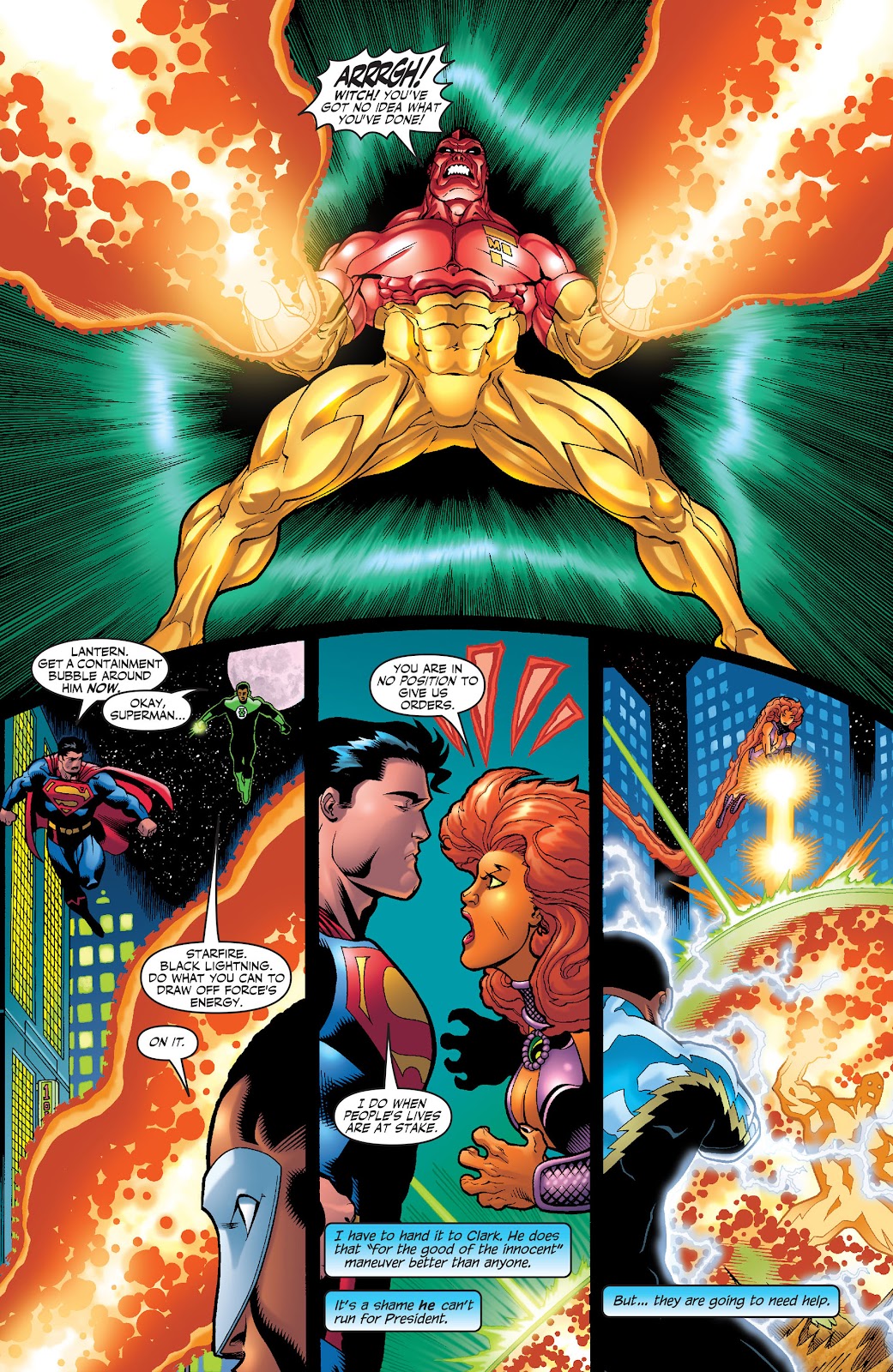 Remember how powerful Green Lantern Auto-Shields are? Well Starfire's starbolts can overwhelm them. Her blast worked on a Green Lantern, as well as Sinestro and completely one-shot Black Lantern Terra. She was also able to blast a Manhunter on the same tier of power and cause it to release Harbinger. Starfire's starbolt can even be compared to the high tiers of the DC Earth. Starfire matched Jon Kent's Heat Vision with her starbolt. Starfire's starbolt worked on Atlas in combination with Donna Troy, and Atlas was said to be nearly as strong as Superman. During the New 52 Era, there was a Superman Enemy named Lord Helspont, a Galactic Warlord. Lord Helspont was strong enough to tank New 52 Superman's Heat Vision and overpower him. During the New 52, Blackfire and Starfire actually reconciled and Blackfire actually tried to change. When Lord Helspont killed Blackfire for trying to protect her sister, Starfire's power became strong enough to harm even him. Starfire's power has proven effective against Envy with Wonder Woman's powers and against Wonder Woman herself. Starfire's power lives up to the description of defying measure and imagination by challenging even the gods. Her Starbolt power proved able to harm Cronos, King of the Titans. In a fair fight she was able to defeat the powerful New God Devilance the Pursuer. The likely weaker New God Lightray was able to create a sun and shatter a planetoid while weak.