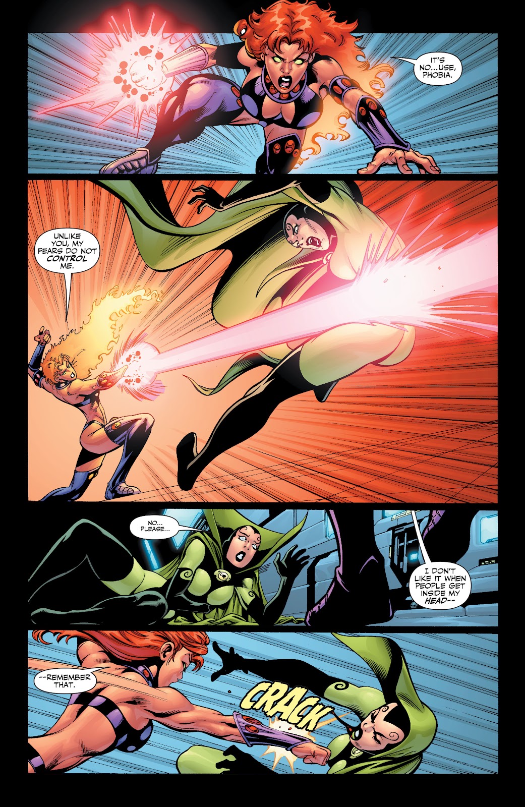 Starfire's mind is also harder then normal to effect. Lie Detectors don't work on Starfire because of her alien physiology, her memories are particularly hard to read and Phobia could not control Starfire because Starfire is not ruled by her fears. Also Starfire's emotions are overwhelming and impossible to stop. An apathy field could not affect Starfire.
