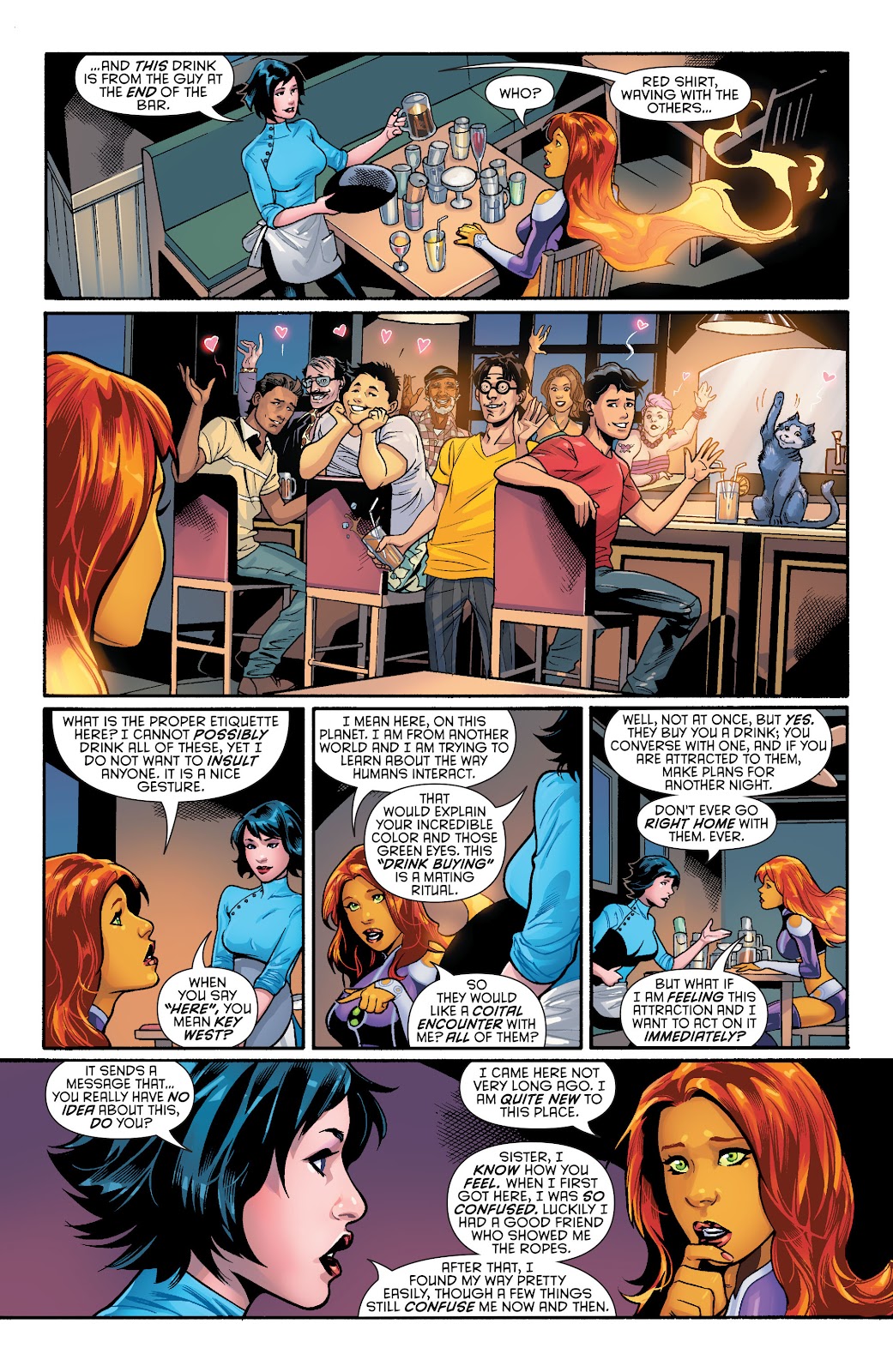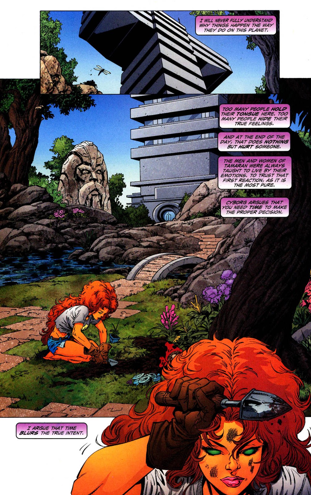 Starfire is impulsive, emotional and prone to sudden bursts of passion. She is loving towards her friends and wrathful towards her enemies. While initially she was as much a Tamaranean as anyone, she acted as a reconciliation between the two worlds and philosophies, learning some level of self control and rationality from her Earth friends while also teaching them to be more free with their emotions. This union's philosophy led to a planetary utopia, and so while she does not wish to be she is worshipped as a goddess in the Ghost Sector.