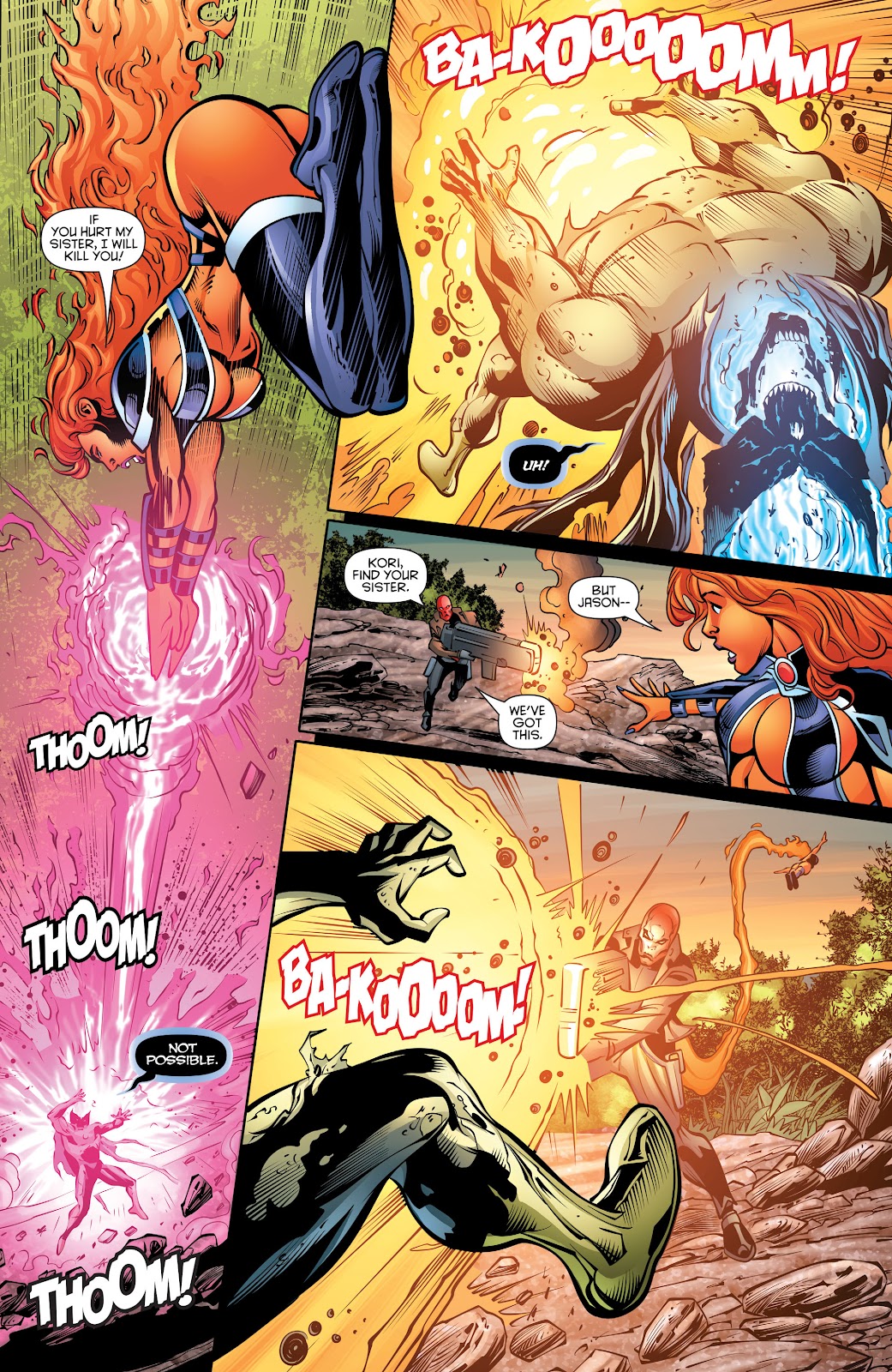 Starfire can emanate heat and fire. Merely touching her skin melted Red Hood's gun. She can shoot fire from her hands or more commonly her hair can set alight and she can use it as a weapon theoretically. Her hair fire can burn tanks and regularly stretches long distances: