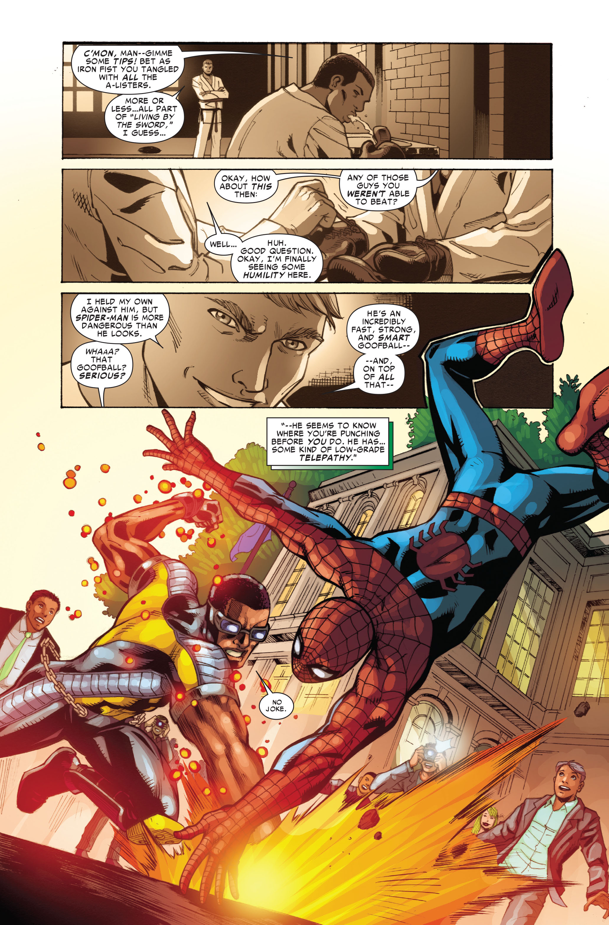 5: Scales to Iron Fist who has megaton feats like hitting like an H-Bomb after making his fist glow like a star, defeating Radion. Iron Fist claims he could never beat Spider-Man.