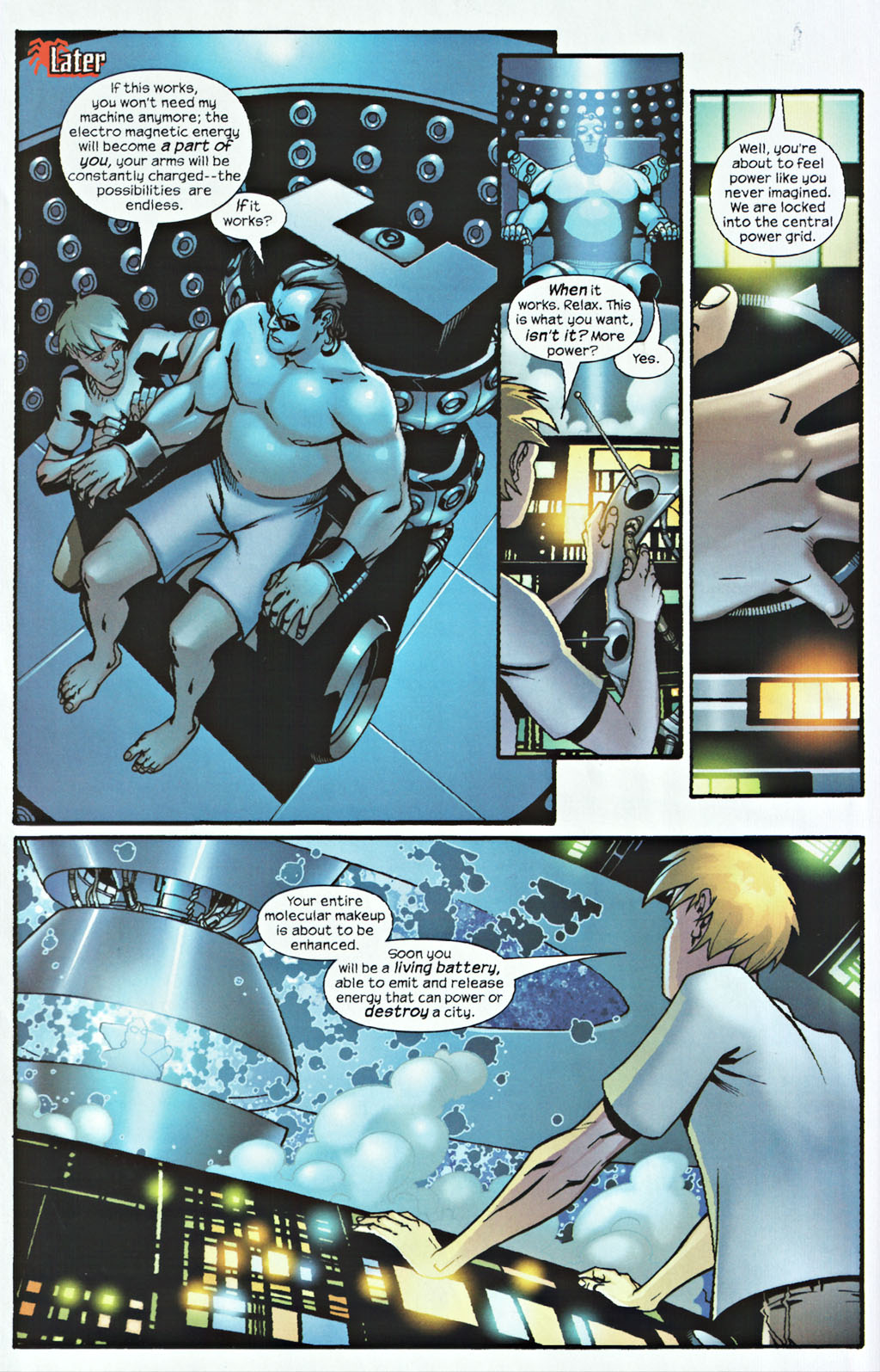 2: Scales to Electro, who absorbs all the electricity of New York becoming a blindly white light across the city burning like a star or a nova before later increasing his power a thousandfold. Spider-Man still beats him physically. Electro also created an electrical storm with one blast shutting down power to New York.