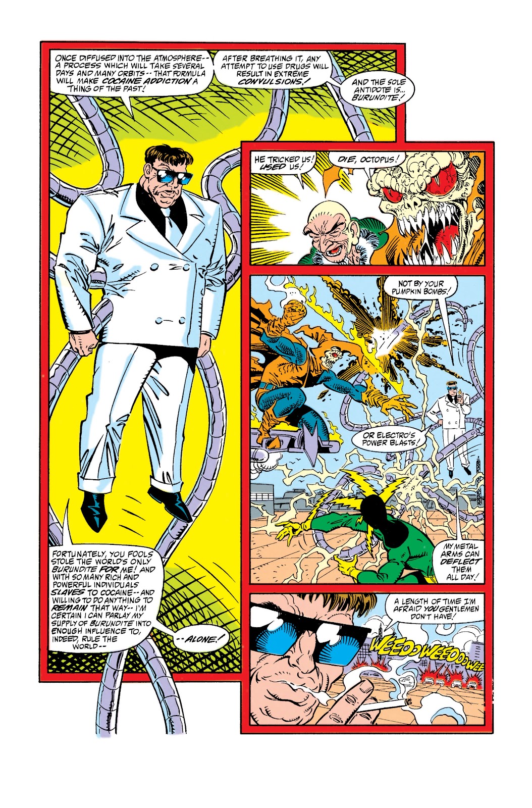 This is relevant because Doctor Octopus and possibly Hammerhead have one of the best feats for the Spider-Man characters. The two were fighting and Hammerhead hit the nucleur reactor they were fighting on, somehow causing an atomic explosion. The explosion creates this massive fireball and mushroom cloud and obliterated the entire island they were on. I'm not sure if this is a feat for Hammerhead because I don't know how or even neccesarily if he survived it. He shows up again later acting all ghostly but instead of saying he died he states the explosion blasted him "out of phase". I don't know if that means he survived or not. The Marvel wiki claims he was killed so I don't feel comfortable using it as a feat. What is a feat however is that Doctor Octopus' mechanical arms wrapped around him when the explosion hit and protected him, remaining completely unharmed from the atomic explosion (though somehow were permenantly grafted to him from it). This has been calced to triple digit ton of tnt, though I think realistically given their lack of damage and the sheer violence of the explosion it's more likely in the kiloton range. Either way, this is important because Spider-Man was able to tear off these arms, damaging them more then the nuke did with his raw strength and another time violently breaking them. However other Spider-Man villains also have feats at this range as well.