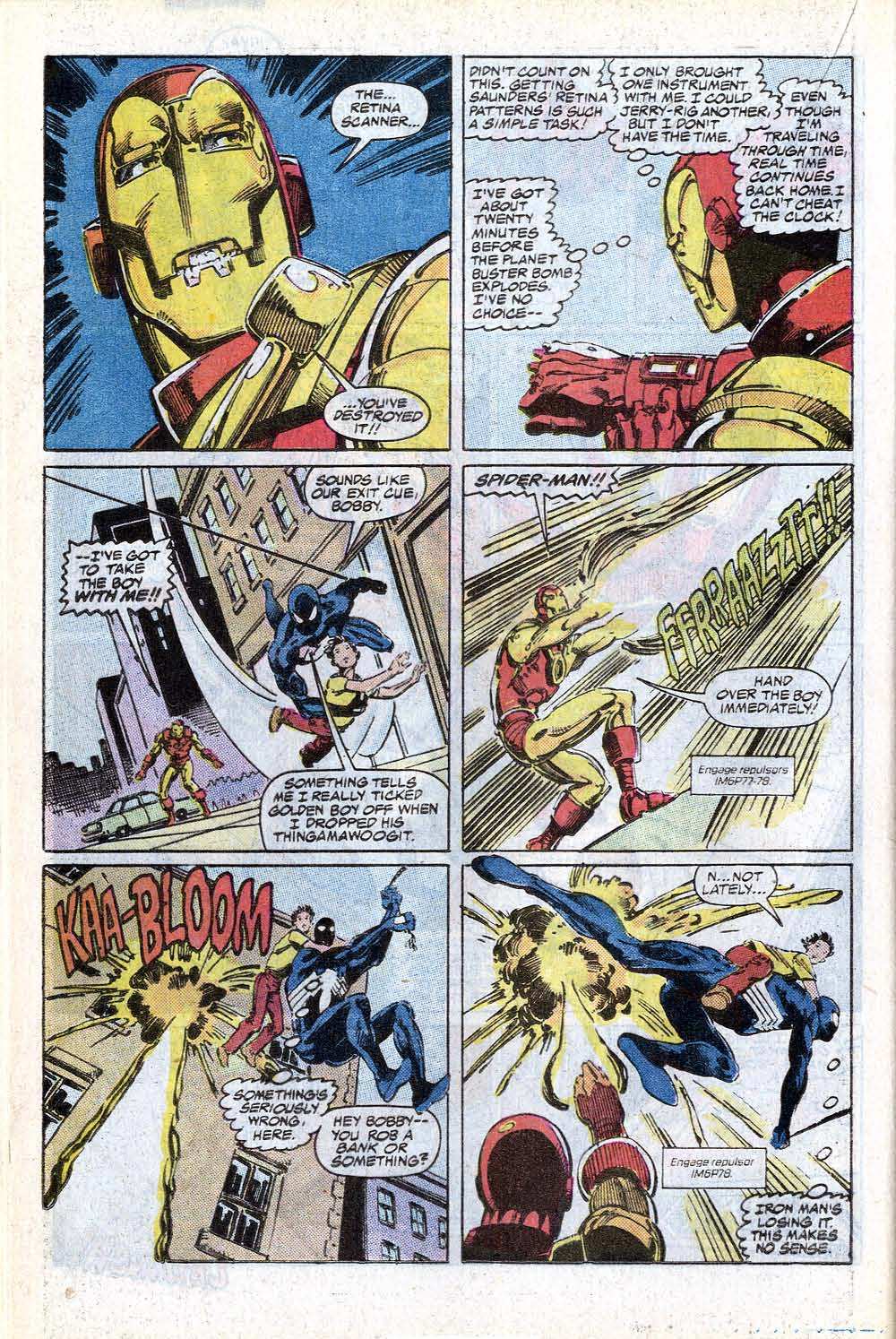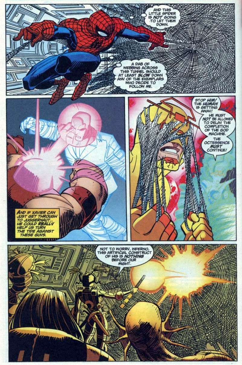 Type 3 (Galactic Scale civilization with tech using that can somewhat distort the laws of physics directly): Spider-Man invents his own tech, including various spider-armors some of which have been able to contend with herald level entities. He also has other feats of creating or otherwise scaling to technological inventions that scale to entitites that can destroy planets, stars or more. Spider-Man has been able to hack an army of tri-sentinels, stronger then base sentinels who scale to Colossus, and hacked a tri-sentinel while being attacked and it was under Loki's magical control. He and Reed Richards were able to upgrade Bleeding Edge Iron Man, invented combat vehicles capable of taking on the Hulk and easily diagnosed the problem with the Quintronic Man a power armor that fought Hulk to a standstill. Beyond this, Spider-Man as a teenager created an anti-magnetic inverter that reverses the magnetic field. This was later referenced when he created another anti-magnetic inverter device that nullified intangibility. He invented a genetic isotope accelerator which removed the powers of mutants and mutates, was able to, along with Iron Man, help Noh-Varr build a spacetime continuum viewer and time machine, and in a short term alternate future created a time travel machine himself as one of his attempts to stop the Dr. Doom controlled future.