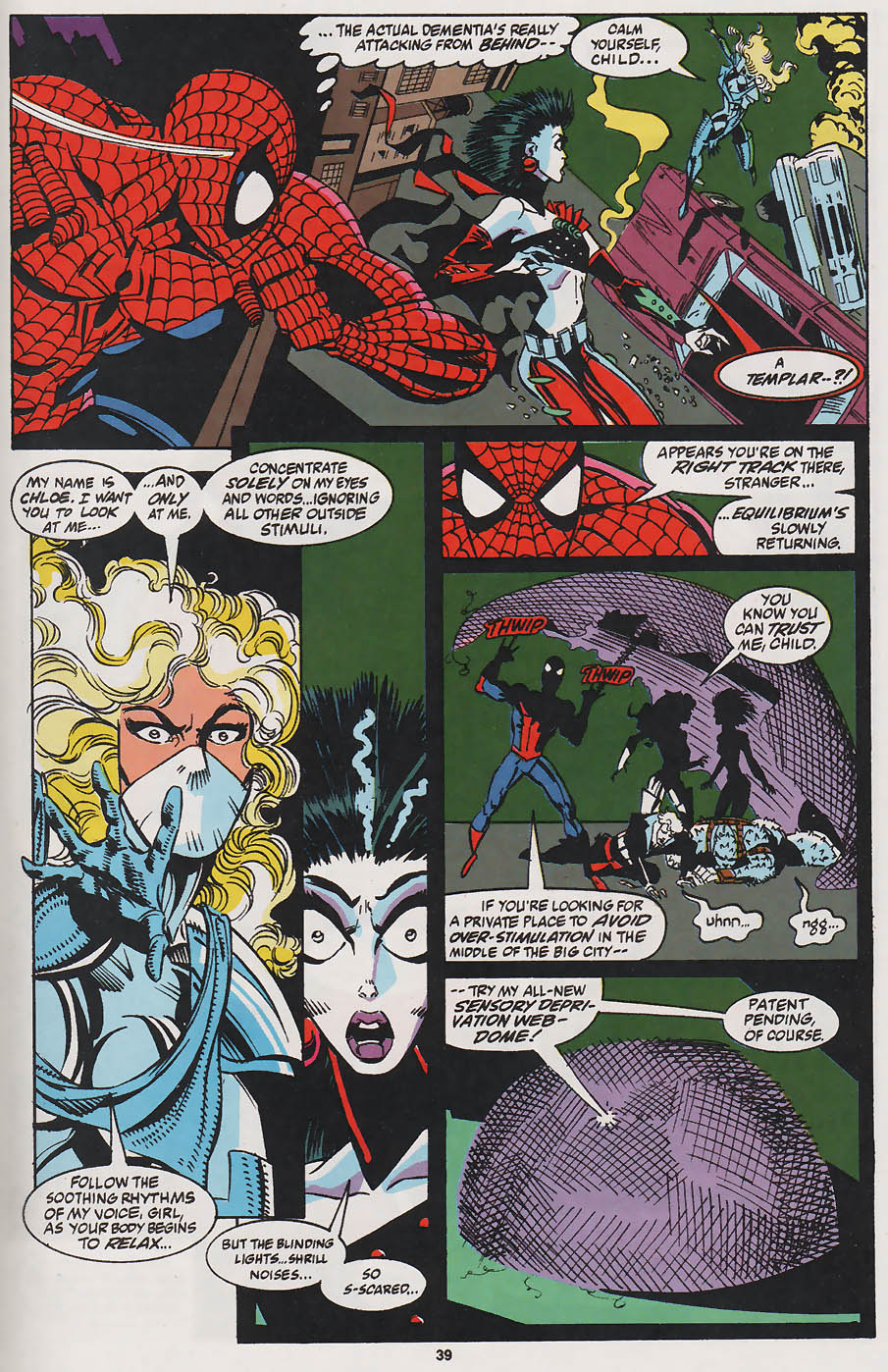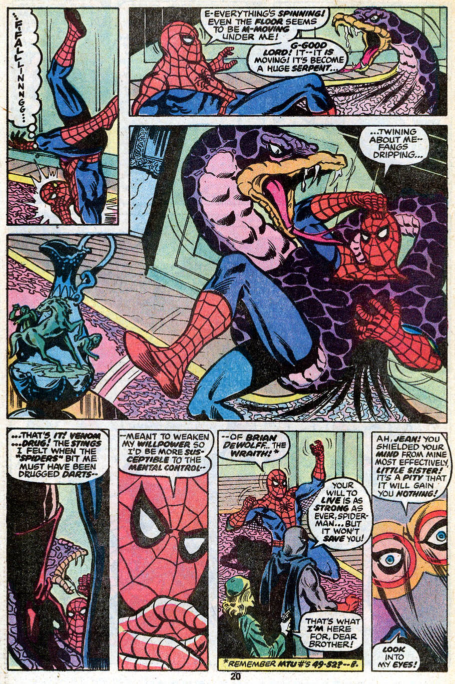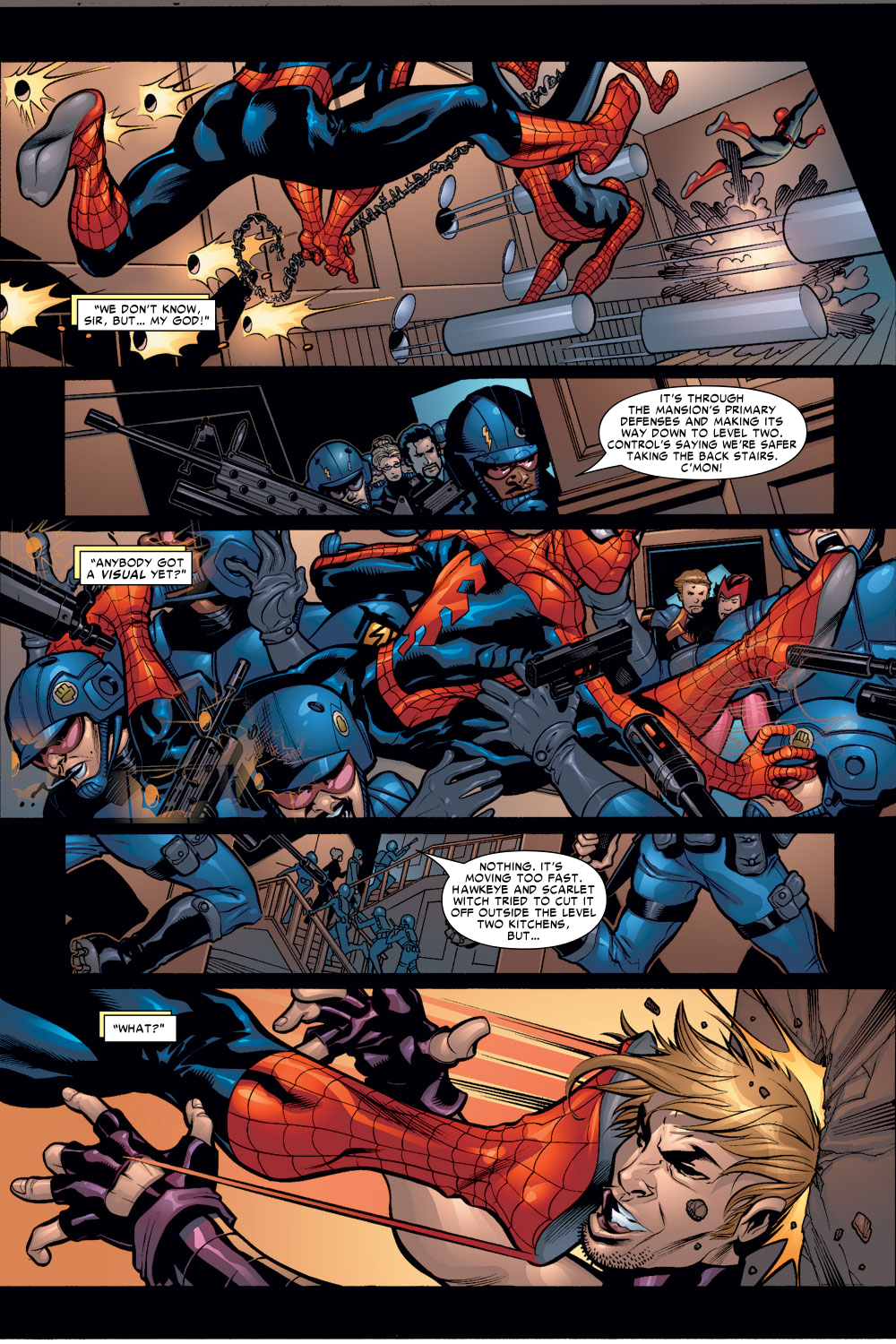 Spider-Man's willpower I have already shown can let him consistently and often push through his own physical limits in strength and he can do the same in terms of stamina and pain. Powerless he fought through the pain of a bullet wound and was able to fight through a pain far greater then removing contact lenses with a power drill or swan diving naked into a pool of needles. He's pushed through Marvel Girl's telekinetic grip which was implied to be will based rather then strength based and was able to fight through a hypnosis that convinced him that his neck was broken and he was paralyzed. Spider-Man was able to fight a machine attacking his will itself. He can do this because his will is even normally stated to be as strong as his body and will fight possession. I actually think the person was unable to tell Spider-Man's will because it's much stronger then his body. Spider-Man has been hit by a vast array of different mind based attacks of different potencies and types however probably most notable for his mind hax resistance is the time he and the rest of the Avengers and Annihilators were at the epicenter of a mental shockwave that gave Magus control of 30% of the US population and were unaffected. Given the population of the United States, this would qualify for country level brainwashing which did nothing to them. He does have more feats of resisting mind hax, but that one is clearly the highest end. However also of note is he couldn't be brainwashed until he was weakened and poisoned and he was able to resist the psychic attack of Mindworm which is implied to also be an astral attack suggesting he has some soul resistance. He was also able to fight against Mosaic trying to posess him and alter his memories inside his mind with multiple mental antibodies that mimicked his abilities. He fought through the emotional manipulation of Helminth and Psycho-Man on seperate ocassions as well as the hypnosis of the Hypno-Hustler who hypnotized a nightclub of people. Also while it's never stated to be a feat, he was unaffected psychologically by Reed sonic gun blasting the symbiote off of his person when a single telepathic yell of the symbiote in distress caused psychological damage all the way out to Chicago, a city over 1,000 km from New York! The psychological damage was strong enough that some were implied to have committed suicide over it, yet Spider-Man at point blank of the symbiote in hypothetically the most distressful situation it had ever been in was unaffected. I'm not really sure if this can be counted as a feat though since the original comic doesn't say that the symbiote does any kind of telepathic screech (as the concept had not been invented yet). Though later on in the same story arc he tanks being close to a far more powerful psychic yell that drove all the symbiotes around him to mass suicide.