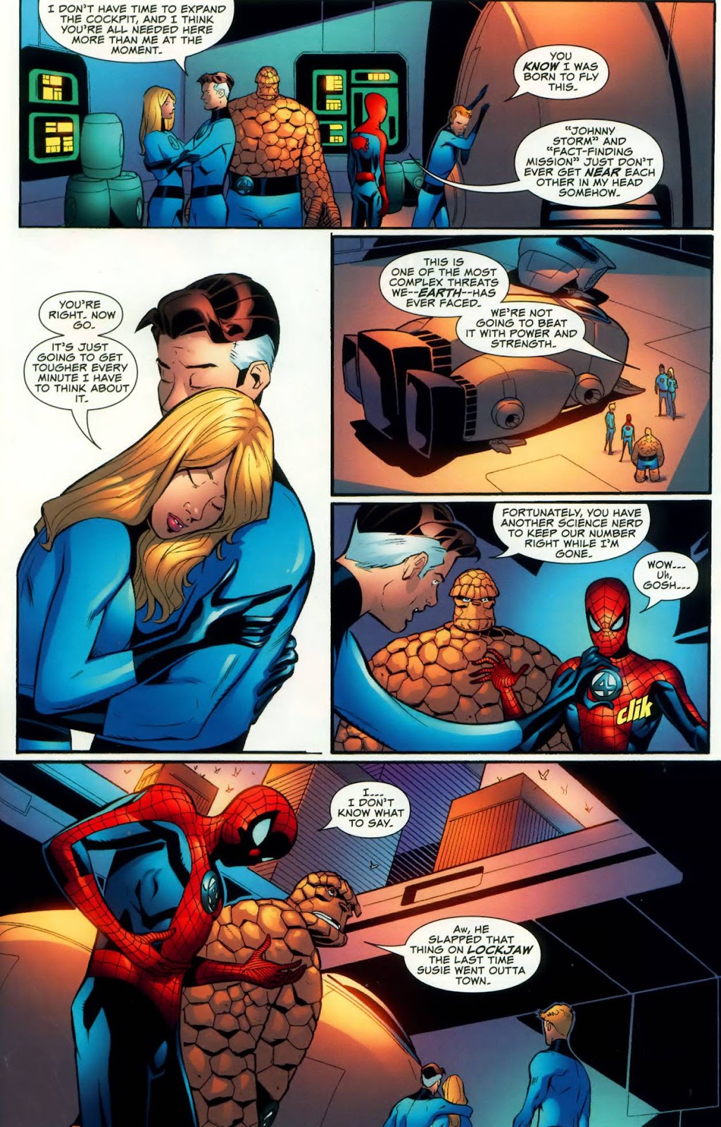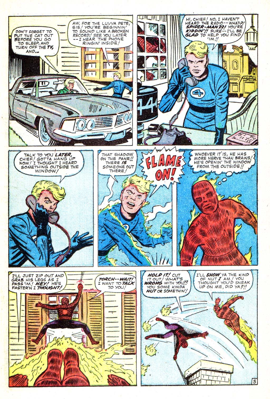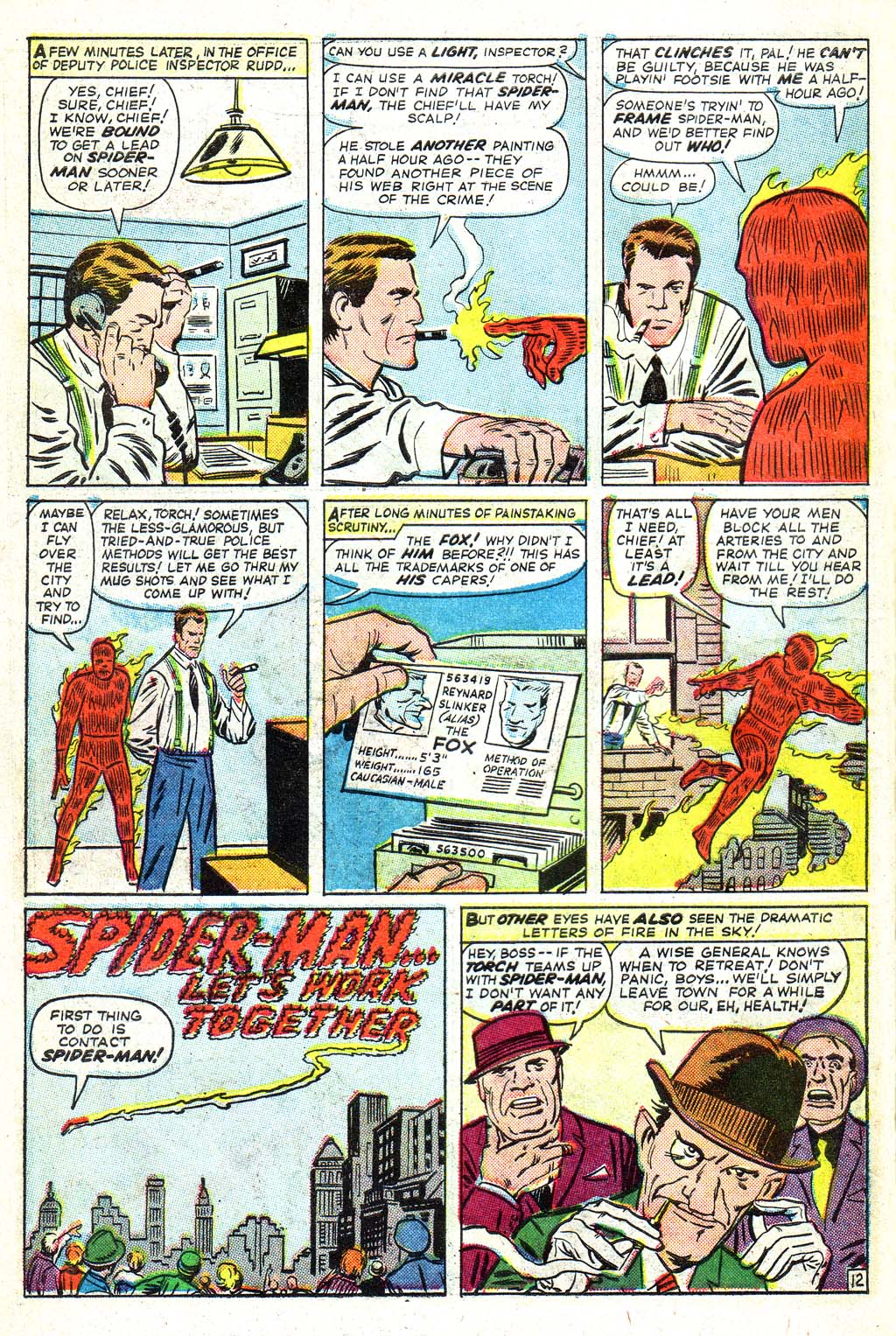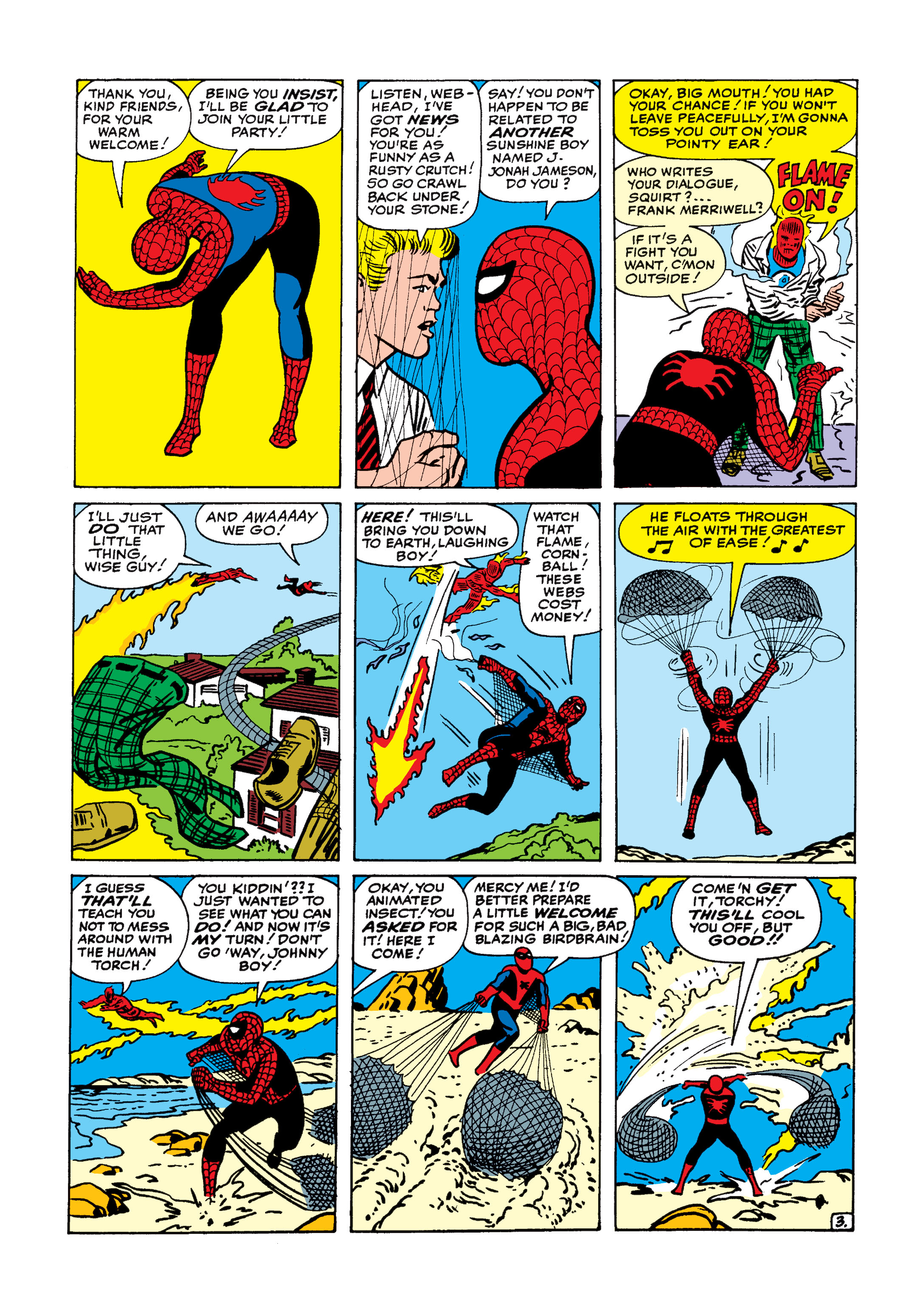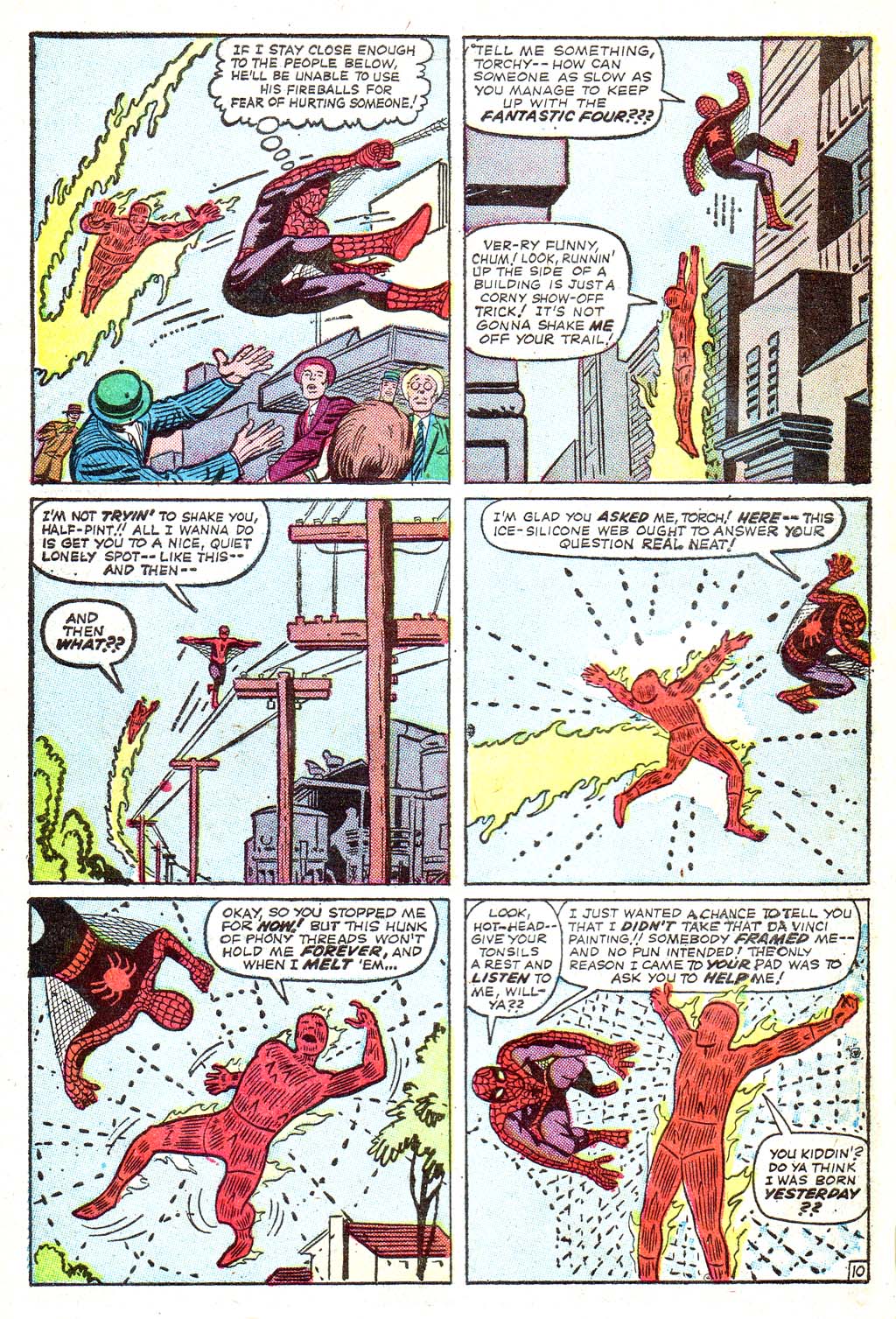 Spider-Man also favorably scales in speed to the Fantastic Four. Spider-Man has stated that his speed and reaction time are better then the Fantastic Four and avoided attacks from Super Skrull who has the powers of the Fantastic Four. He's dodged blows from The Thing and Mr. Fantastic but the real comparison is with his long time friendly rival The Human Torch. Early on Spider-Man was clearly faster. He's avoided his fire blast normally, dodges numerous fire blasts, dodged his fire spear, kept from being outpaced in a chase, avoids the attacks of the brainwashed Human Torch and dodged fire blasts from numerous Human Torch clones at once, with the Human Torch commenting he's never seen someone move so fast. By this point The Human Torch already had hypersonic+ feats and in the same issue he says he's never seen someone move so fast, he writes this giant fire message in the sky quickly. While it's unclear exactly how they compare in modern times, Spider-Man is clearly not massively slower then the Human Torch, able to wall-crawl at the speed Human Torch flies and able to dodges close range fire blasts from an enraged Human Torch. For comparison the Human Torch has his own microsecond feat reaching speeds of over Mach 9000, over 1% the speed of light. The feat of Spider-Man moving faster then anyone The Human Torch had ever seen happened in December 1963 while the Human Torch's Sub-Relativistic Feat happened in January 1964. I am NOT kidding.