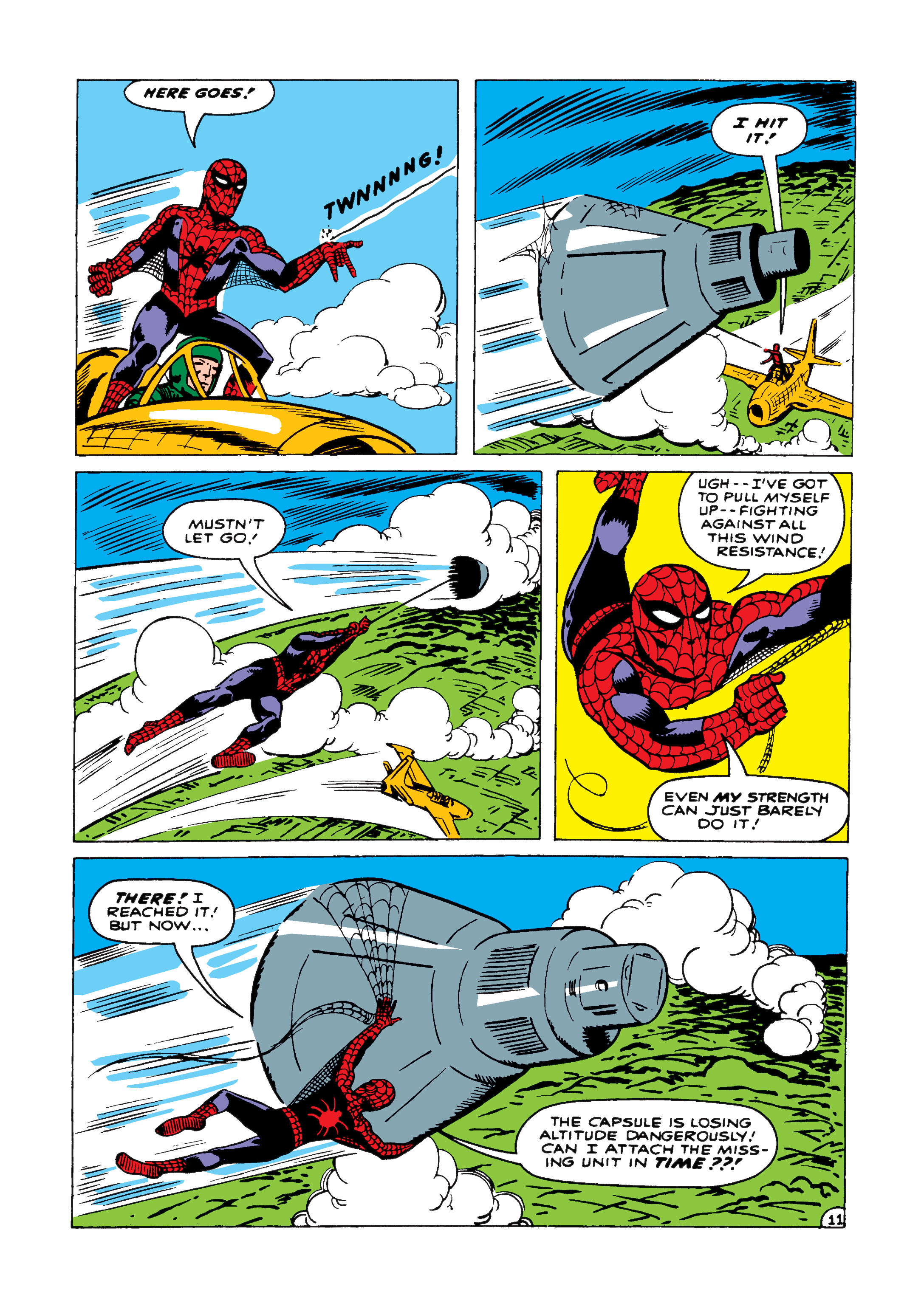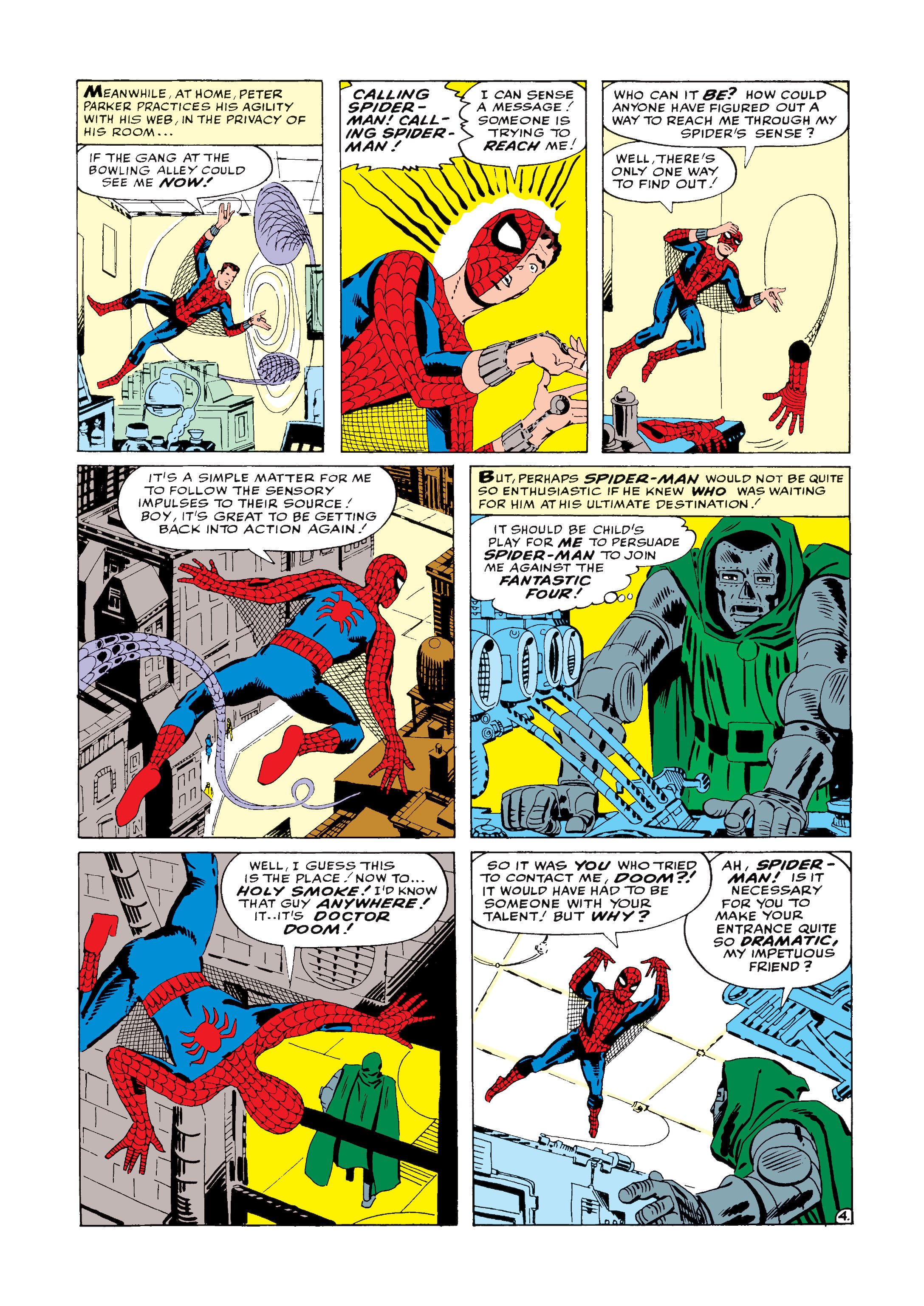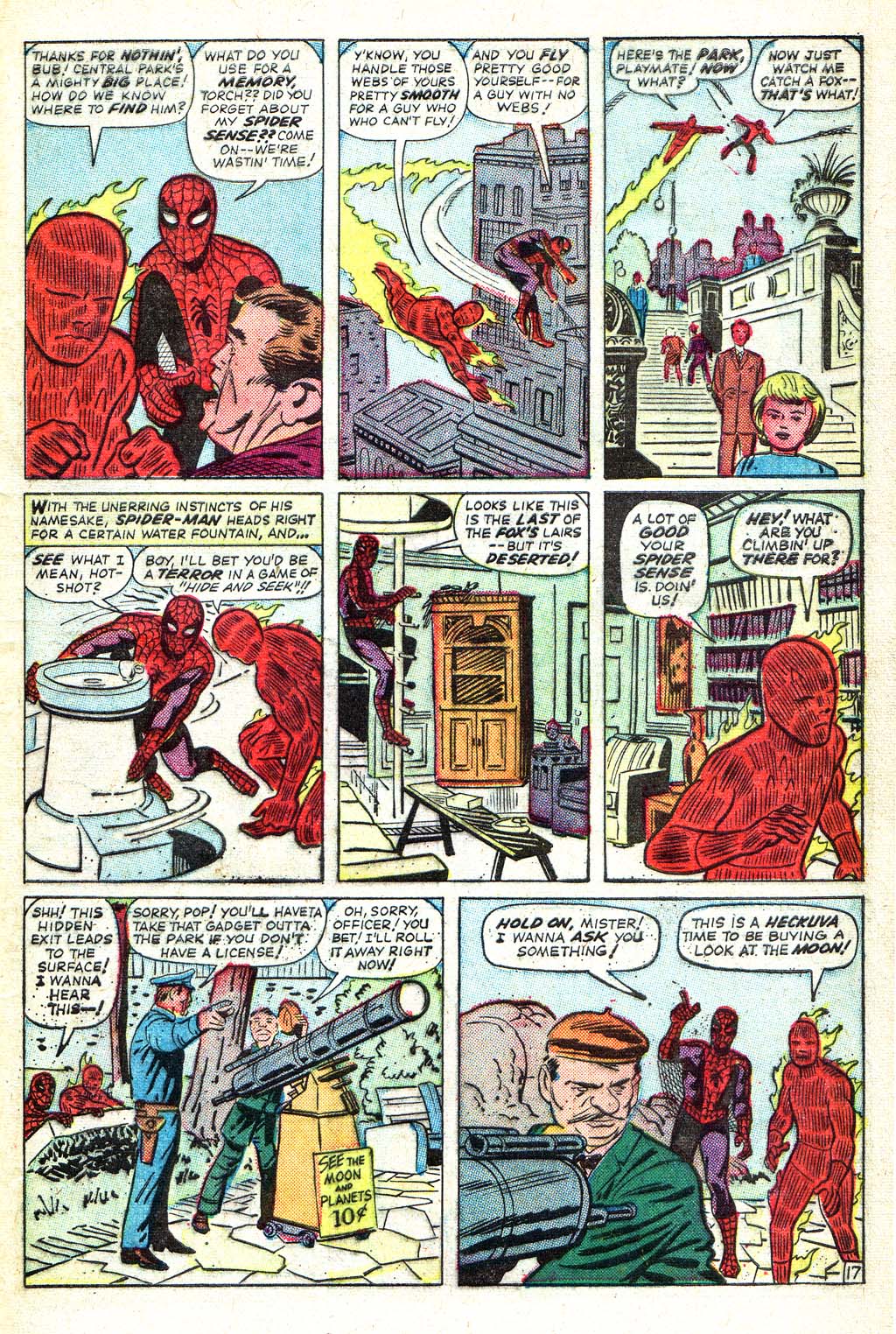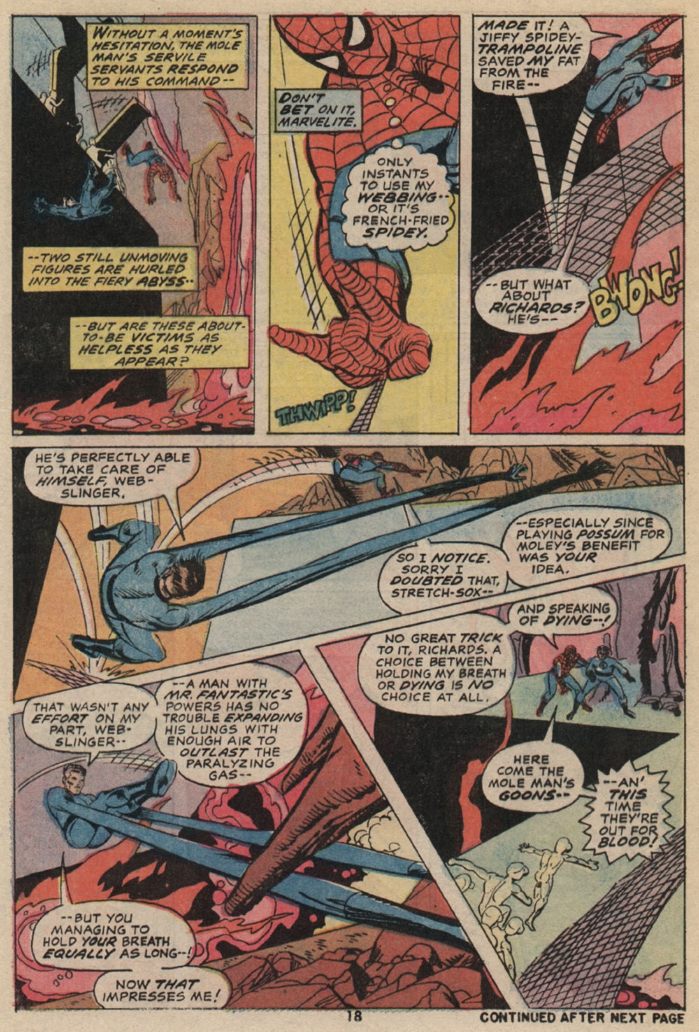 Spider-Man also favorably scales in speed to the Fantastic Four. Spider-Man has stated that his speed and reaction time are better then the Fantastic Four and avoided attacks from Super Skrull who has the powers of the Fantastic Four. He's dodged blows from The Thing and Mr. Fantastic but the real comparison is with his long time friendly rival The Human Torch. Early on Spider-Man was clearly faster. He's avoided his fire blast normally, dodges numerous fire blasts, dodged his fire spear, kept from being outpaced in a chase, avoids the attacks of the brainwashed Human Torch and dodged fire blasts from numerous Human Torch clones at once, with the Human Torch commenting he's never seen someone move so fast. By this point The Human Torch already had hypersonic+ feats and in the same issue he says he's never seen someone move so fast, he writes this giant fire message in the sky quickly. While it's unclear exactly how they compare in modern times, Spider-Man is clearly not massively slower then the Human Torch, able to wall-crawl at the speed Human Torch flies and able to dodges close range fire blasts from an enraged Human Torch. For comparison the Human Torch has his own microsecond feat reaching speeds of over Mach 9000, over 1% the speed of light. The feat of Spider-Man moving faster then anyone The Human Torch had ever seen happened in December 1963 while the Human Torch's Sub-Relativistic Feat happened in January 1964. I am NOT kidding.