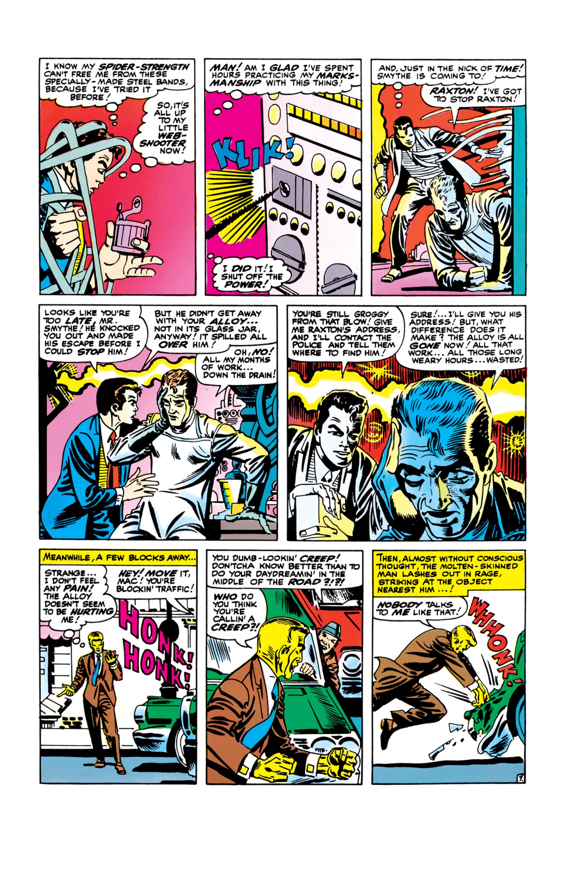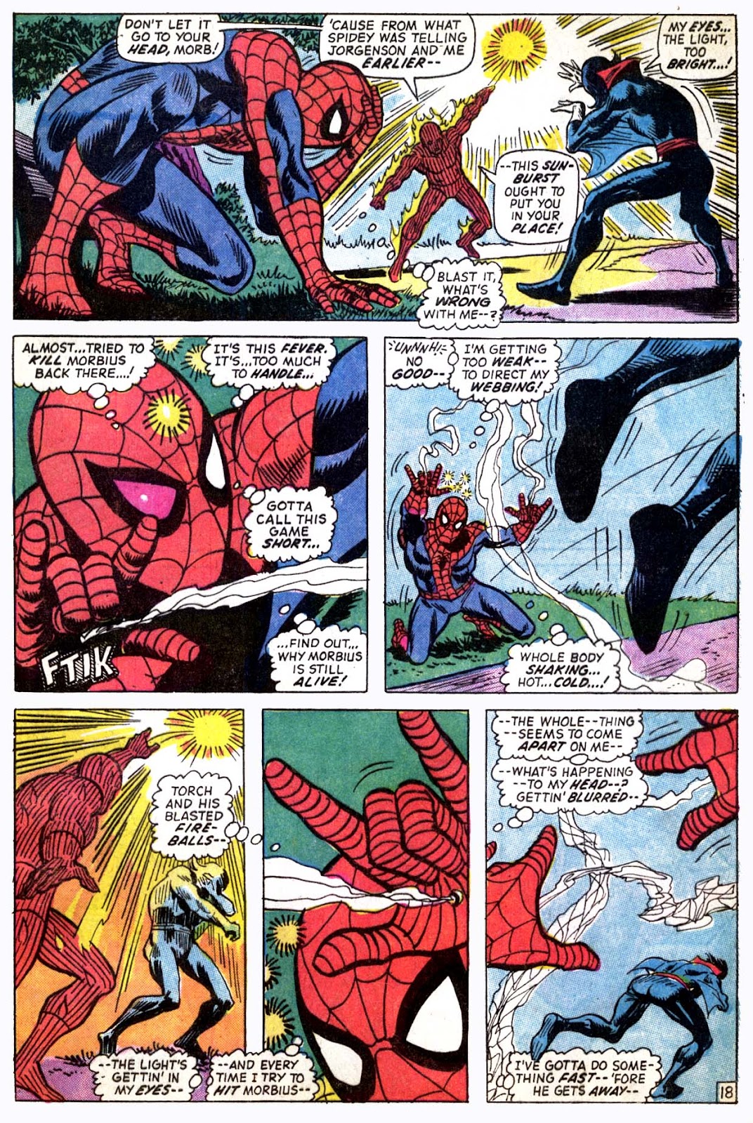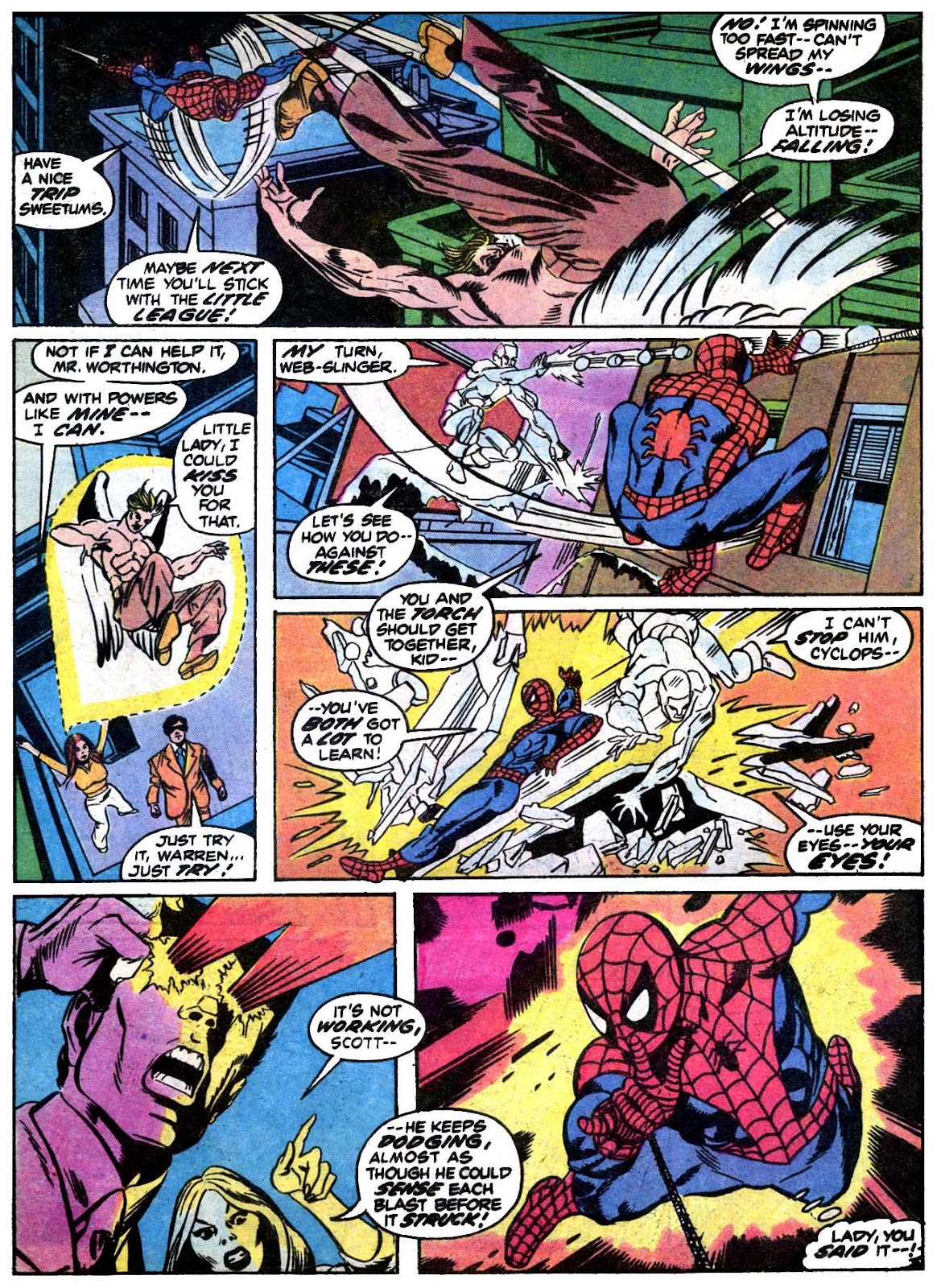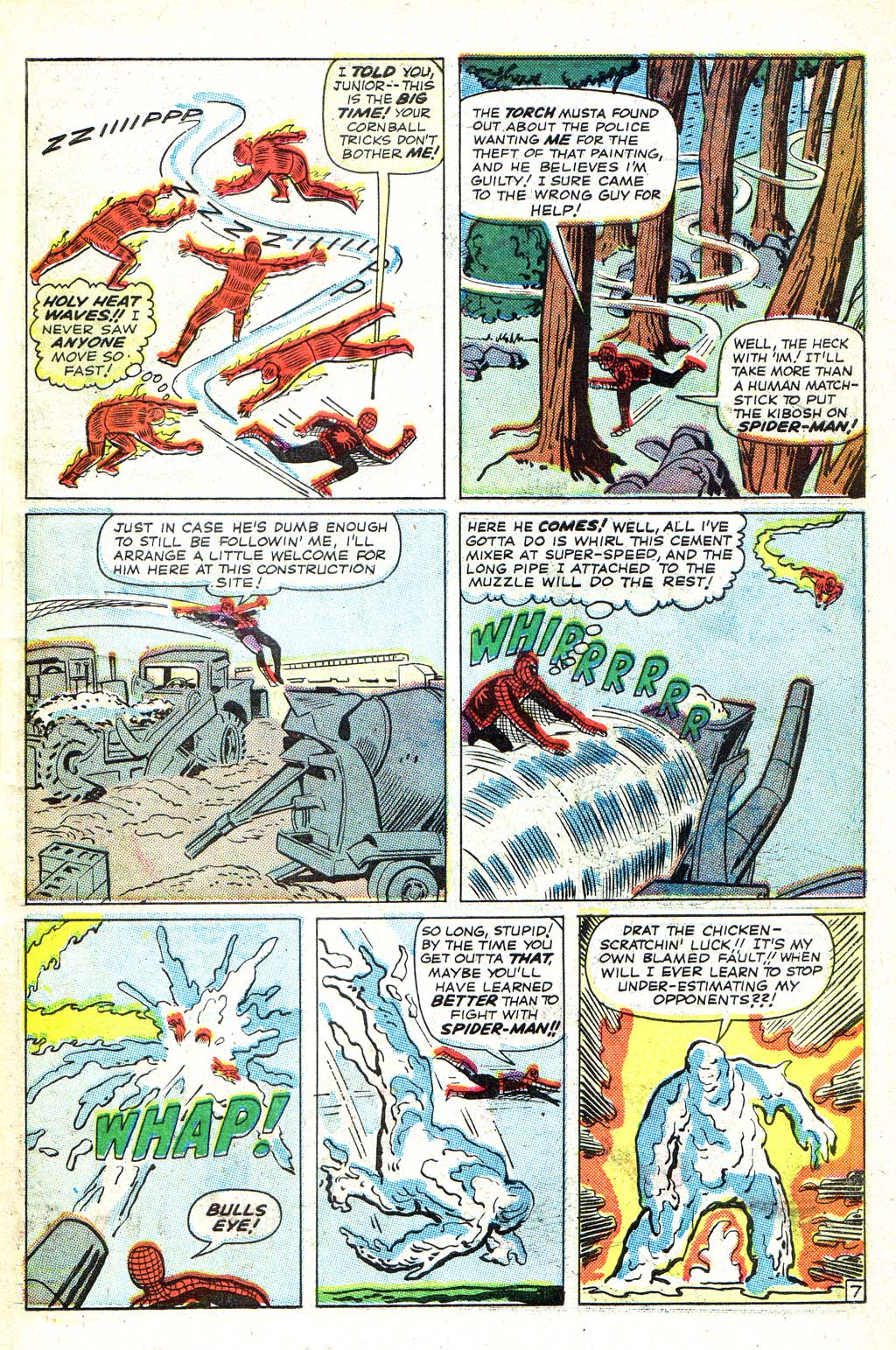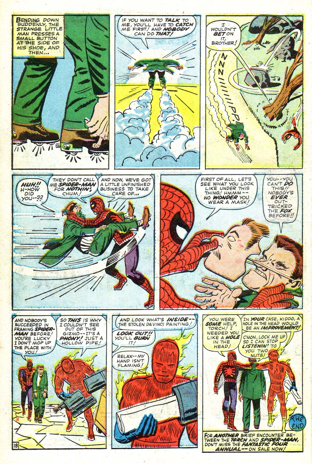 Spider-Man also favorably scales in speed to the Fantastic Four. Spider-Man has stated that his speed and reaction time are better then the Fantastic Four and avoided attacks from Super Skrull who has the powers of the Fantastic Four. He's dodged blows from The Thing and Mr. Fantastic but the real comparison is with his long time friendly rival The Human Torch. Early on Spider-Man was clearly faster. He's avoided his fire blast normally, dodges numerous fire blasts, dodged his fire spear, kept from being outpaced in a chase, avoids the attacks of the brainwashed Human Torch and dodged fire blasts from numerous Human Torch clones at once, with the Human Torch commenting he's never seen someone move so fast. By this point The Human Torch already had hypersonic+ feats and in the same issue he says he's never seen someone move so fast, he writes this giant fire message in the sky quickly. While it's unclear exactly how they compare in modern times, Spider-Man is clearly not massively slower then the Human Torch, able to wall-crawl at the speed Human Torch flies and able to dodges close range fire blasts from an enraged Human Torch. For comparison the Human Torch has his own microsecond feat reaching speeds of over Mach 9000, over 1% the speed of light. The feat of Spider-Man moving faster then anyone The Human Torch had ever seen happened in December 1963 while the Human Torch's Sub-Relativistic Feat happened in January 1964. I am NOT kidding.