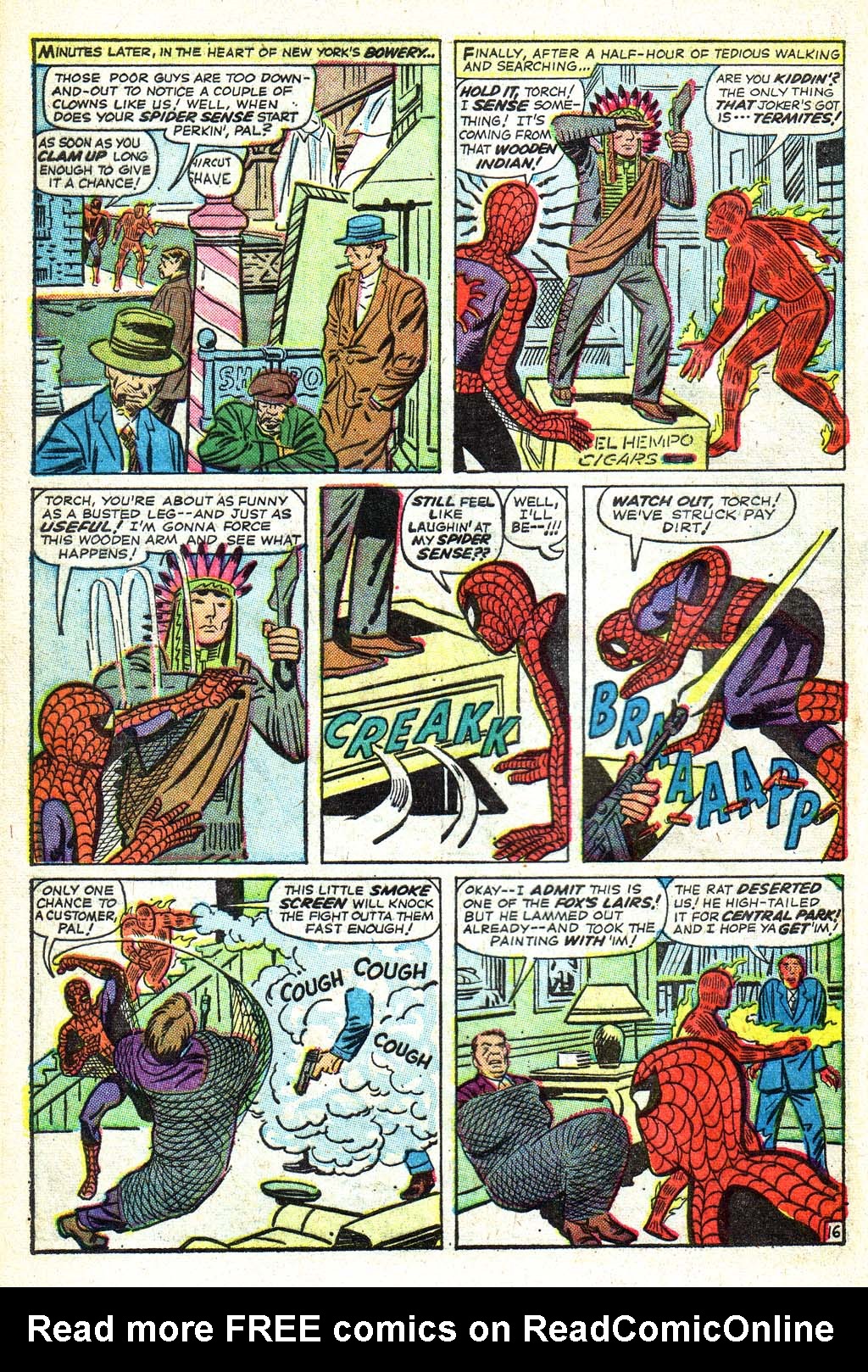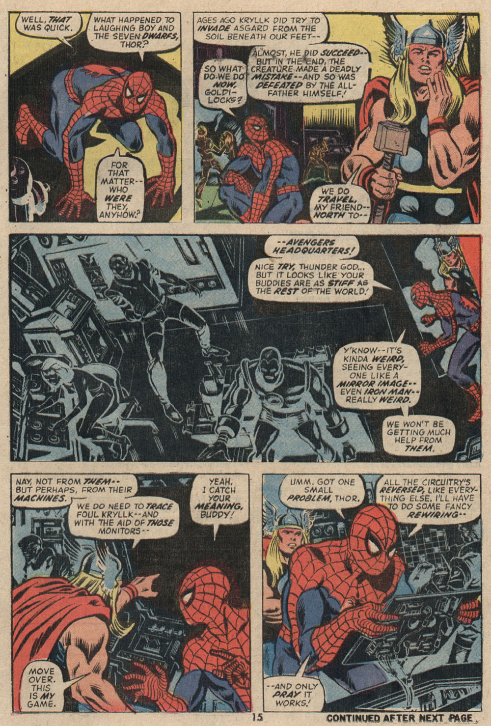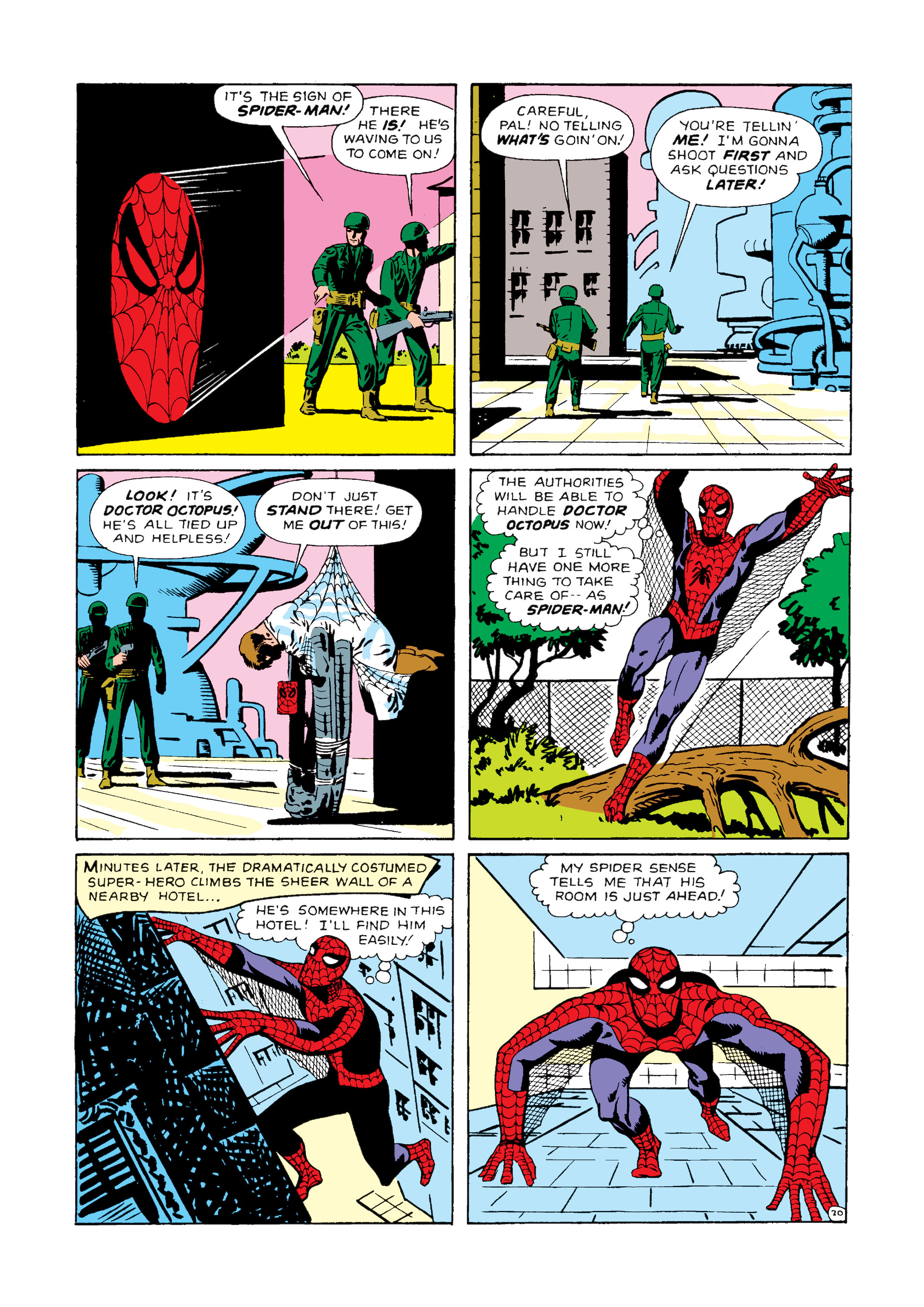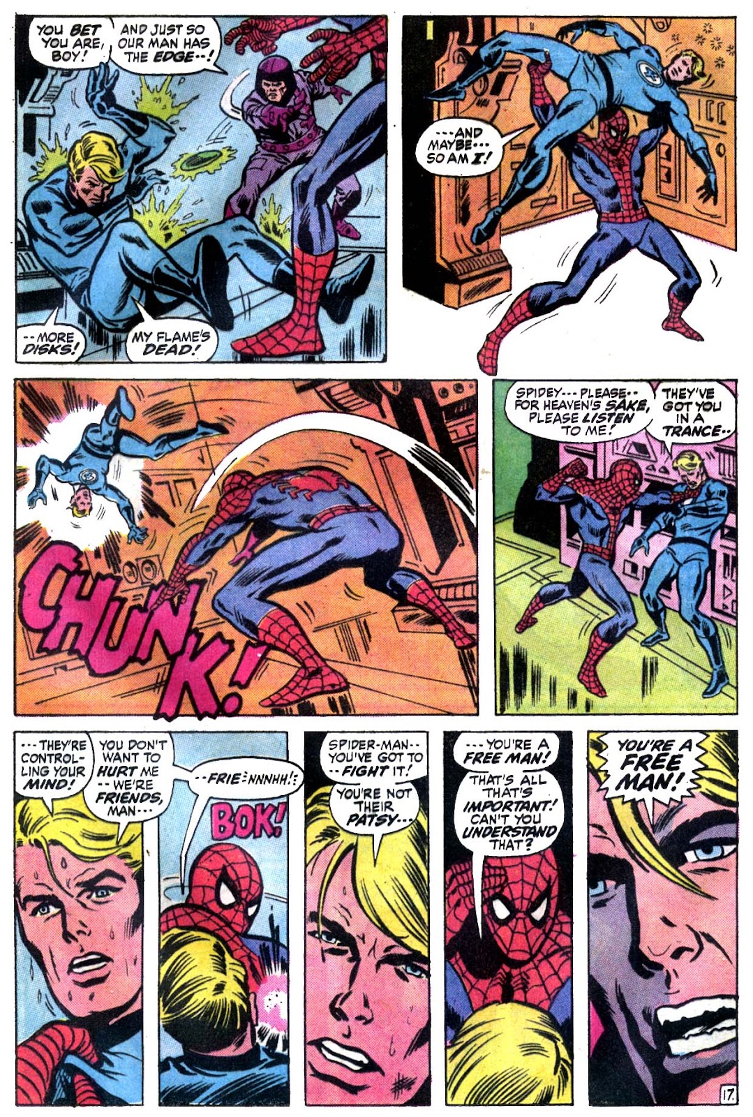 Spider-Man also favorably scales in speed to the Fantastic Four. Spider-Man has stated that his speed and reaction time are better then the Fantastic Four and avoided attacks from Super Skrull who has the powers of the Fantastic Four. He's dodged blows from The Thing and Mr. Fantastic but the real comparison is with his long time friendly rival The Human Torch. Early on Spider-Man was clearly faster. He's avoided his fire blast normally, dodges numerous fire blasts, dodged his fire spear, kept from being outpaced in a chase, avoids the attacks of the brainwashed Human Torch and dodged fire blasts from numerous Human Torch clones at once, with the Human Torch commenting he's never seen someone move so fast. By this point The Human Torch already had hypersonic+ feats and in the same issue he says he's never seen someone move so fast, he writes this giant fire message in the sky quickly. While it's unclear exactly how they compare in modern times, Spider-Man is clearly not massively slower then the Human Torch, able to wall-crawl at the speed Human Torch flies and able to dodges close range fire blasts from an enraged Human Torch. For comparison the Human Torch has his own microsecond feat reaching speeds of over Mach 9000, over 1% the speed of light. The feat of Spider-Man moving faster then anyone The Human Torch had ever seen happened in December 1963 while the Human Torch's Sub-Relativistic Feat happened in January 1964. I am NOT kidding.