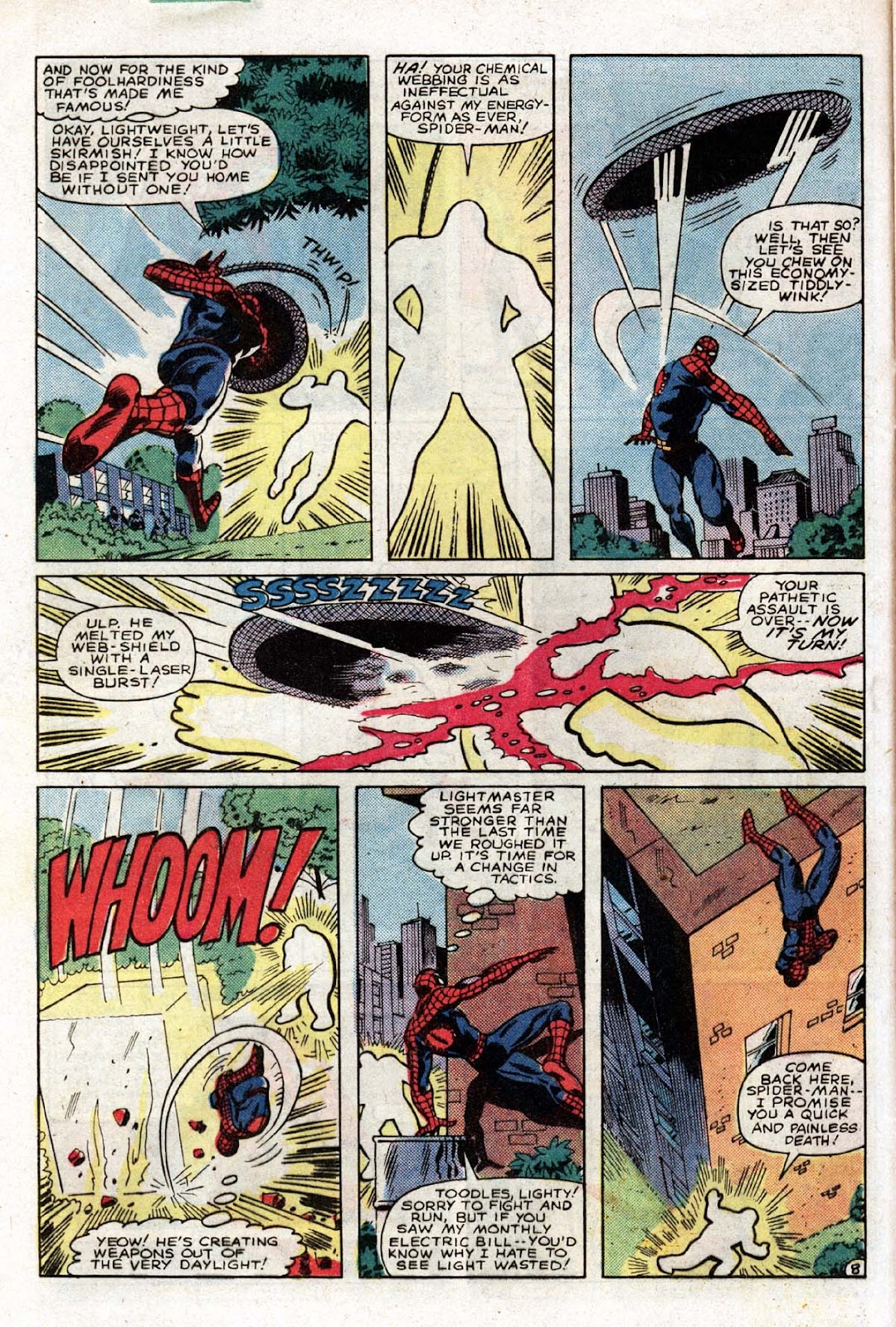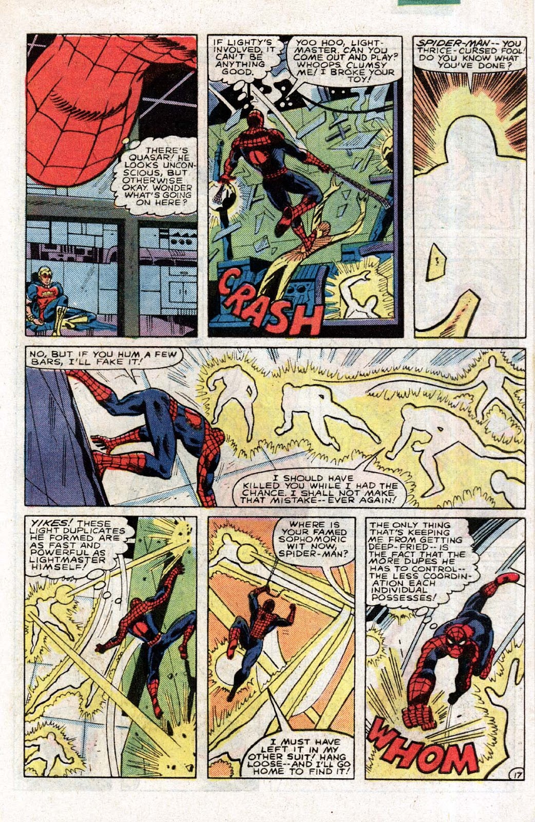 Spider-Man also has a few more scattered feats of reacting and dodging things that move at lightspeed outside of light specifically . He can explictly see Speed Demon moving, even if he can't hit him with Speed Demon scaling to the aforementioned FTL mutant Quicksilver in the same story as well as dodged Speed Demon trying to blitz him with a superleap. He's dodged Dagger's light knives at close range, was able to dodge with high difficulty beams that explictly were moving at light speed and was able to web swing away from Arno Stark's repulsor ray. This is relevant because if they are at all similar to Tony Stark's repulsor rays, then they should be light speed as Tony's have numerous times been noted to move at lightspeed. Also when Will-o-the-Wisp shot a hypnotizing light at Spider-Man at close range, Spidey was able to recognize the threat and turn his head away before it reached him.