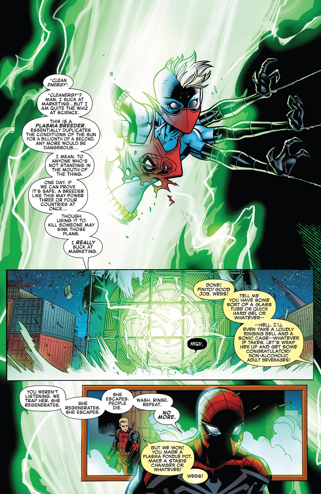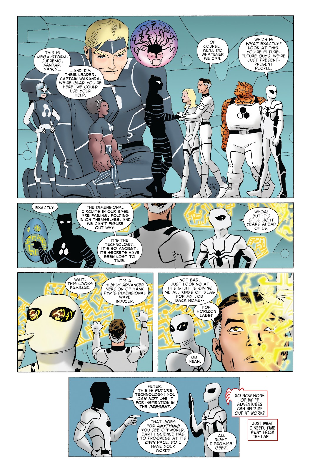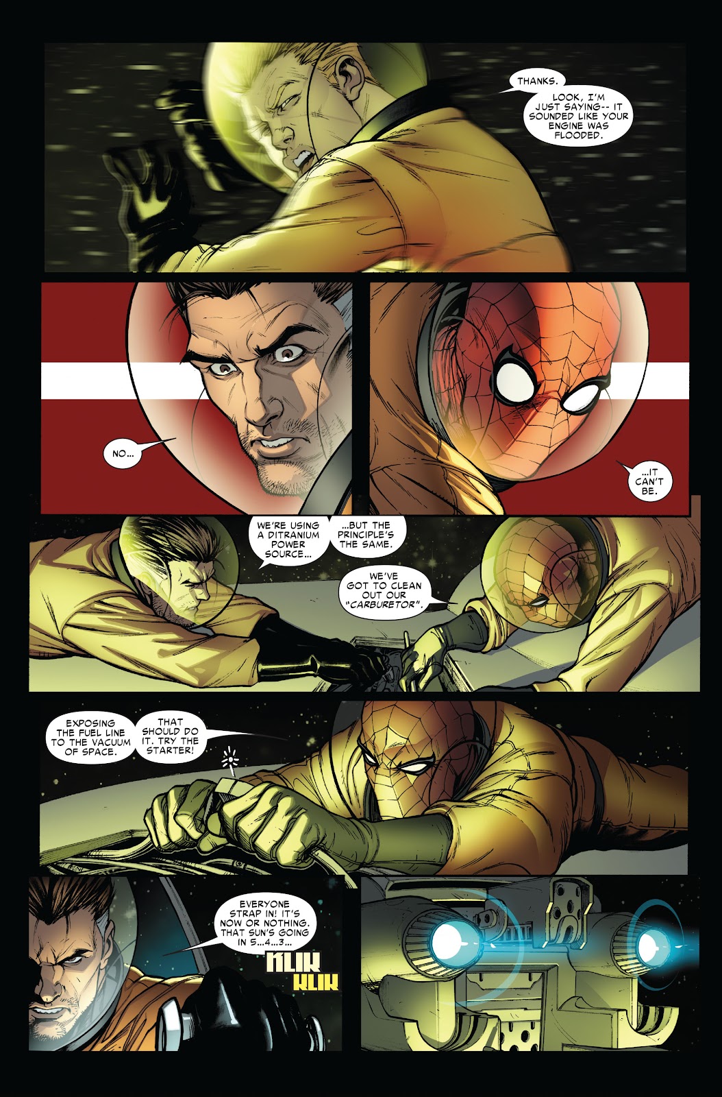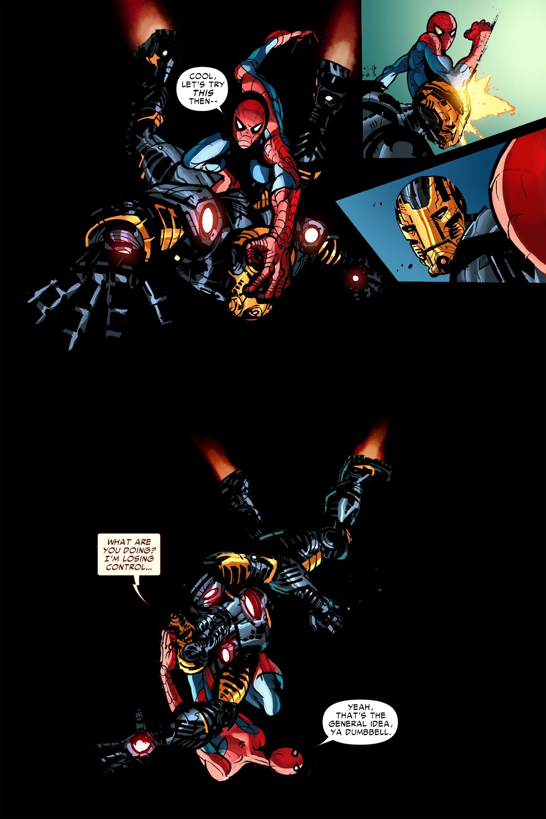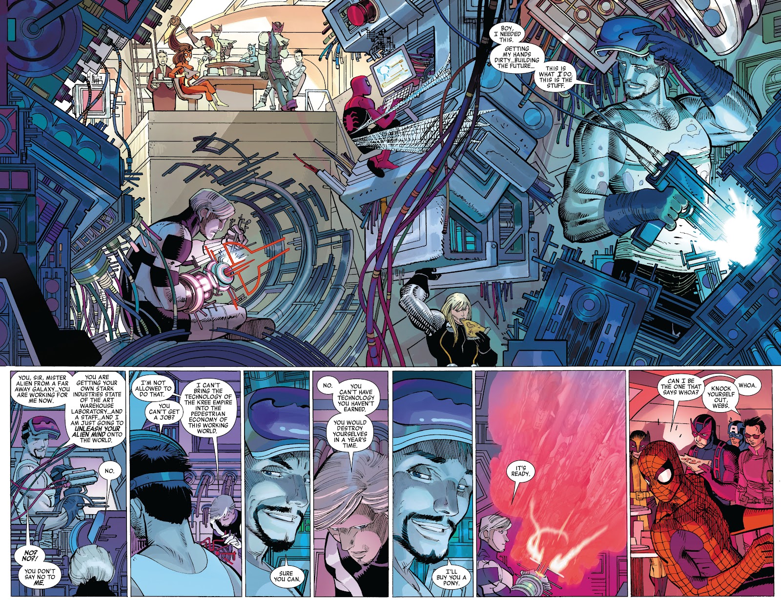 Type 2 (Stellar Scale civilization with tech using science we don't currently understand): Spider-Man has helped Reed fix his FTL spacecraft, even reaching the root of the problem at the same time as Reed, set up a detector for inter-dimensional portals and led the development of hard-light smart walls, auto-adjusting forcefields. Spider-Man was able to hack Tony Stark's systems from a home computer. I don't know how good Tony's security systems are but given he's invented at least type 3 technology, I have to assume it's at least type 2 level, a type 2 civilization using 10,000,000,000 times less energy then a type 3 civilization for comparison. Similarly Spider-Man has built his own repulsor rays, reverses the effect of a Starktech memory eraser, and disabled Iron Patriot's uni-beam mid-combat. Spider-Man has figured out the technology of Kang the Conqueror who comes from the 31st century (while contempary estimates suggest we will reach Type 1 in a few hundred years, Type 2 in a few thousands and Type 3 between 100,000 and a million years). He also built a brain-swapping device while he was inside of Doctor Octopus' rapidly dying body.