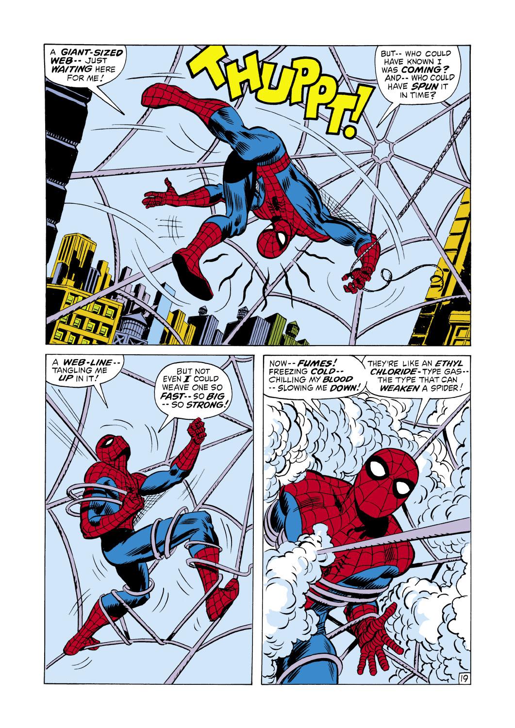 Spider-Man's primary weakness physically has always been biological forms of attacks. Because his powers are so closely tied to his biology, being sick drastically depowers him which was often used as a source of drama in the early issues. As he put it, viruses are the one thing his spider-strength can't fight. Most famous is the Ethyl Chloride, a substance used to kill spiders that weakens him. His tech doesn't always work right either, as mentioned the chip he implanted in his brain failed to do it's purpose, water can clog his web-spinner as can extreme temperatures, without the Other power-up he can run out of webbing, and his spider-tracers have limited range he can detect them at. There's also a reason he doesn't go into every fight all jacked up in anger and determination but instead goes in joke-y. Spider-Man's anger can drown out the Spider-Sense as his instincts for survival are overriden by a drive to beat someone's face in. Haste, fatigue and general distractions can also keep him from noticing the ol' spider-sensed ringing.