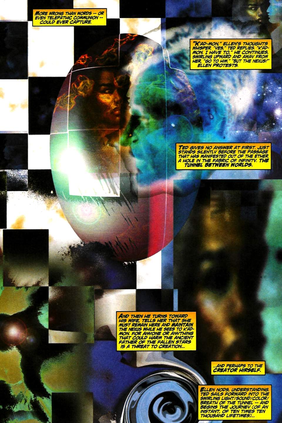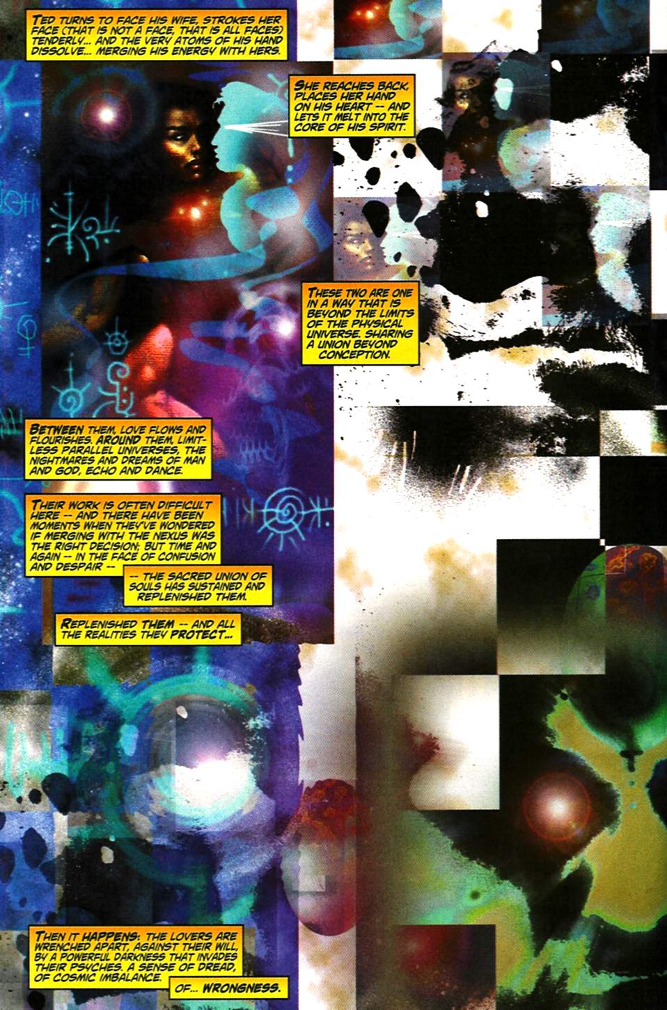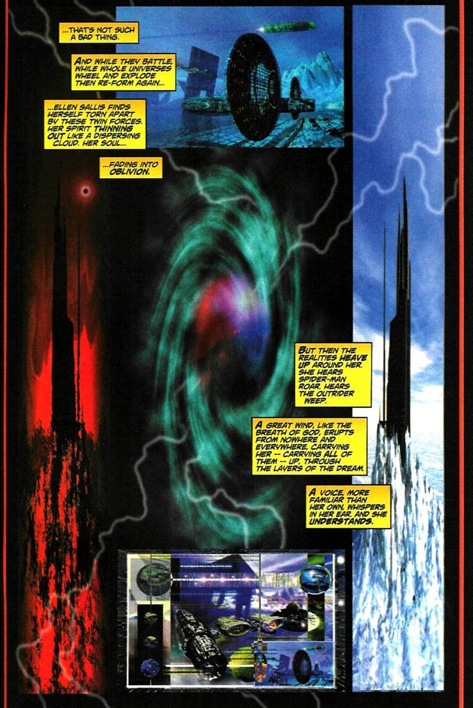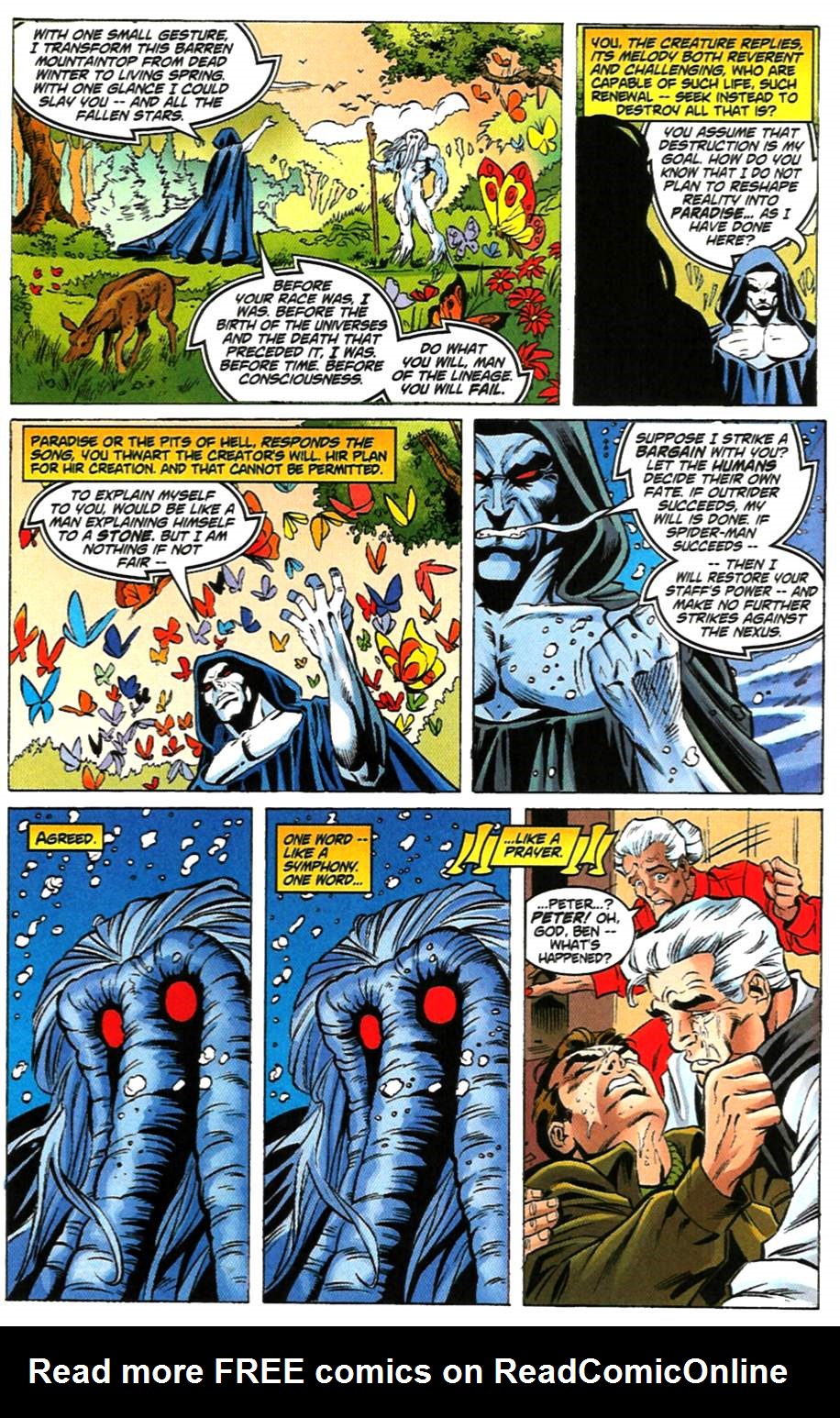 This feat takes place in Peter Parker: Spider-Man 1999 Annual: "Song of the Man-Thing". There exists in Marvel a transcendent realm called the Nexus of All Realities. The nexus is every place and every world, as well as no place and no world, the intersection of every universe. It encompasses all thoughts and dreams, a place where even sanity and logic dissolve. Every single thought and dream of all creatures alive and dead creates universes without limit in the Nexus of All Realities, containing and protecting all the infinite realities. Threats to the Nexus of All Realities are threats to all of creation and even perhaps to the Creator (likely the One Above All). It came to pass the villain Scrier attained the staff of God, used to create all things and with it planned to manipulate the Nexus of All Realities, warping every reality on every plane of existence. Of all people, Spider-Man was chosen to save the Nexus. Scrier's minion Outrider had fused with the Nexus and Spider-Man in a desperate instinct threw himself into the core, the two consciousness taking the strain of all Being on their wills. The two wills battled for the soul of creation, flung beyond the physical and quantum realms into the reality beyond all others that underpins all realities. Without Scrier and Man-Thing's support the two surely would have been destroyed. Desperate to stay sane and push through Spider-Man's mind reached out for something and found his love. A wife's tenderness, a friend's loyalty, an aunt' compassion, an uncle's inspiration. His will to saves them ripples across the quantum sea, stronger then any physical blow could ever be, to batter the Outrider. Spider-Man gives a roar of determination while realities heave around them, flinging them through the layers of dream. Spider-Man's will had won. This was not the doing of the Man-Thing, for he and Scrier had agreed to not intervene, to allow the two humans to decide whose philosophy was right by the battle of their wills and the Man-Thing only intervened to save Ellen Sallis which was after the battle had concluded. Spider-Man will was so strong as to influence and warp the Nexus of All Realities, a transcendent plane of being encompassing all of Marvel.