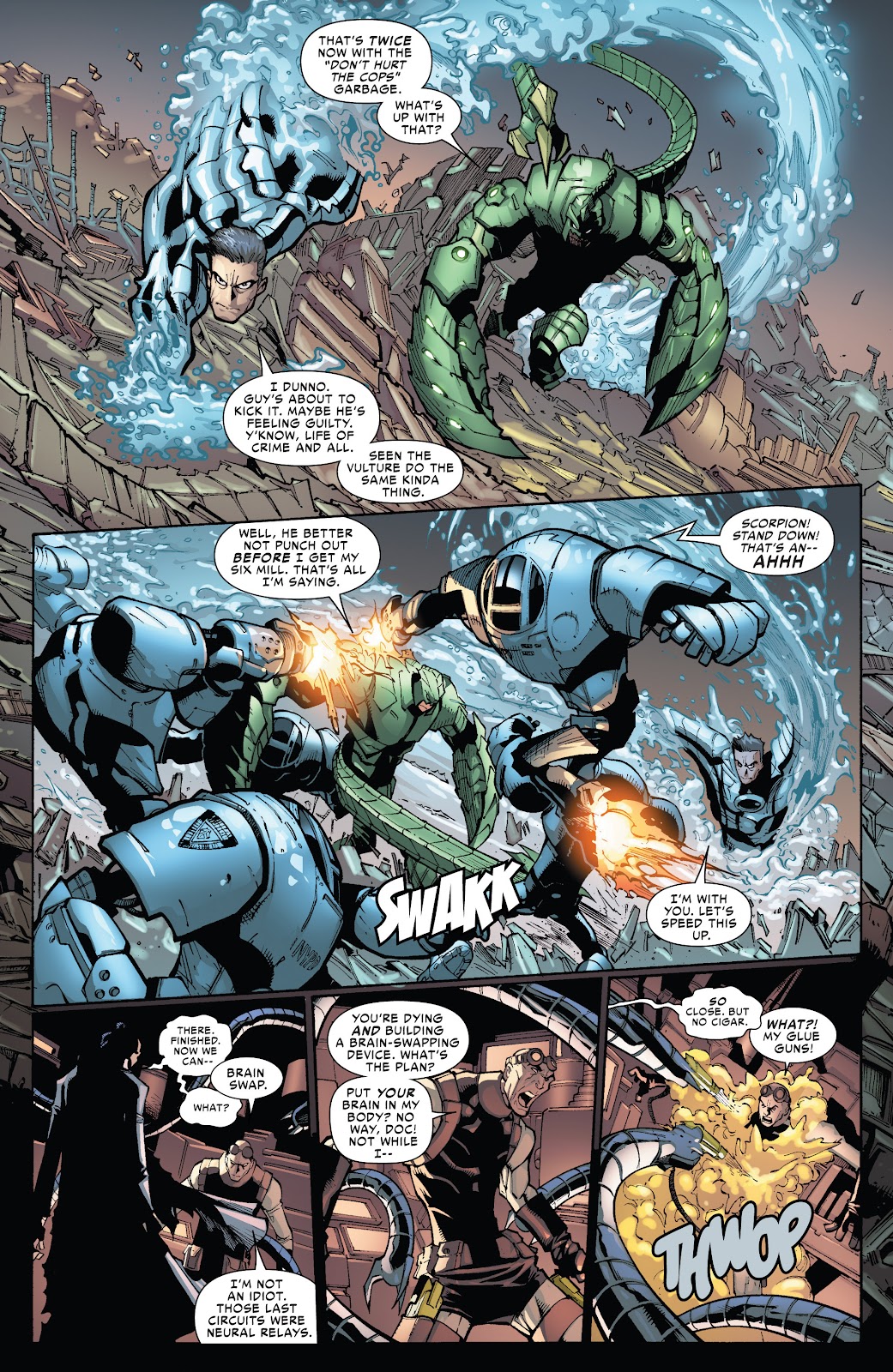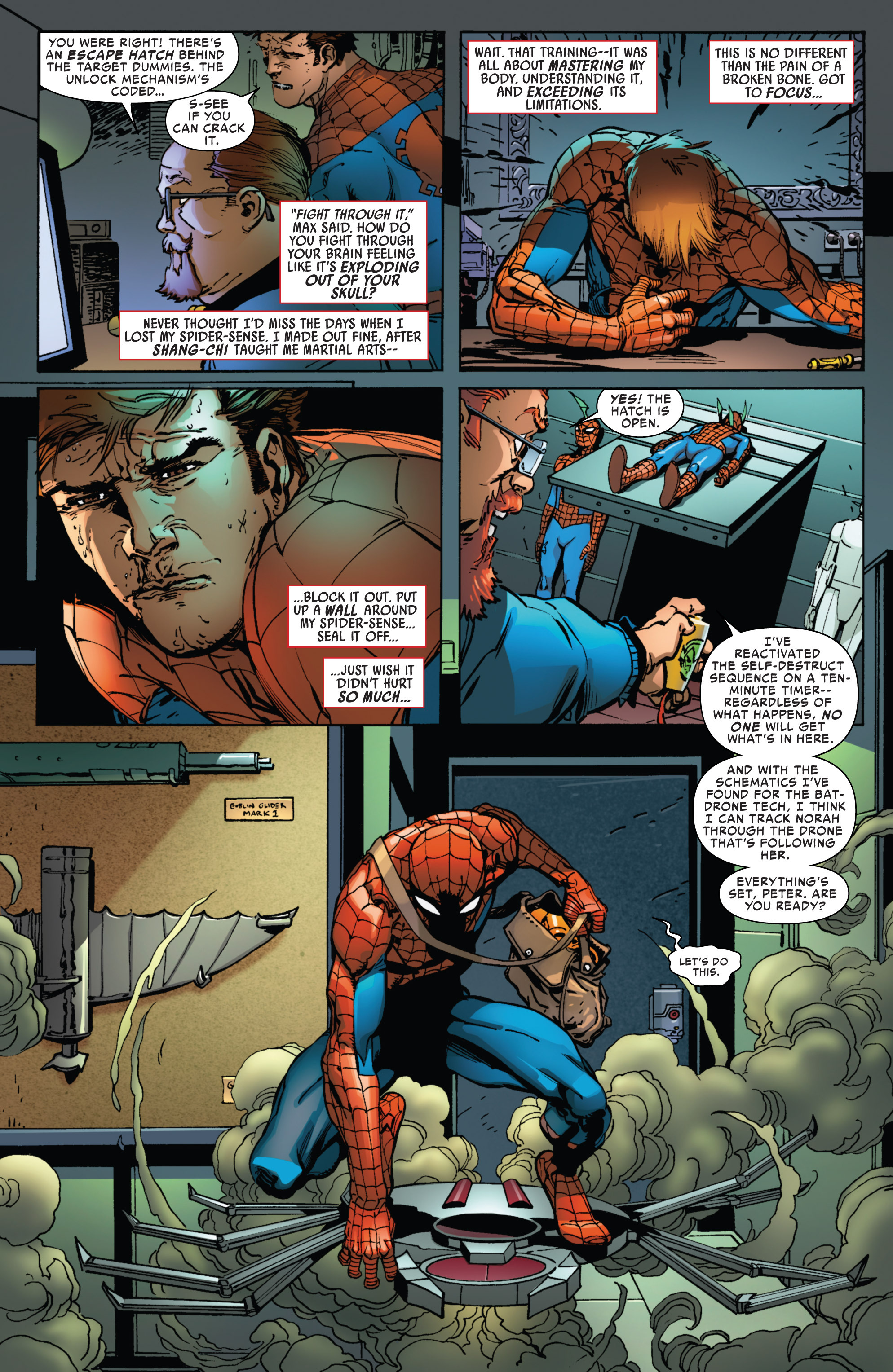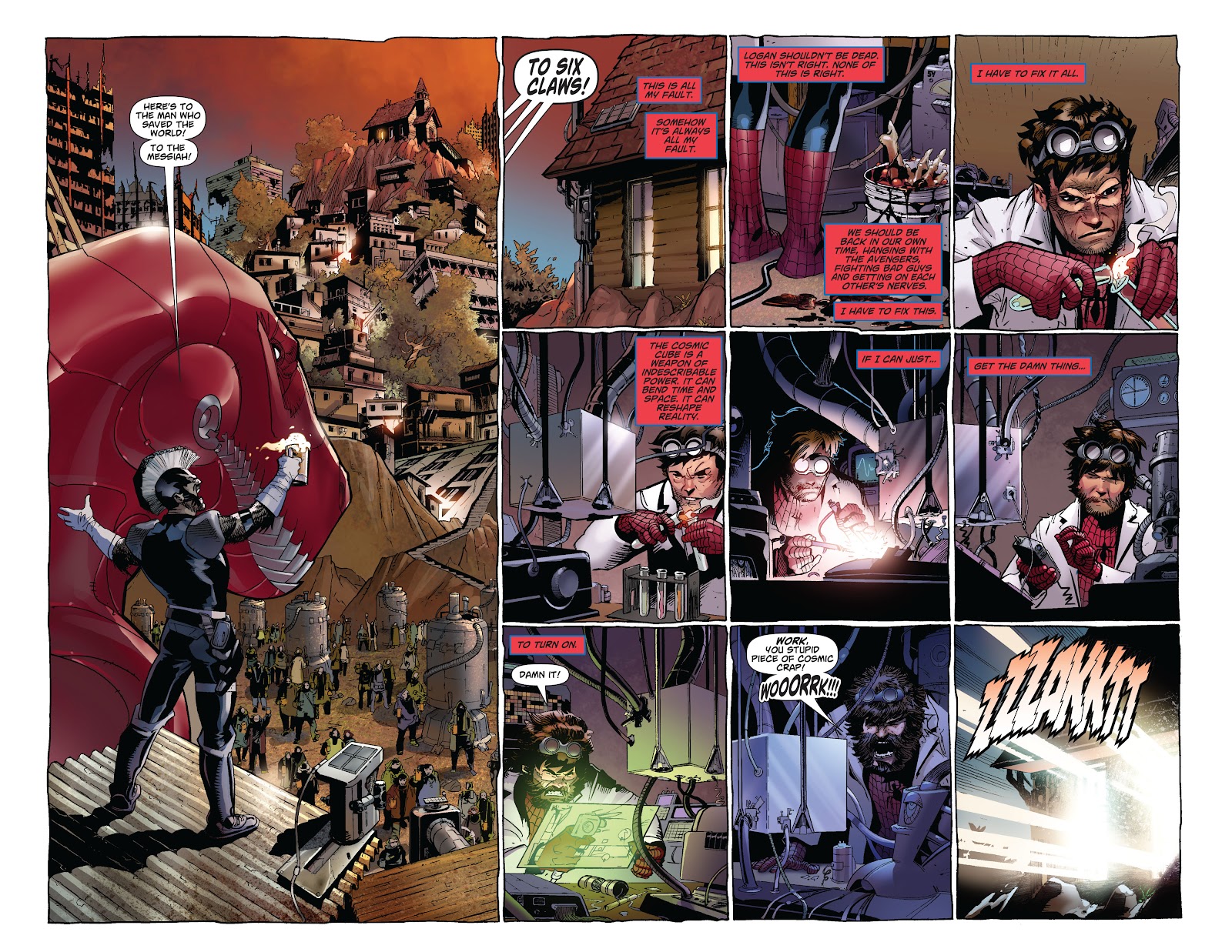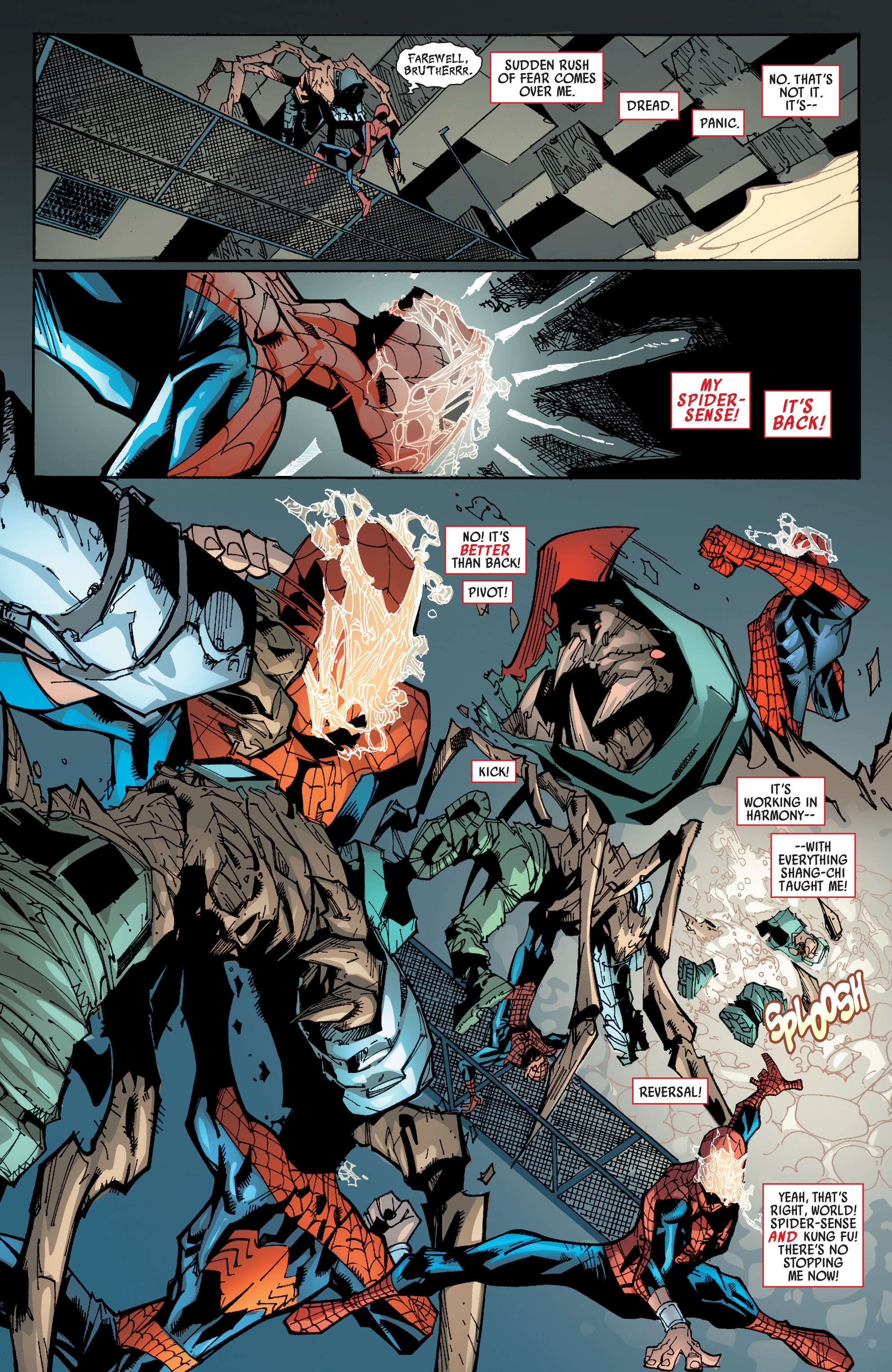 Speaking of fighting inside his minds and his soul's strength, both of those powers came back to note in the Superior Spider-Man series where Doctor Octopus had swapped both his and Spider-Man's minds and killed Spider-Man in his body so he could assume Spider-Man's identity. However Spider-Man's soul lingered there and kept Doctor Octopus from killing people. While it was difficult, he was able to even forcibly some of his body parts despite Otto being in control. Spider-Man's psyche regenerated within his mind and when Doctor Octopus's careless actions threatened an innocent child Spider-Man's soul forcibly took control saving him and challening Doctor Octopus to a fight inside his mind which Otto accepted. Otto tried to wipe away Spider-Man's mental body and battlefield (all his memories) but Spider-Man's will simply pushed back against it restoring them. Spider-Man and Doctor Octopus would battle in Spider-Man's mind, Spider-Man's mental body showing the ability to reality-warp his mental battleground before summoning mental projections of all his friends and loved ones, the source of his strength who collectively overwhelmed Doctor Octopus' mental body.
