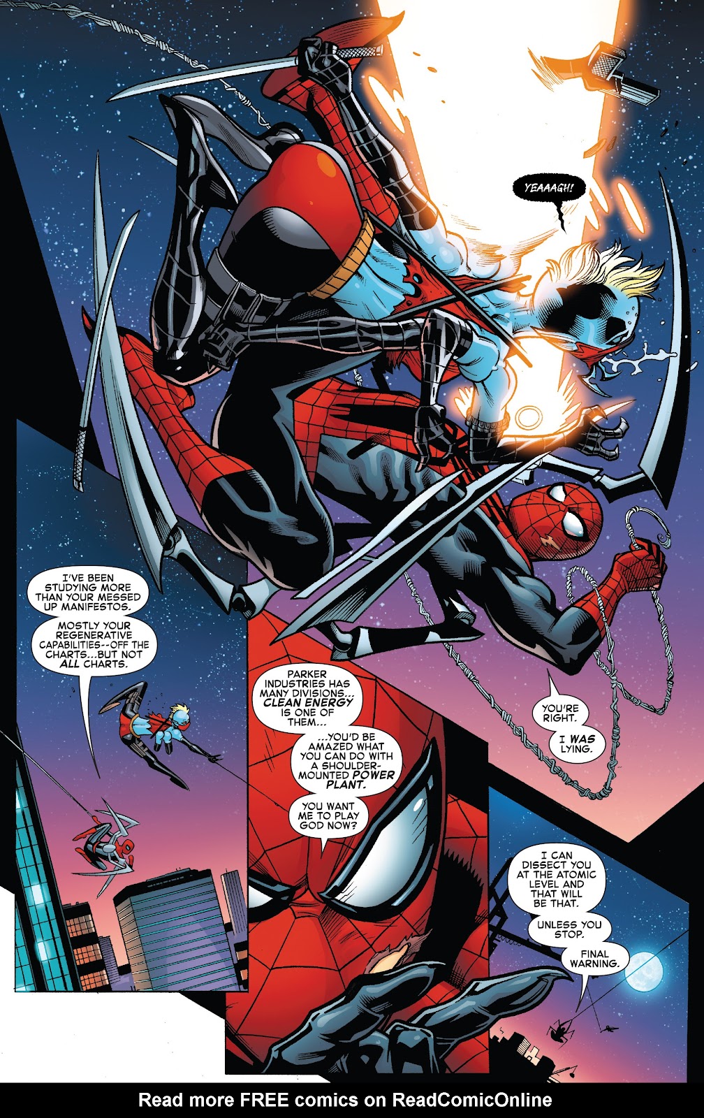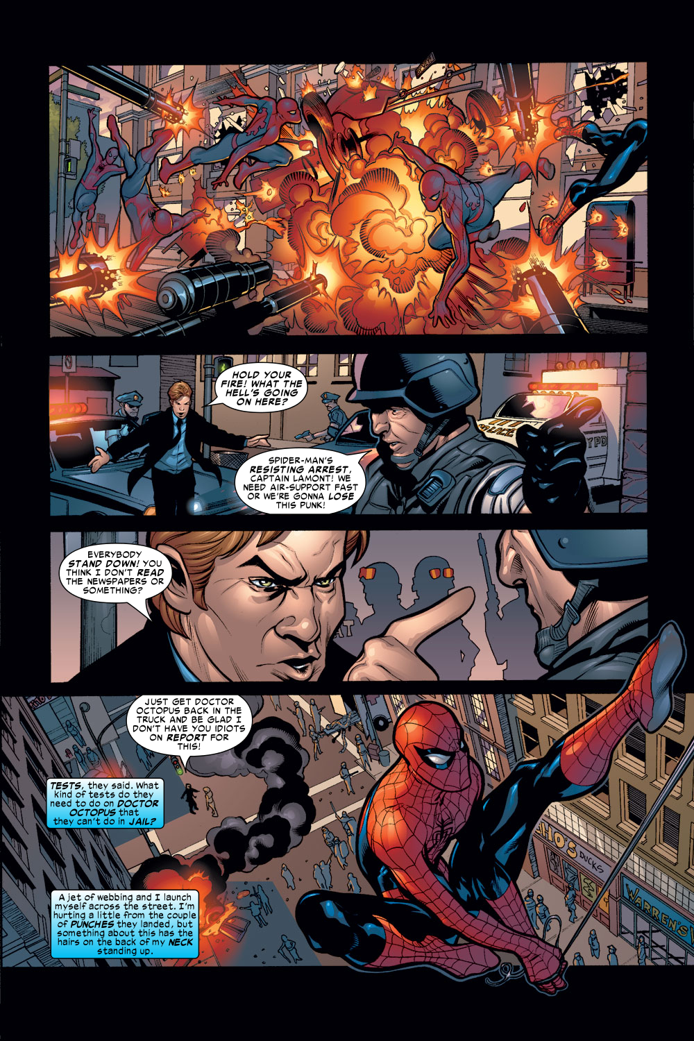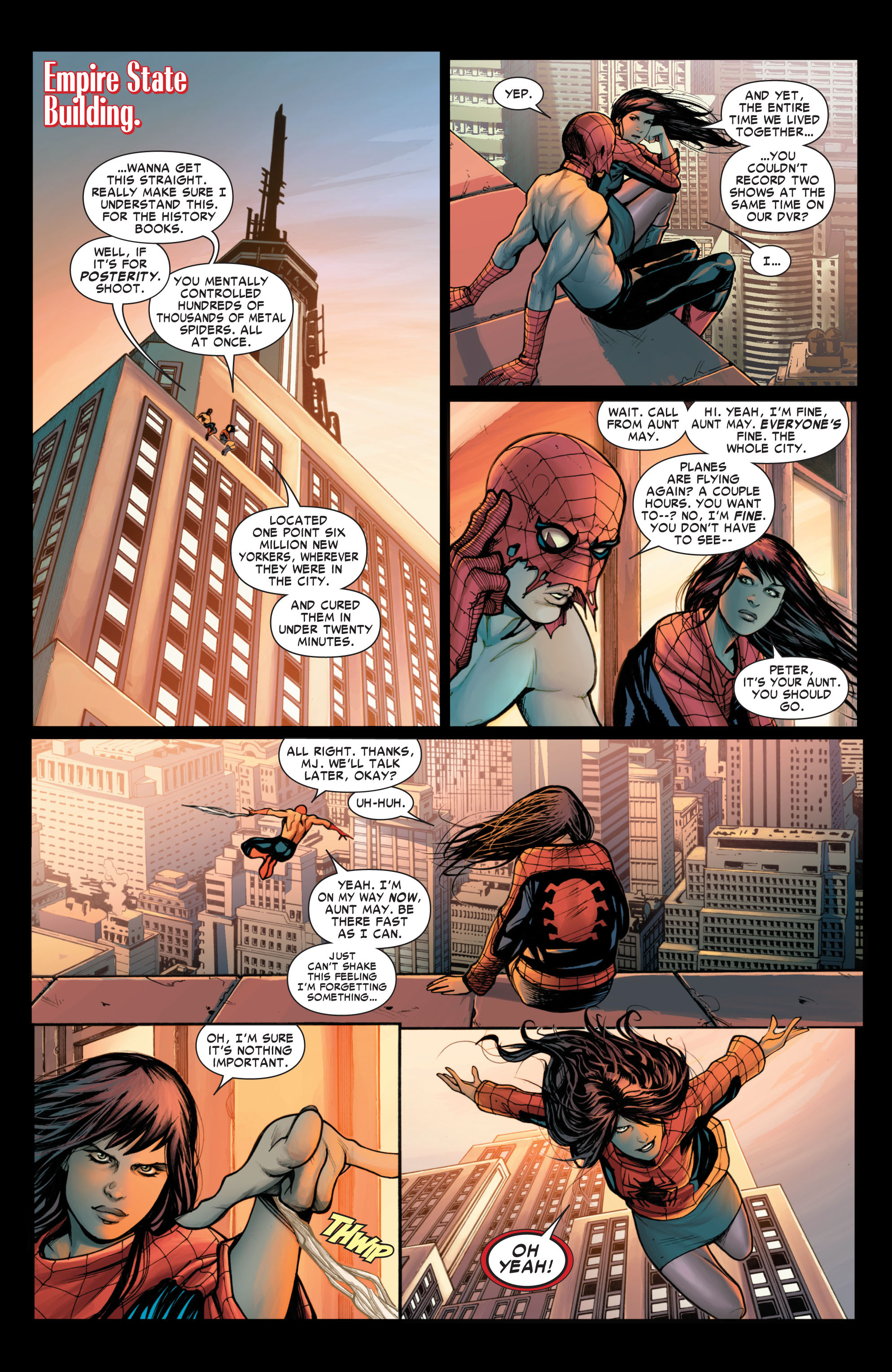 Speaking of fighting inside his minds and his soul's strength, both of those powers came back to note in the Superior Spider-Man series where Doctor Octopus had swapped both his and Spider-Man's minds and killed Spider-Man in his body so he could assume Spider-Man's identity. However Spider-Man's soul lingered there and kept Doctor Octopus from killing people. While it was difficult, he was able to even forcibly some of his body parts despite Otto being in control. Spider-Man's psyche regenerated within his mind and when Doctor Octopus's careless actions threatened an innocent child Spider-Man's soul forcibly took control saving him and challening Doctor Octopus to a fight inside his mind which Otto accepted. Otto tried to wipe away Spider-Man's mental body and battlefield (all his memories) but Spider-Man's will simply pushed back against it restoring them. Spider-Man and Doctor Octopus would battle in Spider-Man's mind, Spider-Man's mental body showing the ability to reality-warp his mental battleground before summoning mental projections of all his friends and loved ones, the source of his strength who collectively overwhelmed Doctor Octopus' mental body.