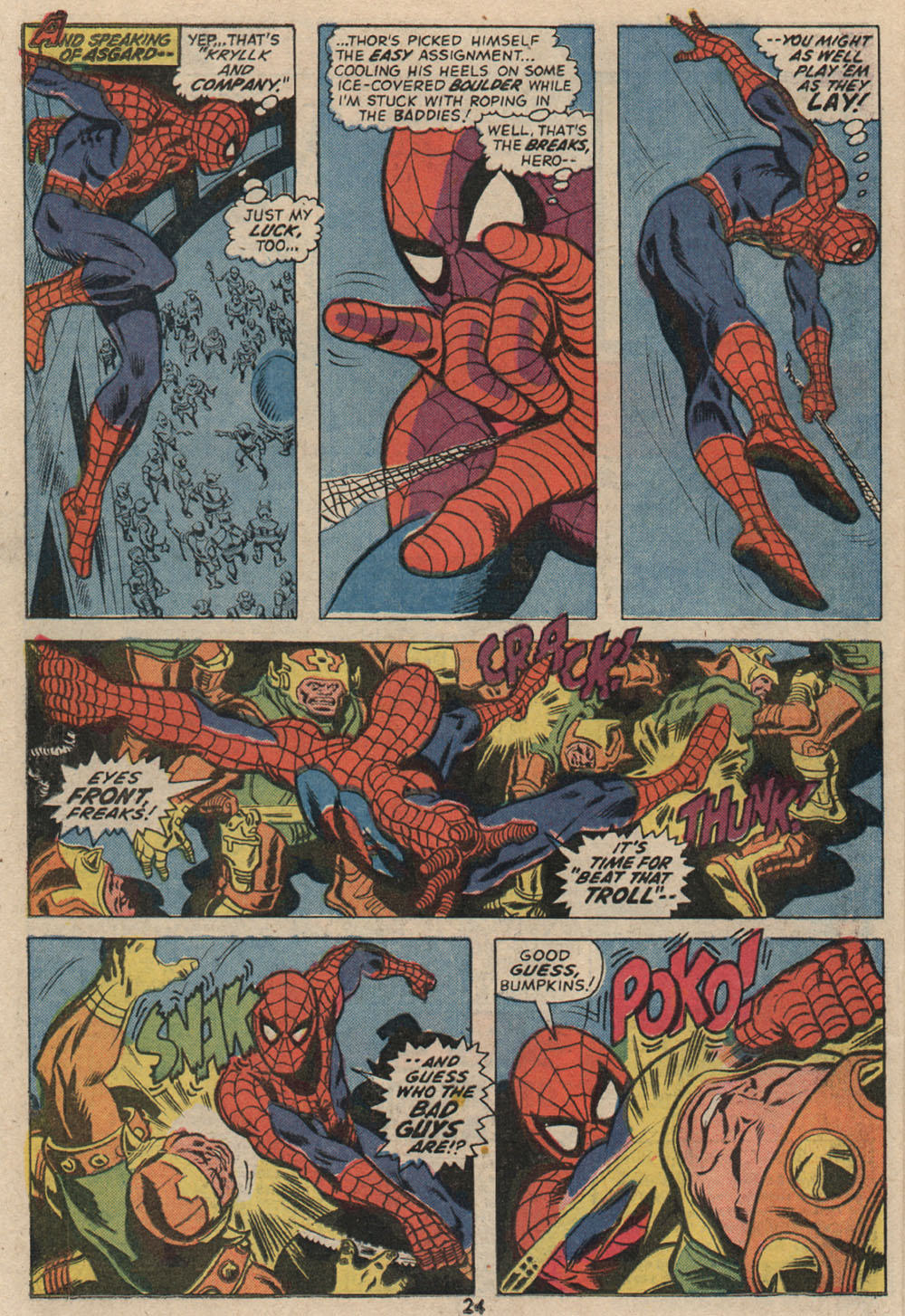 Spider-Man is many times is said to have the "proportionate strength of a spider." I don't know if spiders in the Marvel Universe are just way stronger then real world spiders (Science genius Peter Parker does imply at one point that spiders can lift hundreds of times their own body weight when real world spiders can only lift 50 times their body weight) but Spider-Man has feats far in excess of the strength of being able to lift 50 times his body weight. Starting off relatively tame, minutes after first gaining his power, Spider-Man could crush steel in his hands as though it were paper, tore a metal door off a helicopter in one of his first adventures, and has broken titanium wire before. He overpowered a robot arm that had the strength of 100 men. More fantastically, he was able to beat up Asgardian Trolls, one-shot a T-Rex, and was able to trade blows with a man whose physiology acted as though he had developed on Jupiter. He was able to superleap outside of a water tank and casually kick a solid concrete pillar at Shocker. And pillars are no joke, those things hold up bridges!