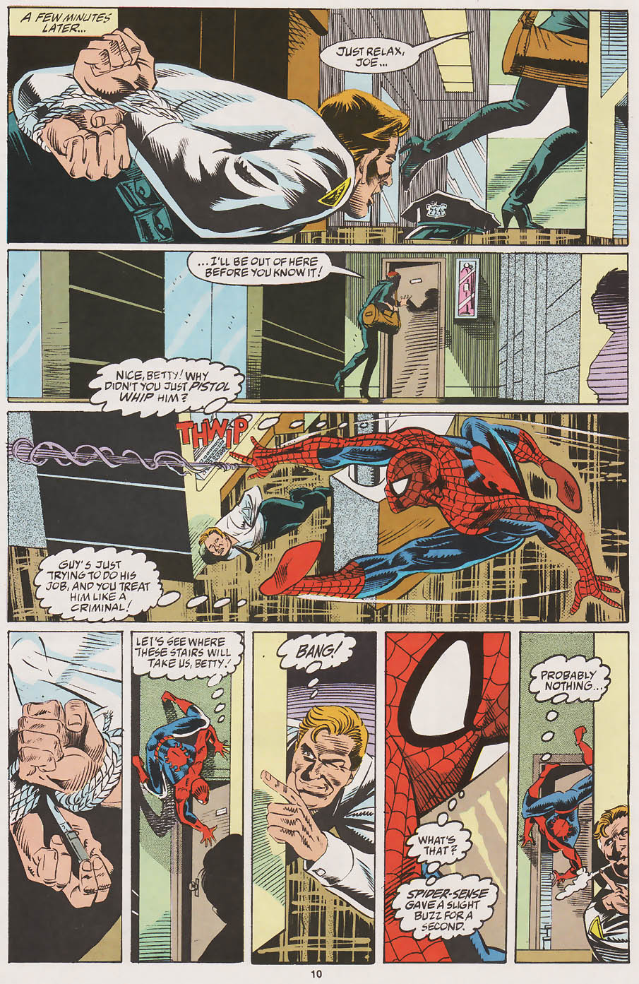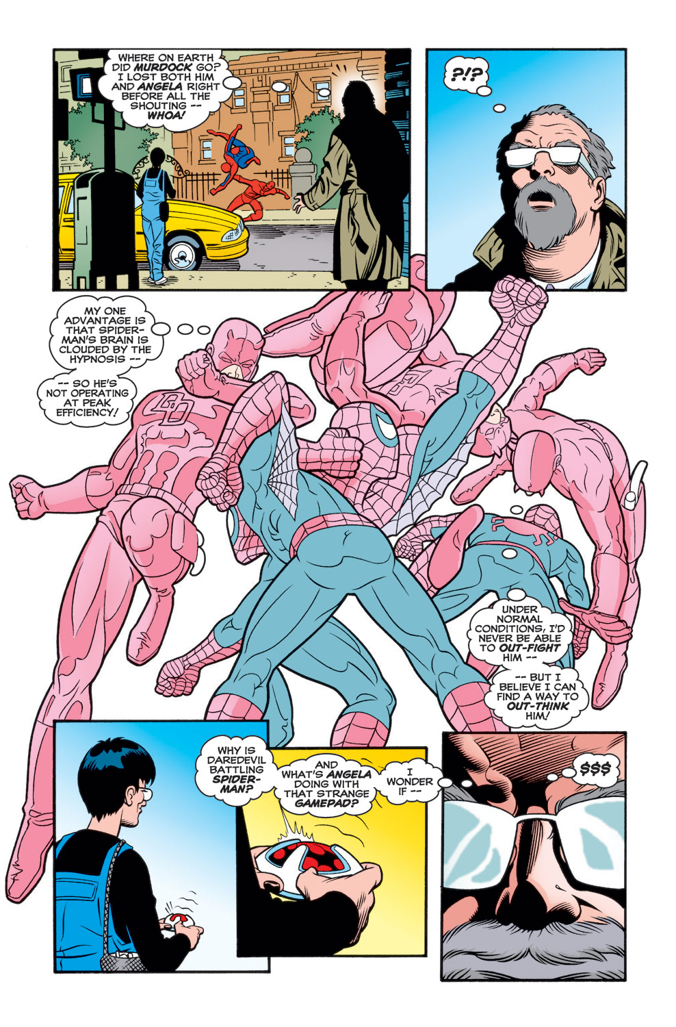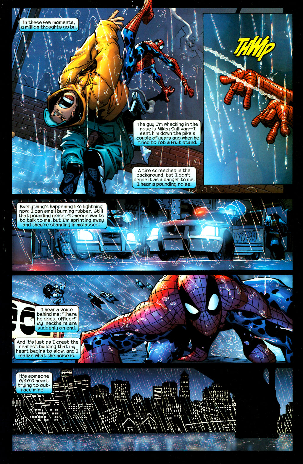 Beyond danger the Spider-Sense can be used as essentially aura-reading, detecting the presences of other living beings. Spider-Man is able to sense Vulture or Kraven just being in the same area as him regardless of the danger they currently pose. It can tell him when someone is watching him or no one is around. This sensing gives him a good sense of position. He sensed Morlun's approach, Mysterio waiting for him in a building, and Doctor Octopus being just beneath him on a plane. This sensing works on non-enemies as well. He sensed the presence of Hulk and Woodgod when neither were enemies, sensed Silk in a building and told him the room The Human Torch was in. He's even suggested that his spider-sense might be able to detect Flash Thompson who at the time was just a civilian. It also acts as a literal aura-reading, sensing an evil presence (and has also sensed evil and hostility), detecting an aura of death and decay and sensing Doctor Strange's astral form. This aura reading also means his spider-sense can and has given him information about people around him. His spider-sense can read someone's intent allowing him to do things like sense that two men are thieves or sense the Chameleon trying to escape despite his disguise. No disguise can fool the spider-sense! The spider-sense can sense danger to other people, even sensing danger to Aunt May from a distant part of the city. Peter also knew Aunt May wasn't dead or he would have sensed it. He even sensed danger to the nullifier, a piece of technology. His spider-sense told him someone was suspicious, possibly told him that Jonah's son was too dangerous to be left at large and informed him of Sandman's transformation into his rock hard state. He also thought his spider-sense would give a sense of vague uneasiness around the Human Torch even when he wasn't in his flame on state presumably reacting to his potential to become danger.