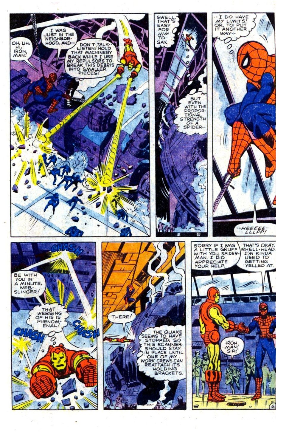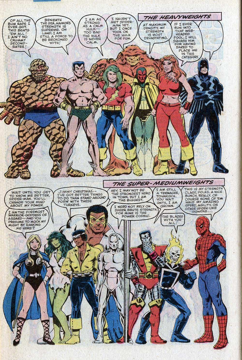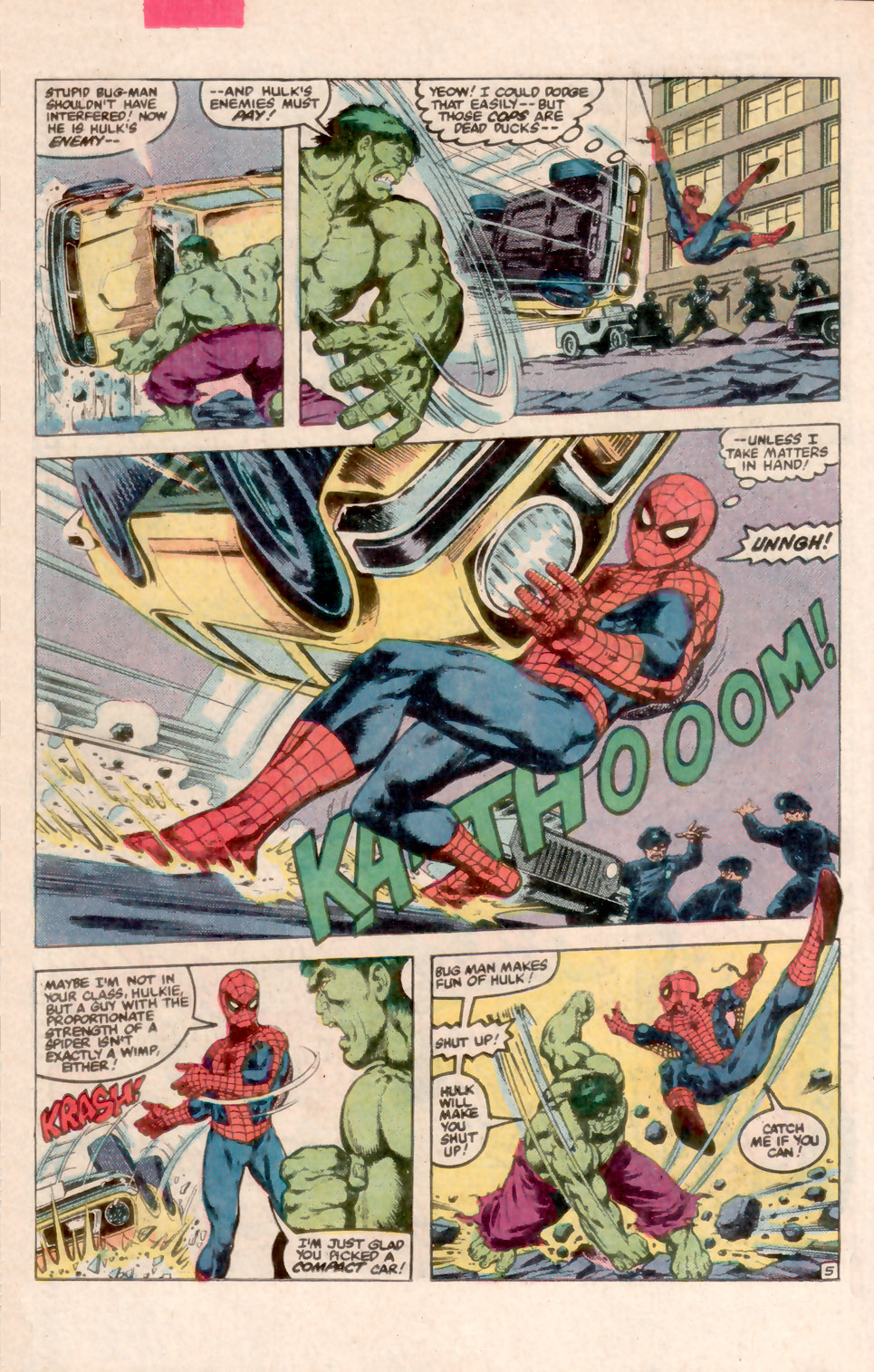 Spider-Man's most famous feat of this league comes from Marvel Team-Up Annual 2. Two antimatter spheres were drawn together and if they reach were going to annihilate the earth. To save the Earth, Hulk is brought out to hold the two apart but even for him the effort is exhausting him and the Jade Giant punches one far into space. Spidey, science major that he is, guesses correctly the attractive force will draw the other one at the same speed towards Hulk and wanting to save his big green friend, presses himself and Hulk with enough strength to move them both out of the way. This whole climax happens over one page. Moving both the Hulk and himself at such a quick speed has been calced at taking likely a bit over 1 kiloton.