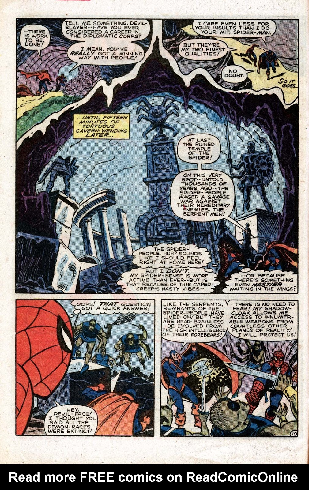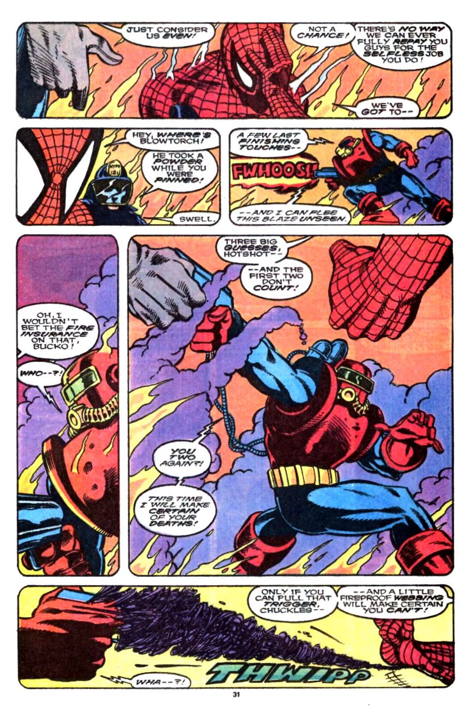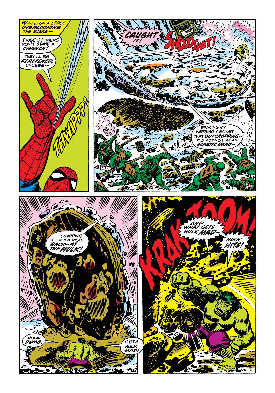 Spider-Man's most famous feat of this league comes from Marvel Team-Up Annual 2. Two antimatter spheres were drawn together and if they reach were going to annihilate the earth. To save the Earth, Hulk is brought out to hold the two apart but even for him the effort is exhausting him and the Jade Giant punches one far into space. Spidey, science major that he is, guesses correctly the attractive force will draw the other one at the same speed towards Hulk and wanting to save his big green friend, presses himself and Hulk with enough strength to move them both out of the way. This whole climax happens over one page. Moving both the Hulk and himself at such a quick speed has been calced at taking likely a bit over 1 kiloton.