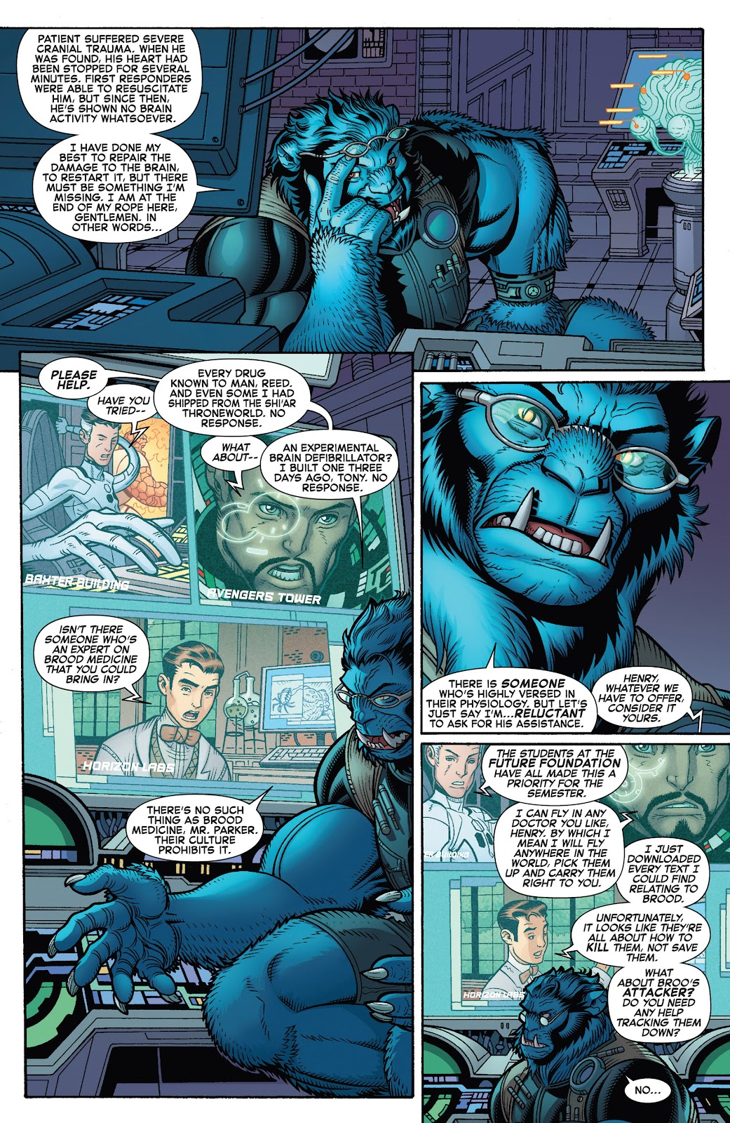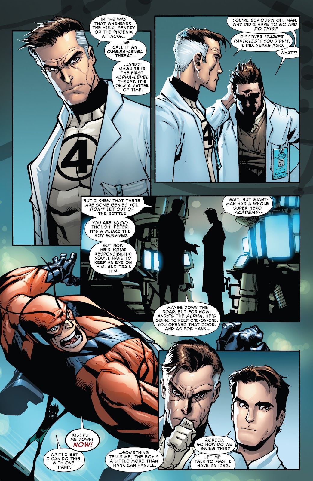 Spider-Man's specialty is biological/chemical science and Reed has said he's envious of Peter's level of biological knowledge when Peter found the answer to a problem before Reed. Peter was on a council of the smartest minds of Earth trying to find a cure for an alien virus threatening the world. Peter was the first one to find the key to solving it. Similarly Spider-Man solved in minutes a disease that had already taken people years of research trying to fix and invented a cure for a disease that turns people into werewolves. A teenage Spider-Man was able to beat Doctor Octopus's prepped technology and leave him breaking down crying over his defeat in 15 minutes using a $5 chemistry set. He's created a cure for the lizard and was even able to do the same in minutes at most, cured and depowered Electro, and reversed the mutation of an experimental cure for Morbius. He invented self-replicating nanites that prevented Norman from changing into the Green Goblin and a chemical compound that fused Doctor Octopus' arms together. He's also on numerous ocassions figured out someone's powerset after just one encounter.