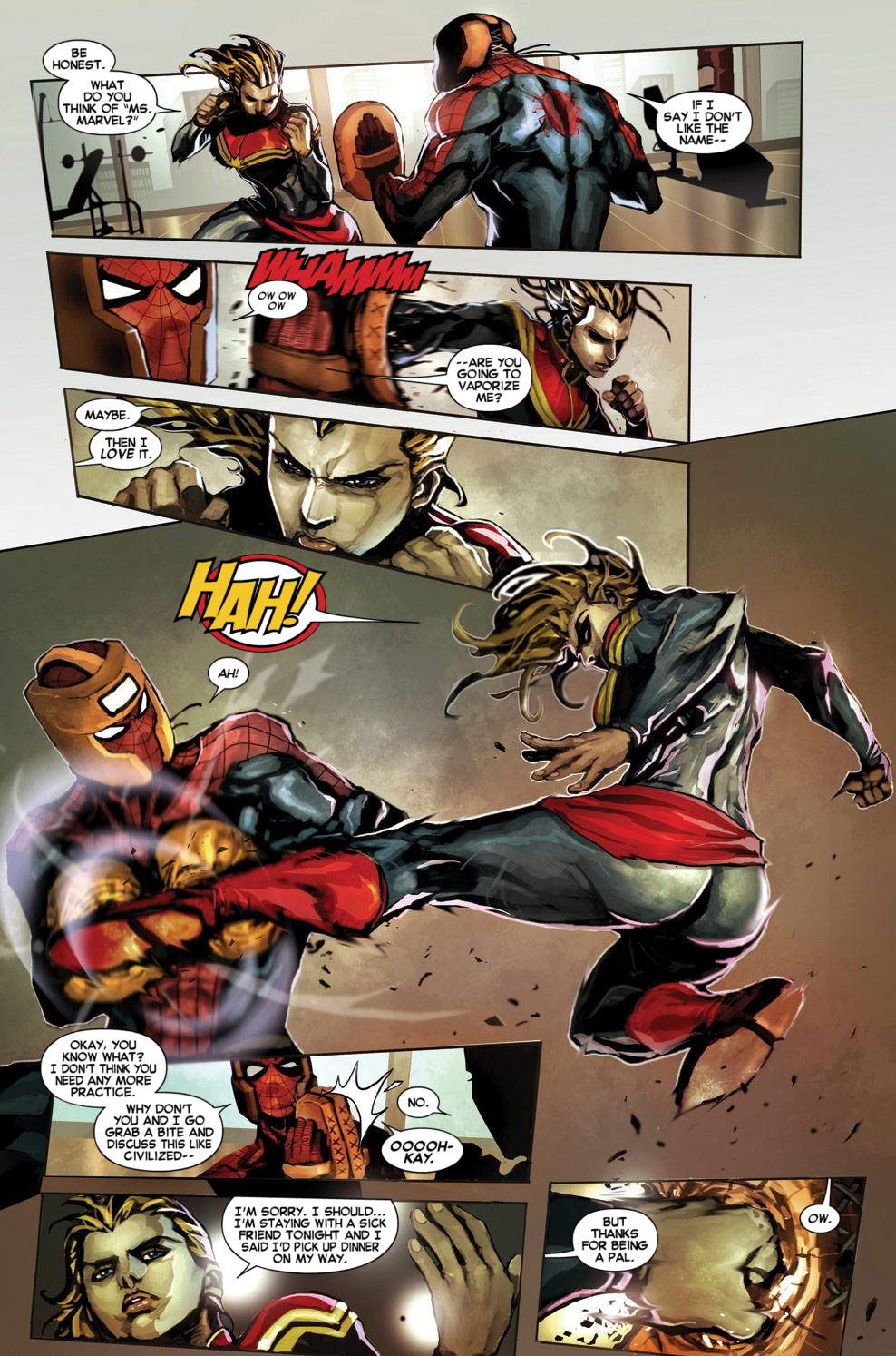Spider-Man also kept up with the greatest speed of the original Captain Marvel though I can't find any notable speed feats for the original Captain Marvel outside of bullet-timing. That said, Peter also has scaling to Carol. He's dodged a barrage of attacks from her, disappeared from her sight, and blocked a melee attack from her during intense sparring. Carol scales to Rogue whom she took the powers of (which is consistent as Rogue shouldn't be massively faster the the other X-Men, who Spider-Man outsped numerous of earlier on) and Rogue traveled the Earth-Moon distance in a short time, likely seconds, which would get a speed above 1% the speed of light.