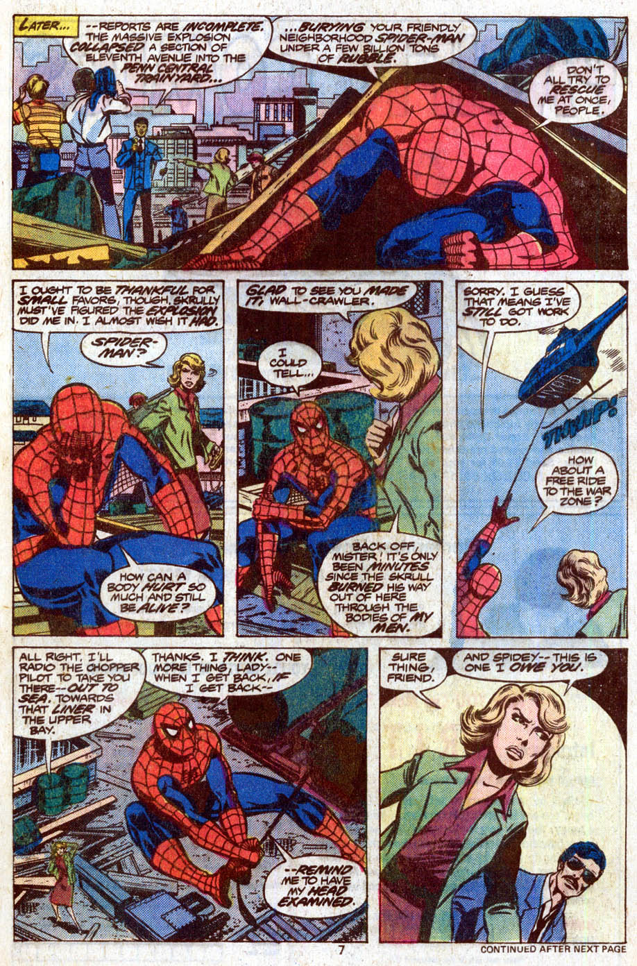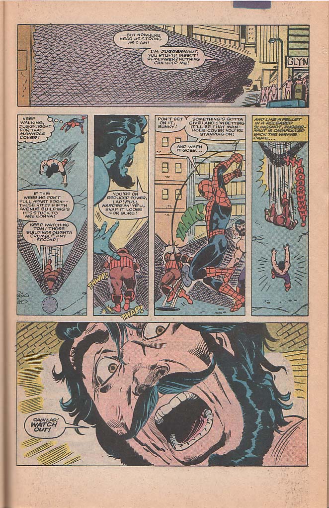 Many of the above strength feats also qualify for durability feats as they involve him both dishing out and taking attacks. Spider-Man is obviously durable to the point that some low-end outliers aside normal people simply aren't a credible threat to him. A normal human striking his face would just break their own fist and in old comics Spider-Man could allow normal humans to beat on him just so that he could relax and regain his energy as they did so little damage. He was even able to regain energy by taking attacks against metahumans you would think could harm him. Spider-Man has survived being thrown half a mile by the Lizard and a FULL mile by the Hulk and speaking of feats that sound impressive but don't actually mean very much, Spider-Man has taken the force of an average earthquake. Earthquakes are actually happening all the time, it's just that most are too weak to be felt meaning an average would only be likely megajoules of energy, if that. I get the feeling the feat was supposed to be more impressive given the context but I don't like arguments from authorial intent since I view that as ultimately unknowable. Also it's implied that issue may have been a dream. It's left deliberately ambigious. Oh and while this isn't a hugely impressive feat, Spider-Man withstood being tortured and crucified because comics are nothing if not subtle.