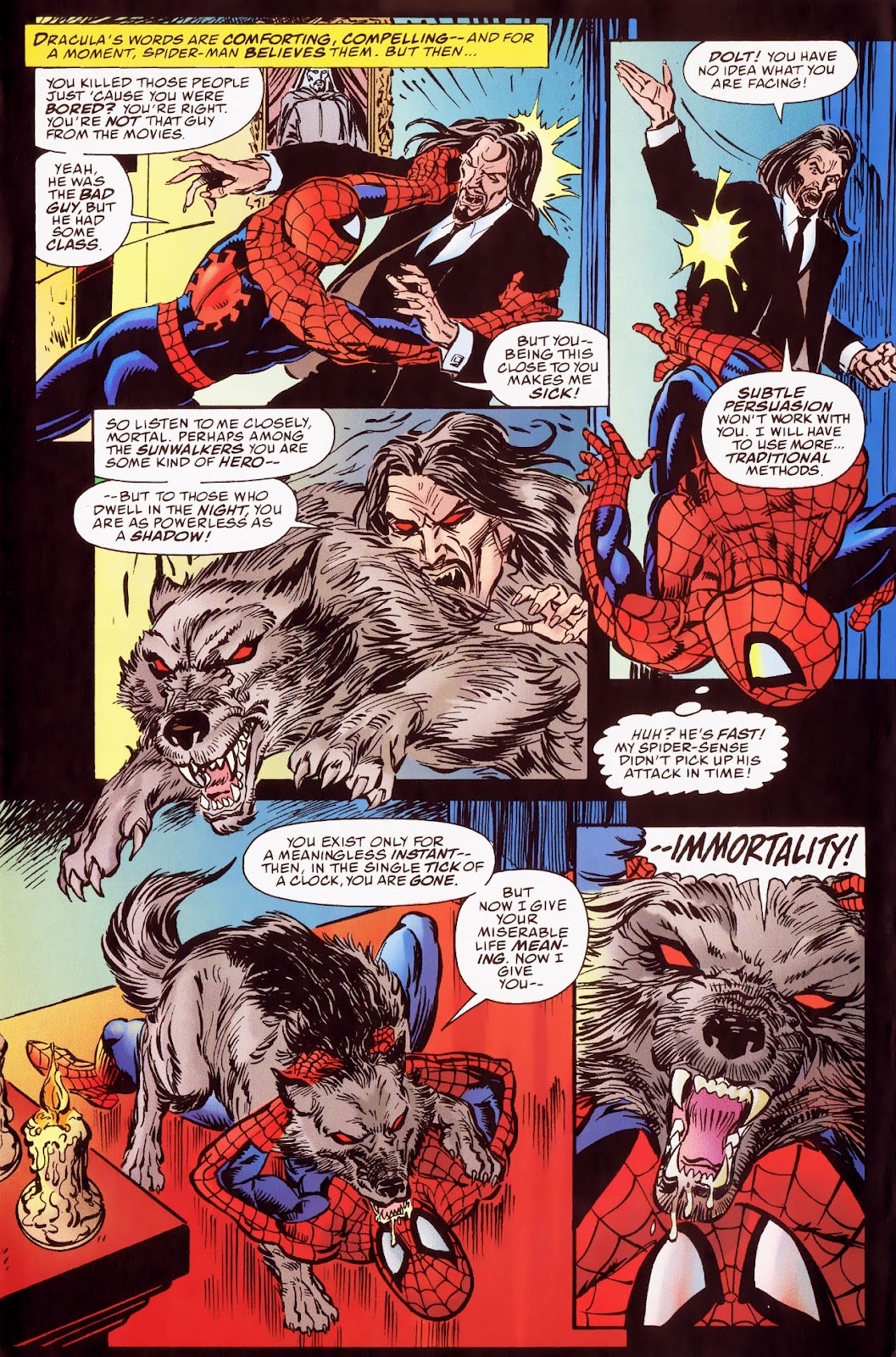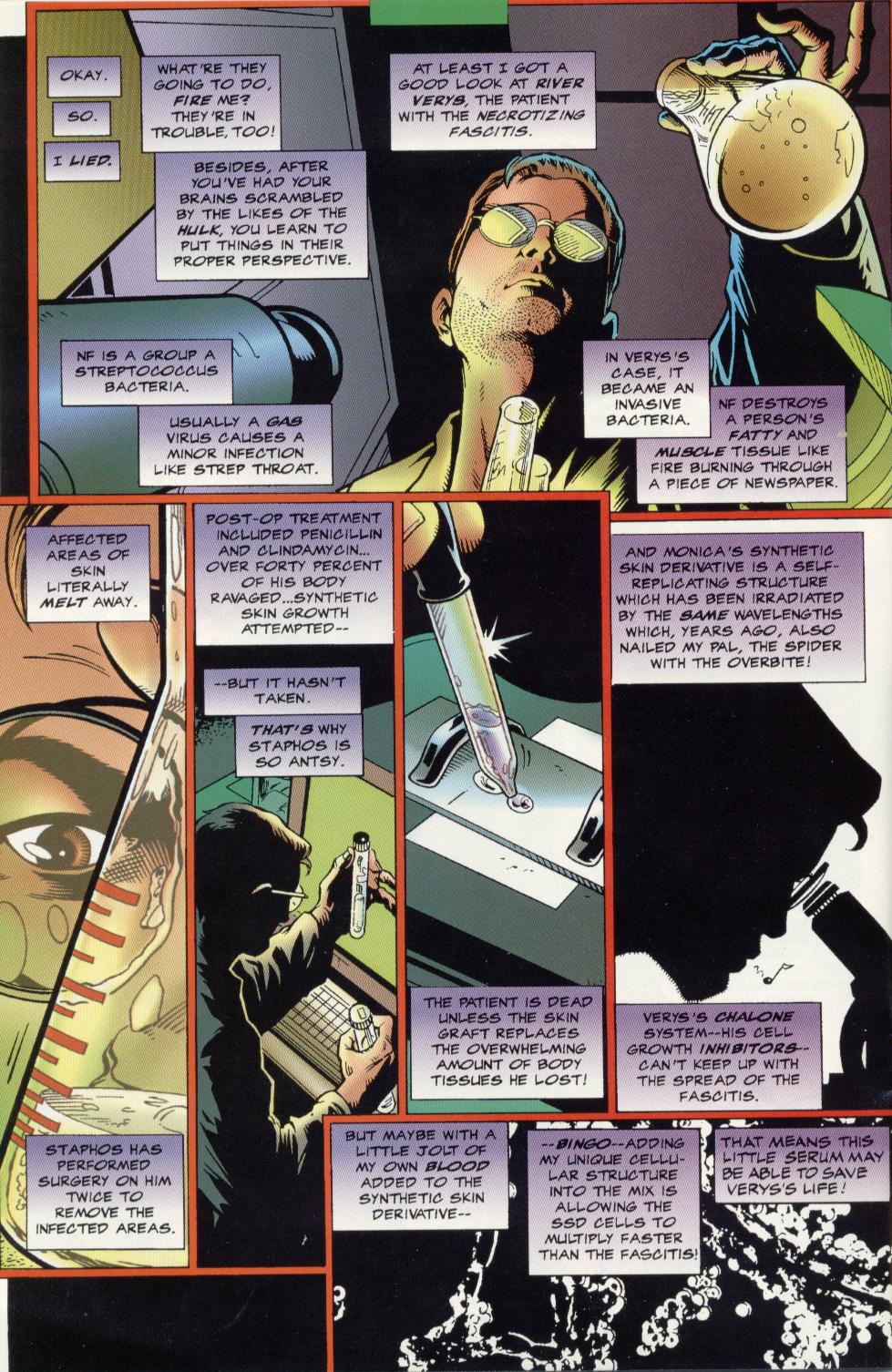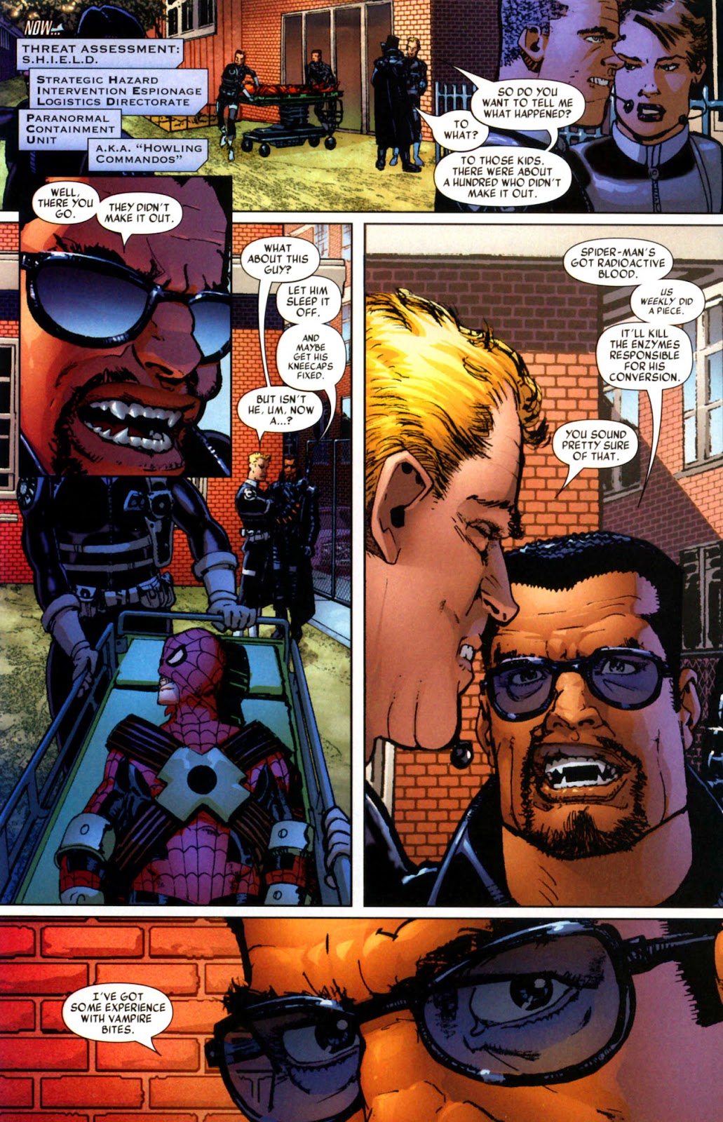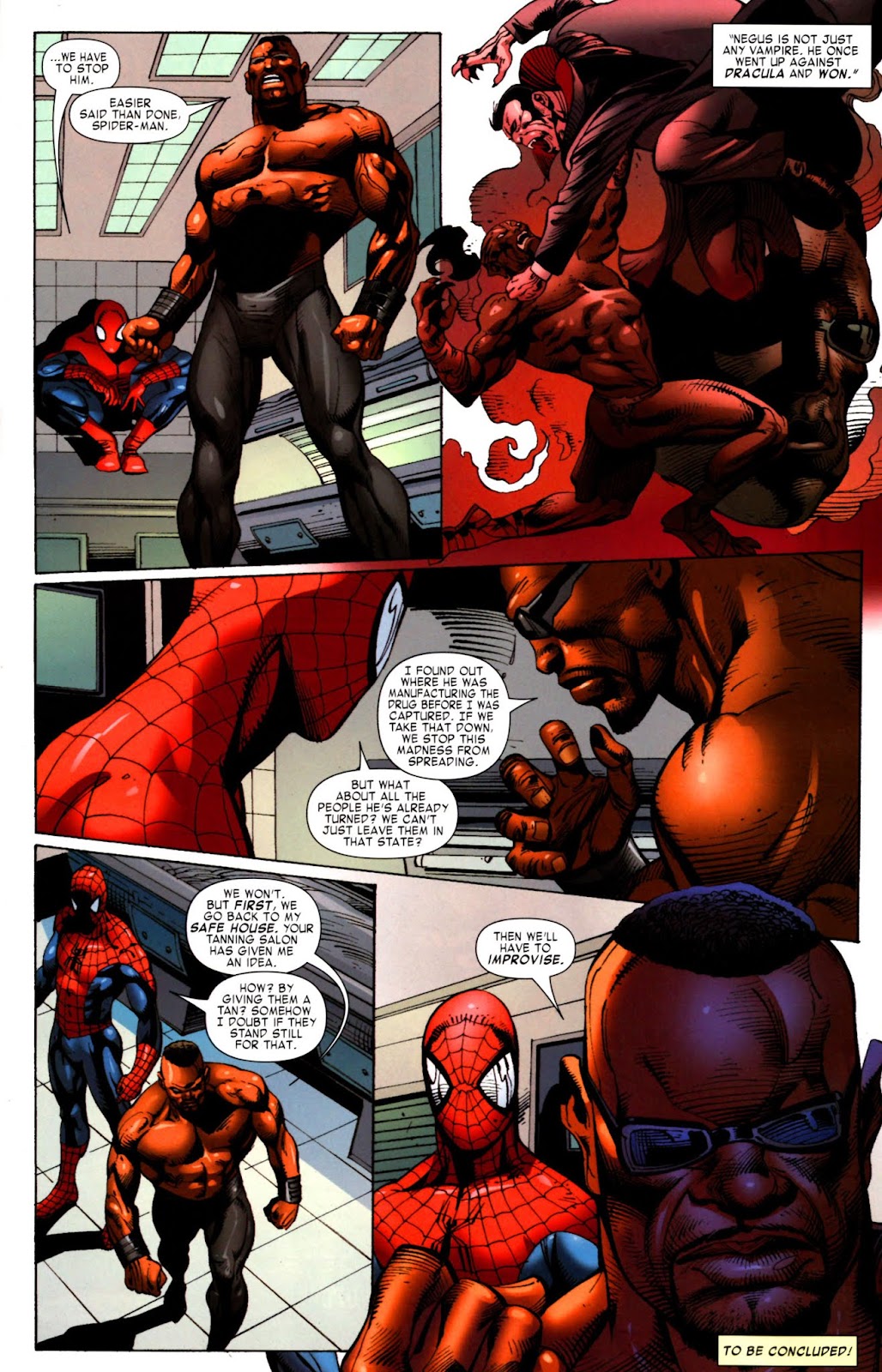 Spider-Man's biology was signfigantly altered via the magical spider's infecting his dormant m-gene. This sometimes pops up in strange biological abilities and resistances to biological abilities. For instance Spider-Man's blood, as his theme song goes, is radioactive blood. This of course means when a vampire tries to drink his blood it obviously kills them.....or turns them into a human. I guess that works too. It's actually a consistent point that Spider-Man's radioactive blood somehow cures vampirism. Also an intelligence and durability feat but in Spider-Man's first confrontation with Morlun he defeated the Inheritor by injecting himself with massive radiation to mess up Morlun's lifeforce absorption. He should have a similar radiation resistance to Silk who with high difficulty could survive for a time on a post-apocalyptic irradiated world. Spider-Man has, in addition to resistance to radiation, a resistance to poisons. He was able to push through a poison that was supposed to kill him via resistance and willpower and has an explictly superhuman poison resistance. He also survived enough drugs to kill an elephant. Similarly he was able to survive being submerged into a powerful acid, if barely.