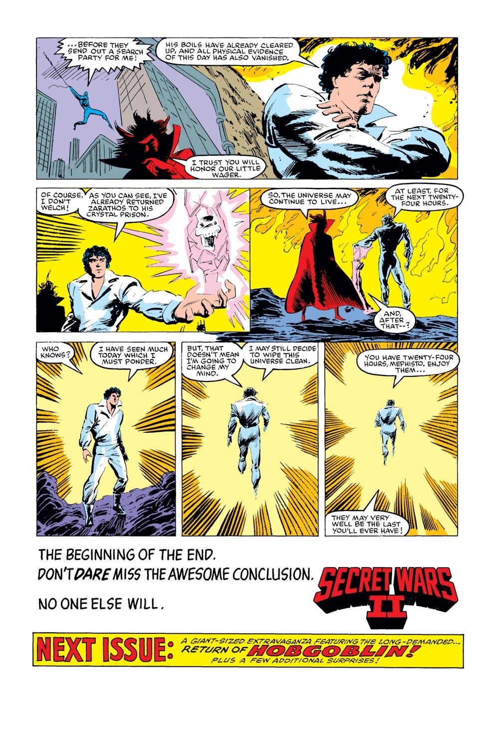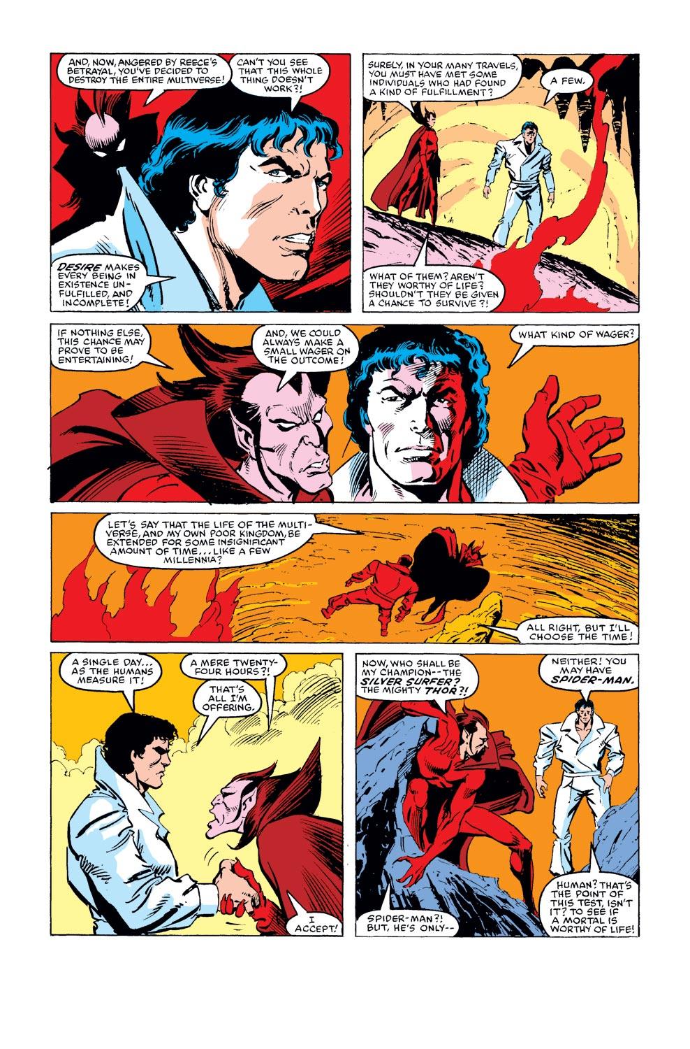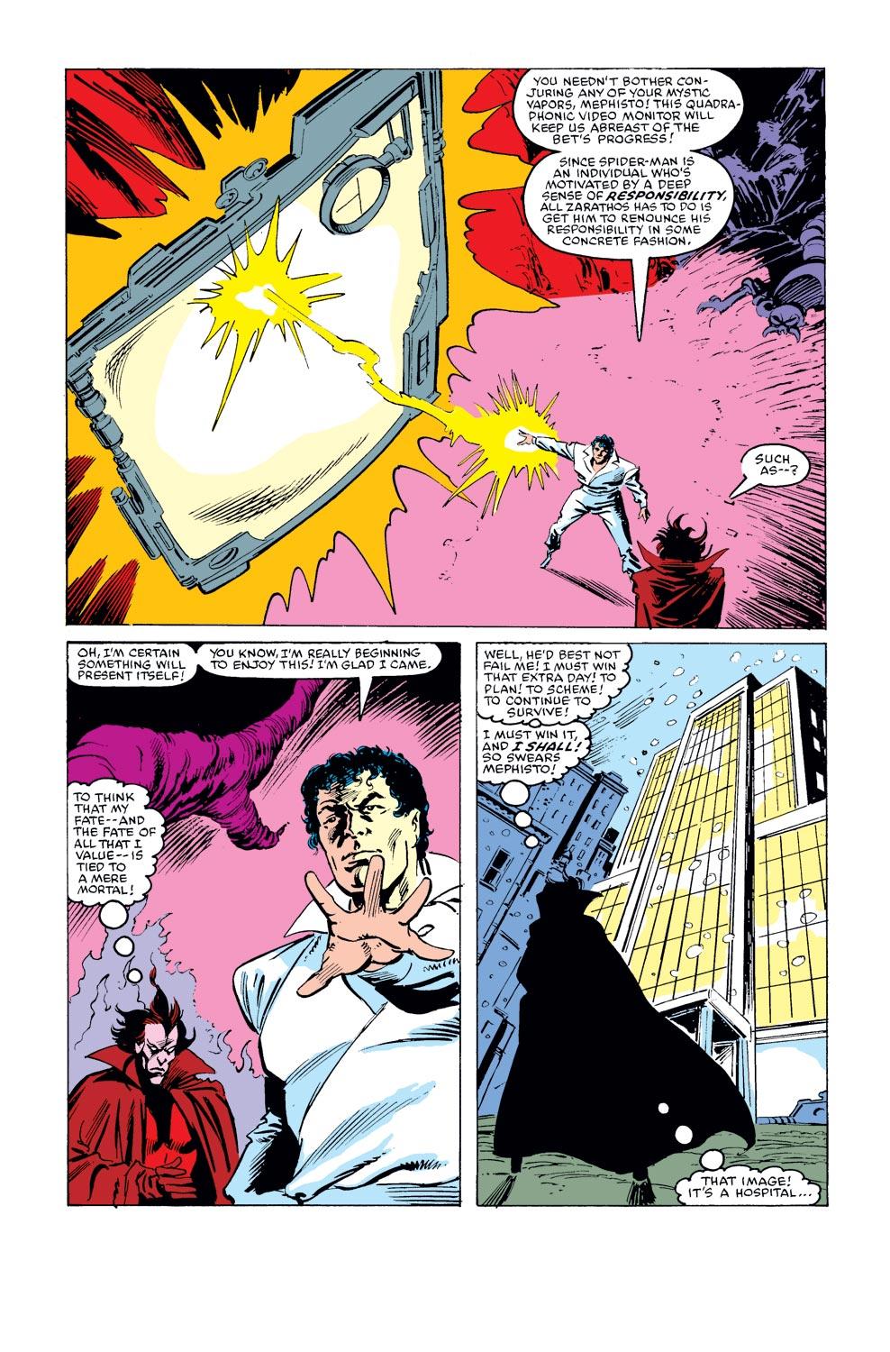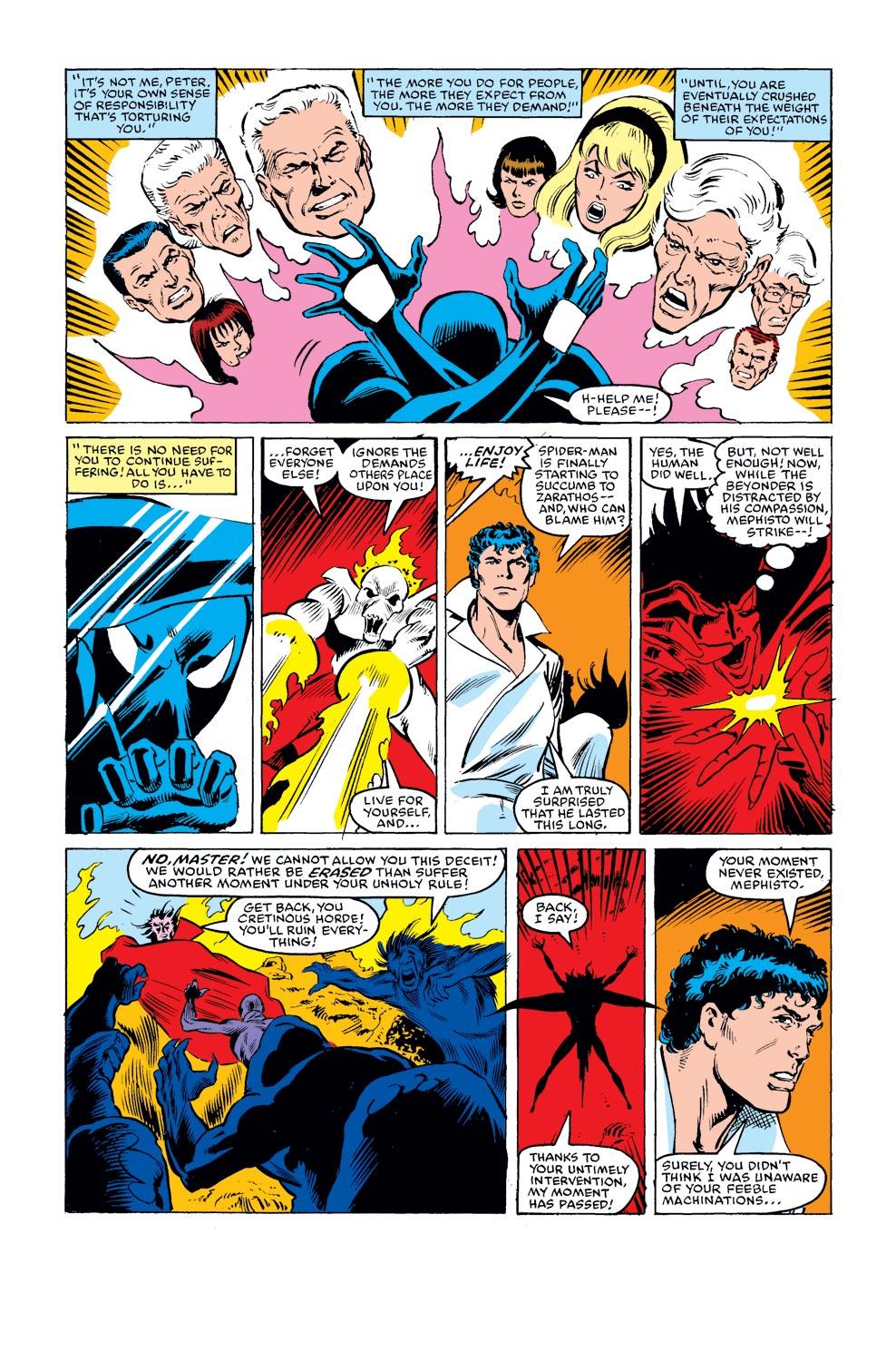 On another occasion, during The Amazing Spider-Man Issue 274: "The Soul of the Spider" the Beyonder, a god like being who at the time was nearly supreme in Marvel planned to destroy all of existence and in a desperate gamble Mephisto made a bet with him over Spider-Man. The Beyonder awoke Zarathos, the living spirit of vengeance associated with Ghost Rider and stated that if Zarathos' torment could make Spider-Man renounce his responsibility within the alloted time he would then destroy everything. Mephisto tried to trick Beyonder however Beyonder was supremely aware and easily outplayed Mephisto. However to the shock of all 3 cosmic beings; Mephisto, Zarathos and the supremely aware Beyonder, Spider-Man would not renounce his responsibility and fought through the torment of Zarathos winning the bet and saving the multiverse. Spider-Man's will was so strong that it defied the expectatons and awareness of even the Beyonder at his strongest. However even this is not his best feat. For that I will need to show the greatest feat of Spider-Man and the strongest he has ever been.