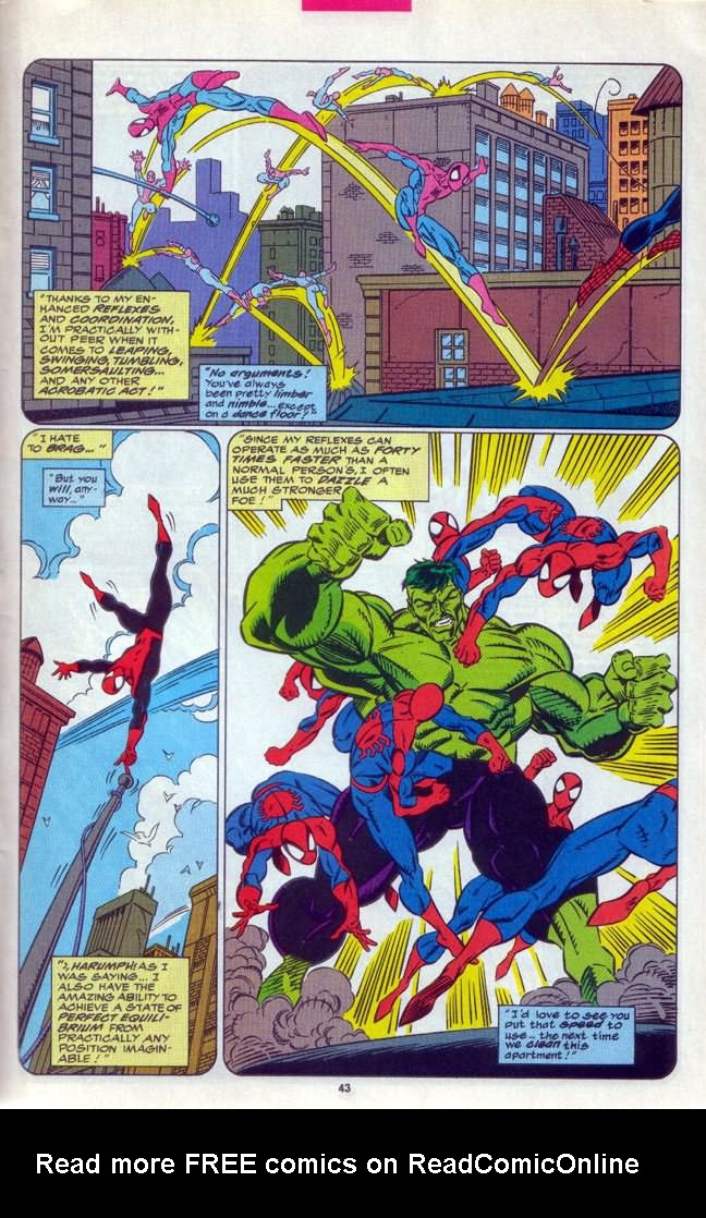 Spider-Man compliments his speed with his incredible agility and mobility. He's been said to have superhuman agility since very early in his career with the ability in his very first appearence to walk down a cable as easily as a spider glides down it's own web. Spider-Man is practically without peer in acrobatics and his balance and agility are second to none. He has been stated to move with inhuman grace and to move as fluidly as Quicksilver.