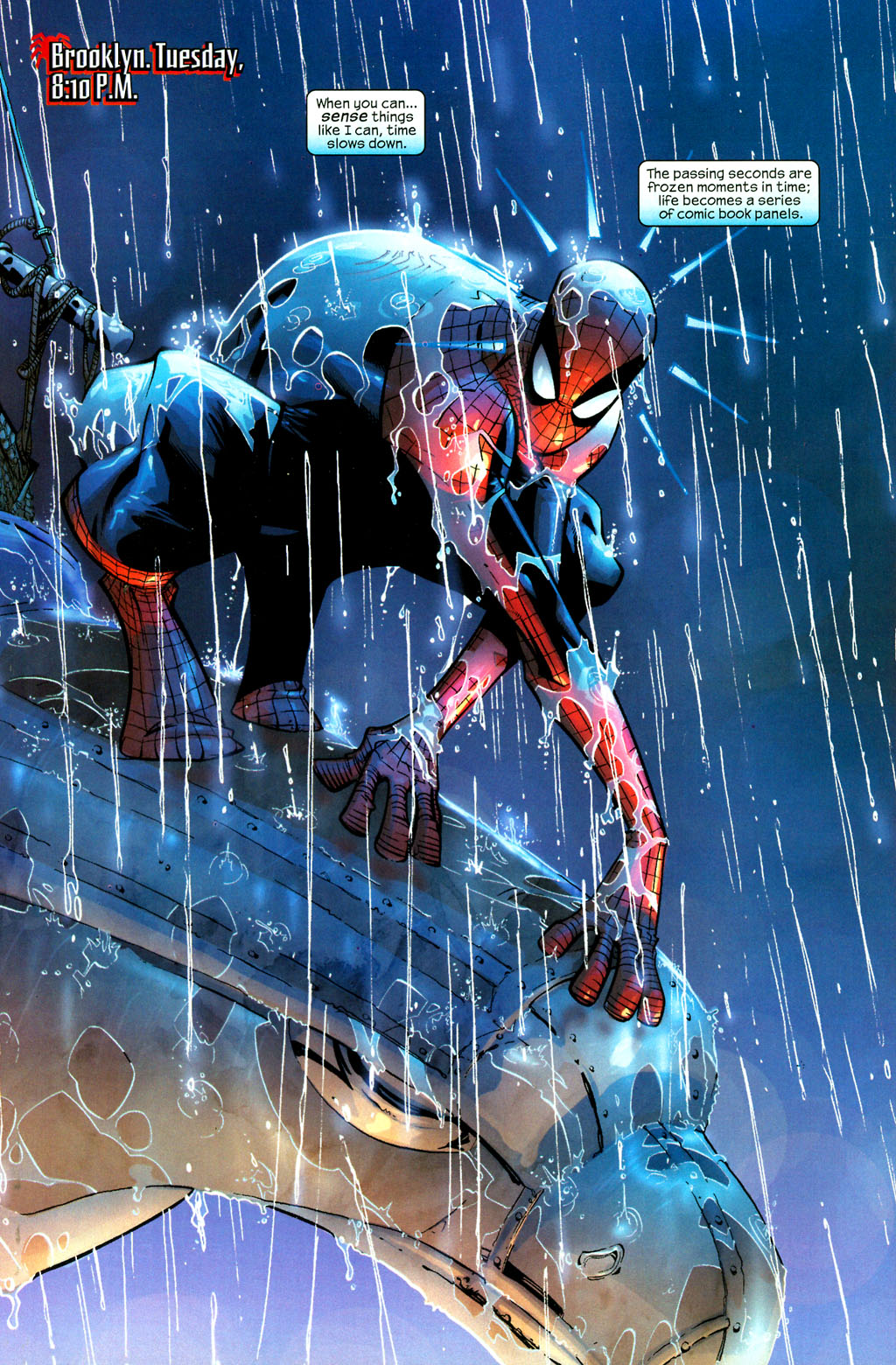 Spider-Man's incredible ability to avoid attacks is partially derived from perhaps his most iconic ability, the spider-sense. The spider-sense is essentially a form of precognition....his most amazing ability it tells hims the exact direction and potency of all dangers. With it, Spider-Man doesn't need to see as it guides him unerringly. It was originally stated it does this by picking up on "odd electronic impulses". Recent revelations are that the arachnofreqeuncy (technical term) works by sending a message through the "web of life and destiny", a 5 dimensional structure extending down into 3 dimensions extending across the multiverse woven by the spider-deities, and is stated to be life and destiny itself. The distortions across it are likely the electronical signals picked by the Spider-Sense. The Spider-Sense grants Spider-Man a supernatural sense of spacetime, energy and electricity and it makes sense those are connected as electrical charges are just one of the most common form of energy and spacetime does not have a seperate existence from matter-energy which cause the distortions of spacetime we call gravity. The spider-sense guides Spider-Man in combat, telling him which strategies are good and which are bad. Spider-Man has gotten better at discerning what it's telling him over time. The tingling Spider-Man get modulates with the level of danger present to give him a sense of the potency of danger. This sense can extend into the future allowing him to dodge blows before they have even been thrown. If Spider-Man really needs to focus he can also turn off his spider-sense. Regardless of whether he turns it off or an enemy does, the spider-sense eventually regenerates. Spider-Man doesn't even need to be aware to use it, for it will trigger even in his sleep. Spider-Man has also been shown to occassionally foretell the future in his dreams, which I am guessing is his Spider-Sense trigging in his sleep.