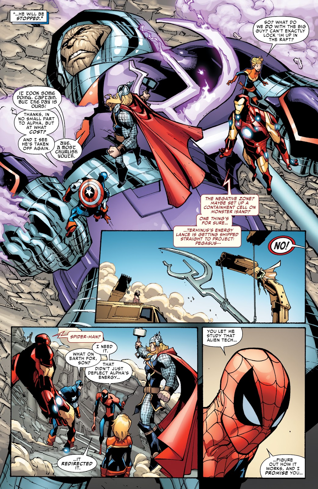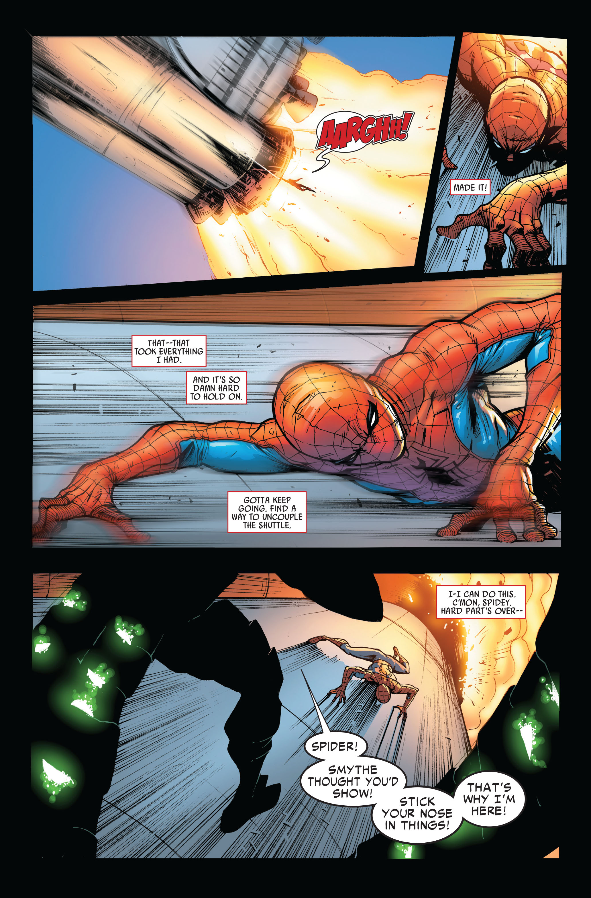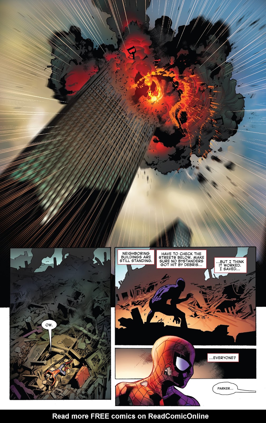 Moving onto more concrete feats Spider-Man has survived falling from orbit in a web ball. This was with his armor though he survived an explosion that destroyed a web cocoon in his base state and his cocoon also survived falling from orbit. The explosion he survived that destroyed his web cocoon would have taken out the neighboring buildings. He has "been hit by an unhealthy amount of trains in (his) time" and been buried under a few billion tons of rubble (potentially hyperbole) as well as survived having his mass multipled by 10 and being crushed under the foot of the building sized Goliath. Spider-Man has other building feats as well such as having nothing broken when he was crushed under half of a ten story building collapsing on him and surviving Graviton literally dropping a building on him. He was caught in this massively violent part of a building exploding and survived, survived getting caught in a warehouse explosion and one time when he was poisoned and heavily weakened from a fight with The Lizard he got caught in this monsterous building explosion and survived.