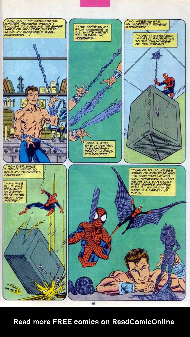 Spider-Man obviously carries his web shooters on his wrists and also carries on his utility belt his spare web cartridges. It's possibly this is how he carries multiple types of webs. Spider-Man also had on his belt a light with his face insignia he would shine in to intimidate criminals. He doesn't use it very often these days, though he does occasionally take it out, particularly when he needs an area to be illumintated. More recently Spider-Man had a chip implanted in his brain that is supposed to block neural interference however it doesn't work too well.