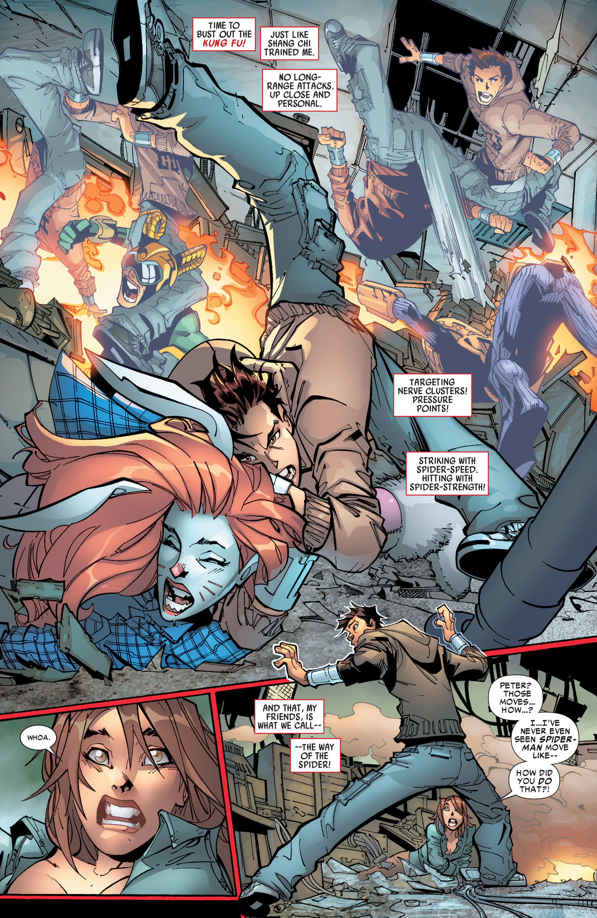 Captain America taught him to focus his chi and proactively plan in combat instead of relying on the instincts of the spider. He also trained under Shang Chi to develop his own martial art "the way of the spider" that takes advantage of his abilities and would train under him for weeks until he could consistently spar with Shang Chi going beyond hunter and spider and becoming the fight itself. Post-training Spider-Man now has a superhuman level of skill. He can consistently and casually beat people who also have spider-powers via skill. He's beaten people who had his spider-powers and his spider-sense while he didn't have spider-sense via martial arts (also notes he knows nerve strikes and pressure points). For his final test from Shangi Chi, Spider-Man had to and succeded at fighting Madame Web with the way of the spider despite the fact that he had no spider-sense and she had the same powers as him, spider-sense and precognition. Bear in mind that Madame Web's precognition is strong enough to see every event that would happen in Spider-Man's life if he made a certain decision. He also got into a fight with Tarantula, an amped form of Kaine, a stronger Spider-Man clone that also was the other and likely thus had the other upgrade, an upgrade that allowed him in One More Day to physically fight with Iron Man and break his armor and allowed Kaine to kill the strongest of the inheritors Solus, stronger then Daemos who is like Morlus times 10. During this fight against Tarantula, Spider-Man's spider-sense regenerates and he was able to immediatly seamlessly merge it with his martial arts training and defeat Tarantula. He was also able to beat up a bunch of Hydra agents with no powers.